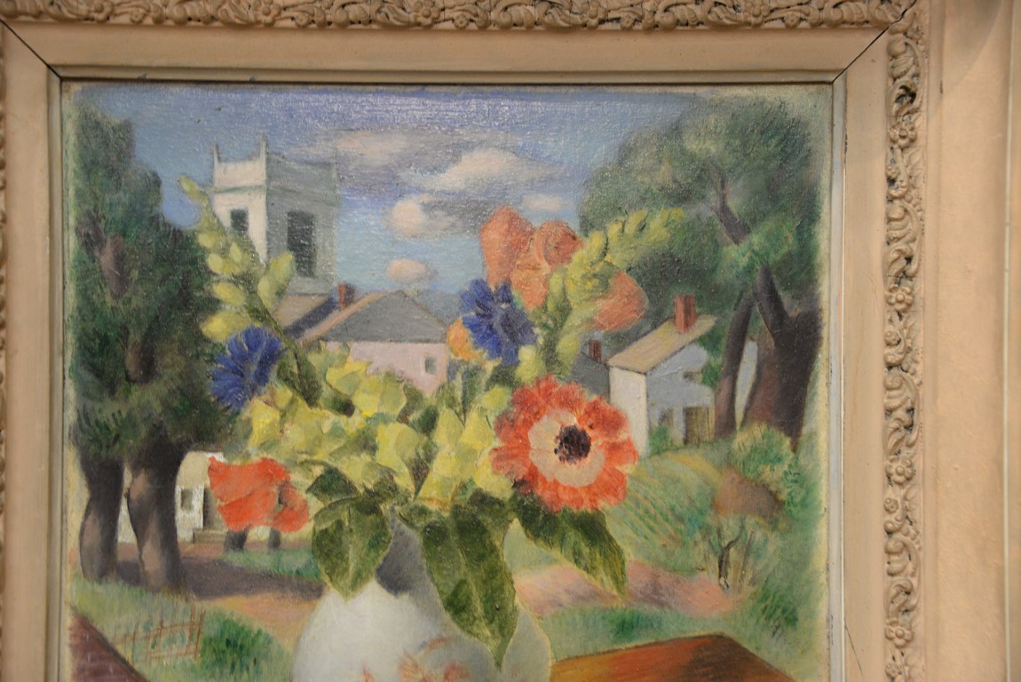 Simka Simkhovitch 1893-1949 Still Life of Flowers with Town in background oil on artist board signed and dated lower right: Simka Simkhovitch 1933 13 x 11 Provenance: The Estate of Natalie Rafferty