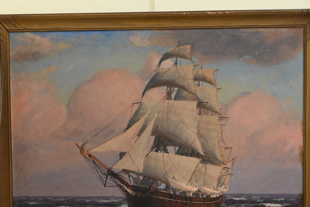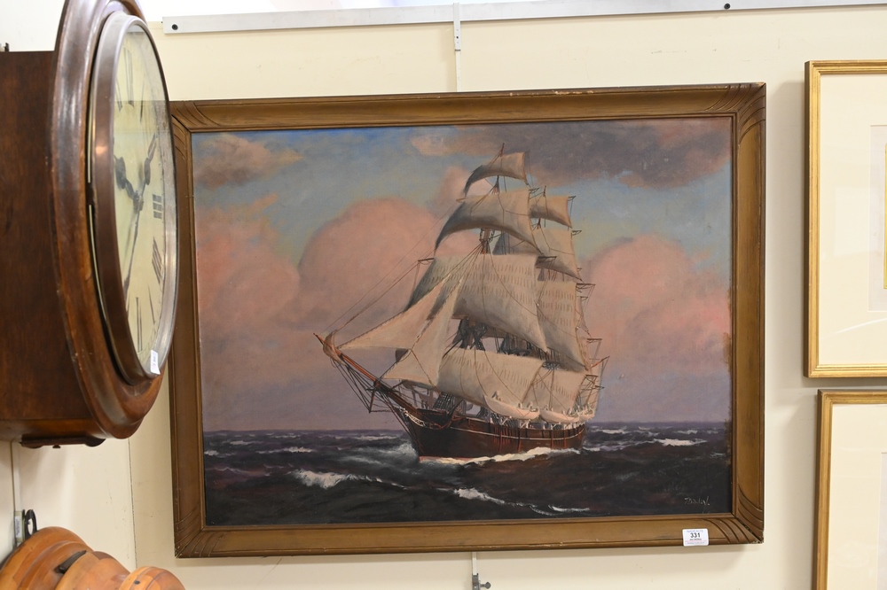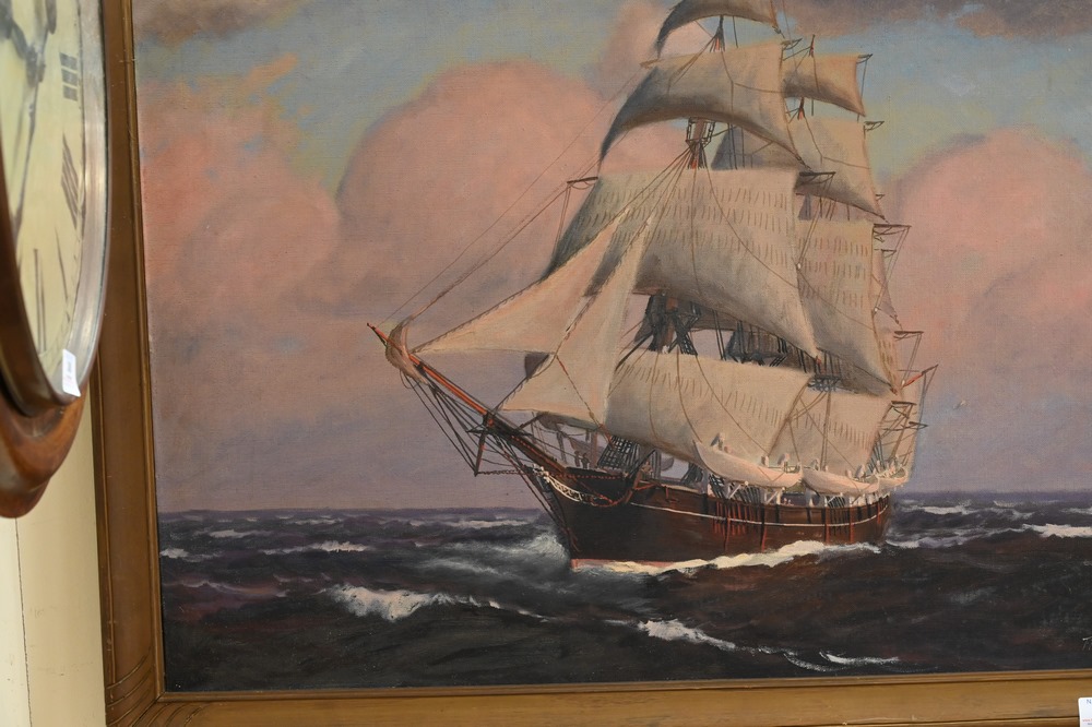 Lot 331: T. Bailey, sailing ship, oil on canvas, 19th/20th century, signed lower right T. Bailey, 24 x 32 inches.