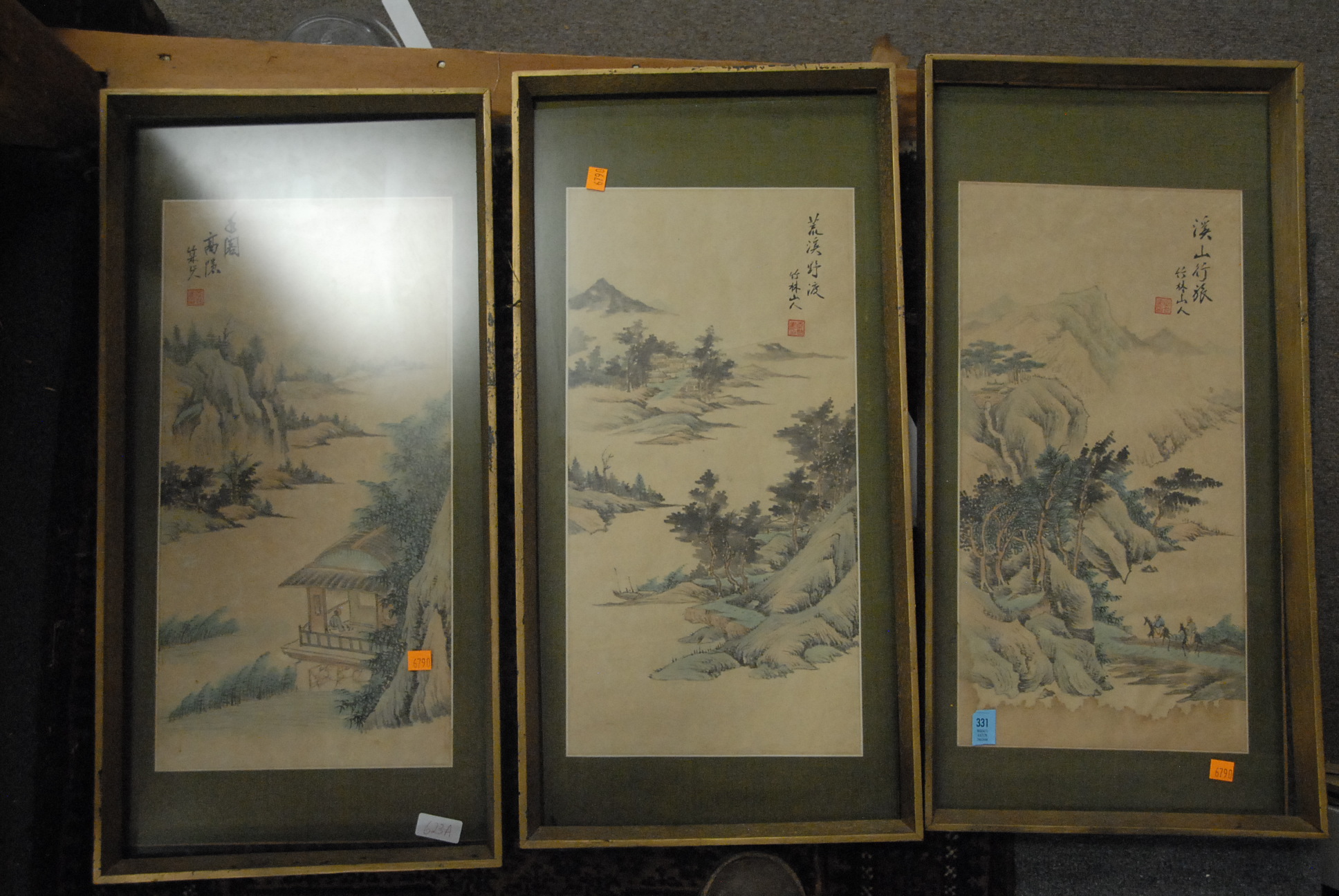Three Oriental watercolor on paper framed landscapes. sight size: 19 1/2 x 10