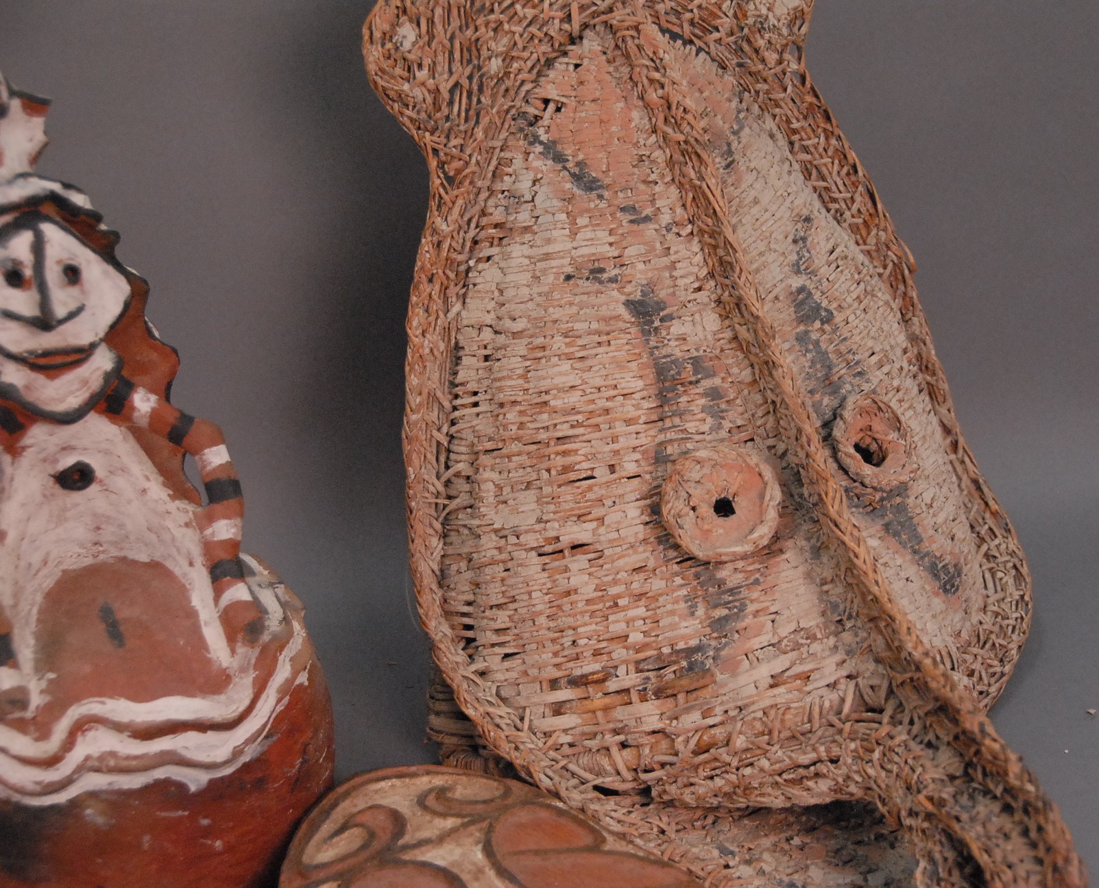 Three piece lot pottery South American figure, wicker mask, and wooden shield.