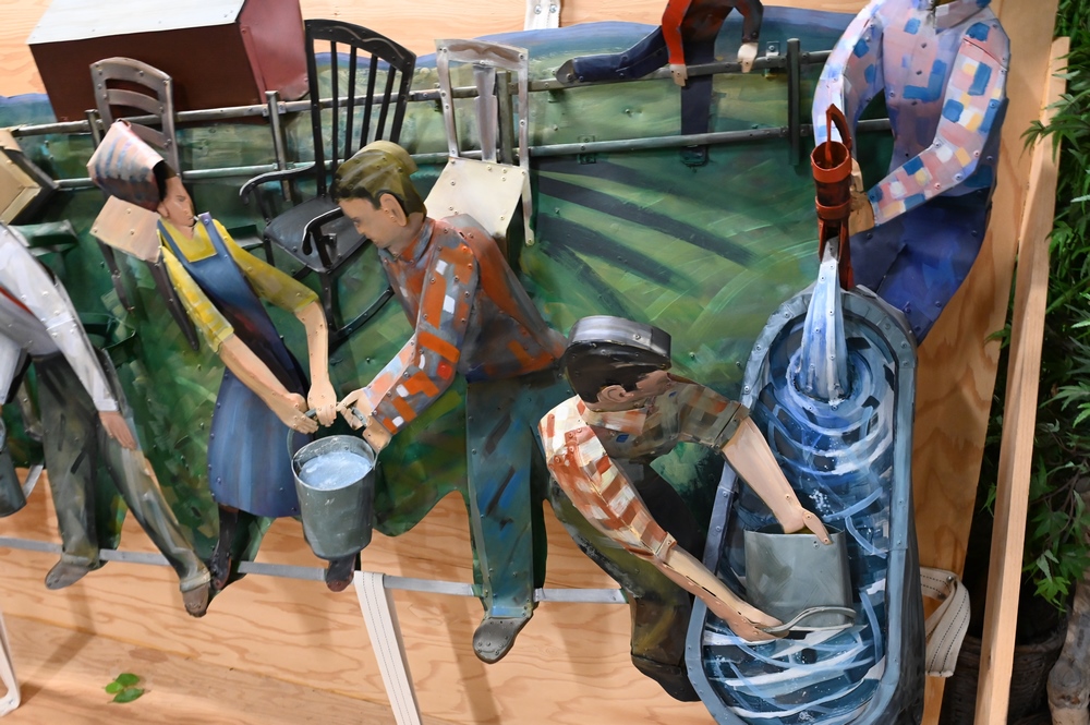 Lot 331: Timothy Woodman (American, 1952 – 2018), Bucket Bridge 1986, oil on aluminum, overall 56″ x 95″ x 20 1/2″, signed, dated and titled on back.