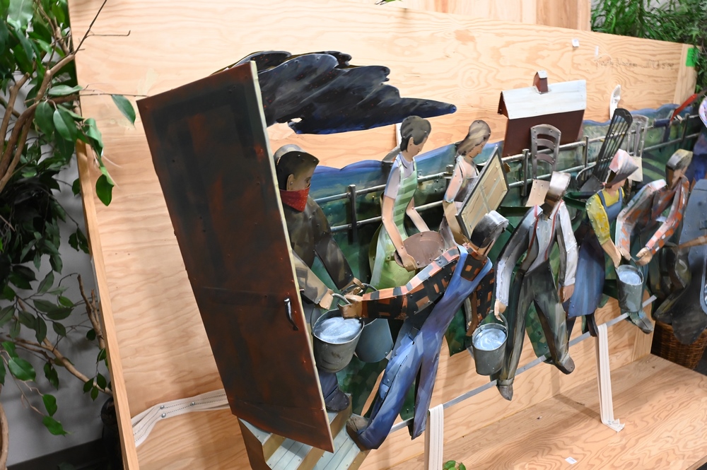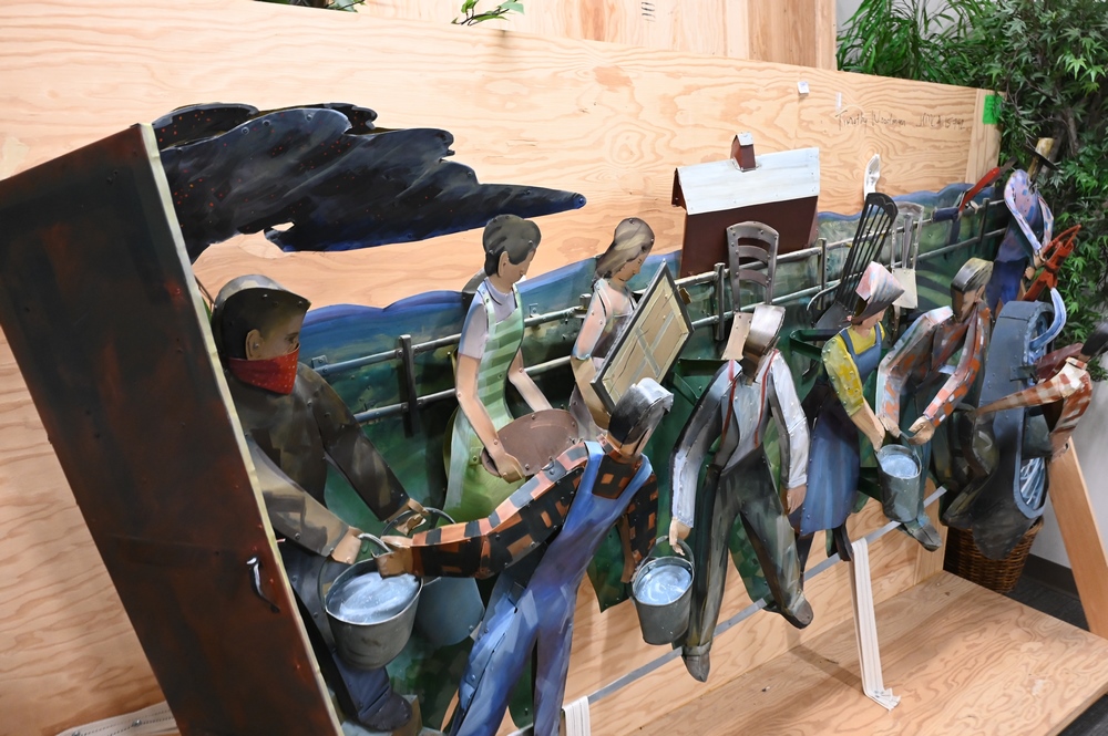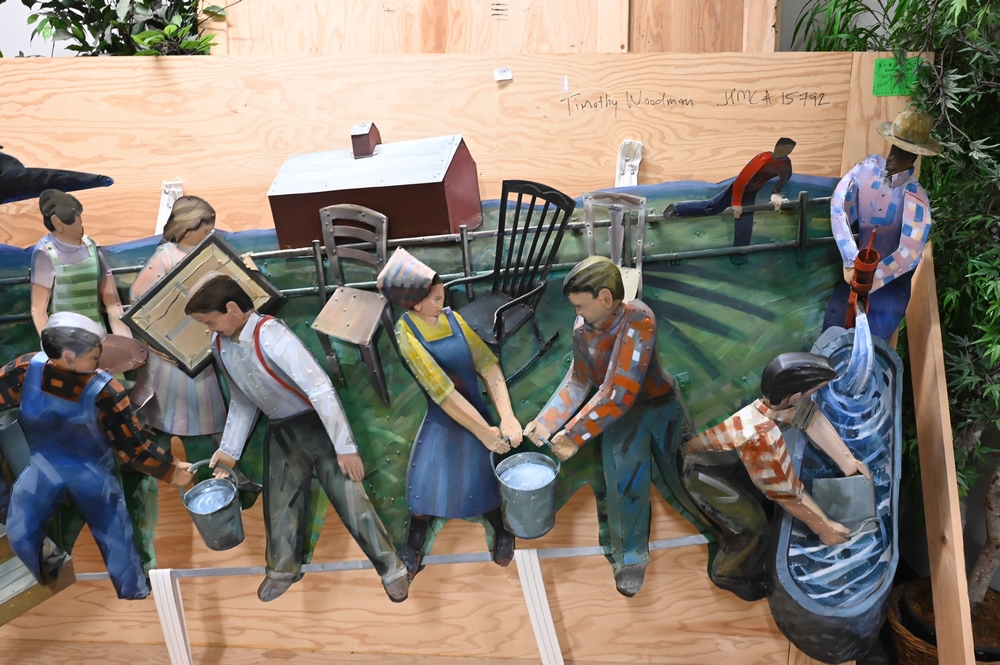 Timothy Woodman (American, 1952 – 2018), Bucket Bridge 1986, oil on aluminum, overall 56″ x 95″ x 20 1/2″, signed, dated and titled on back.