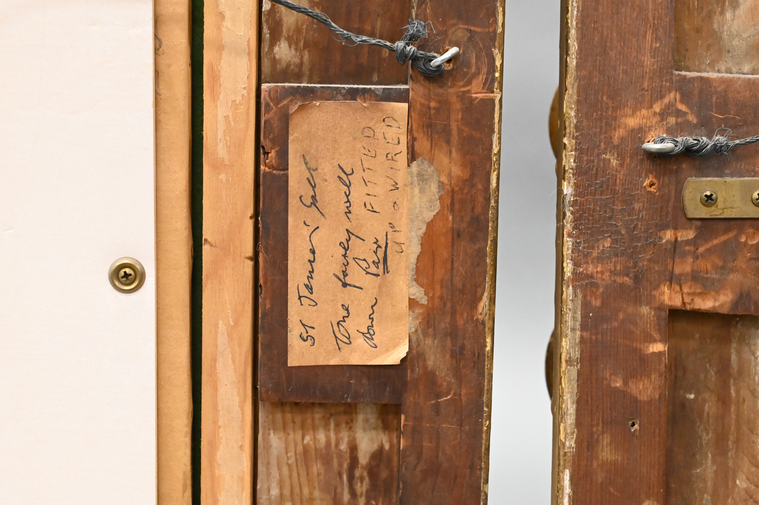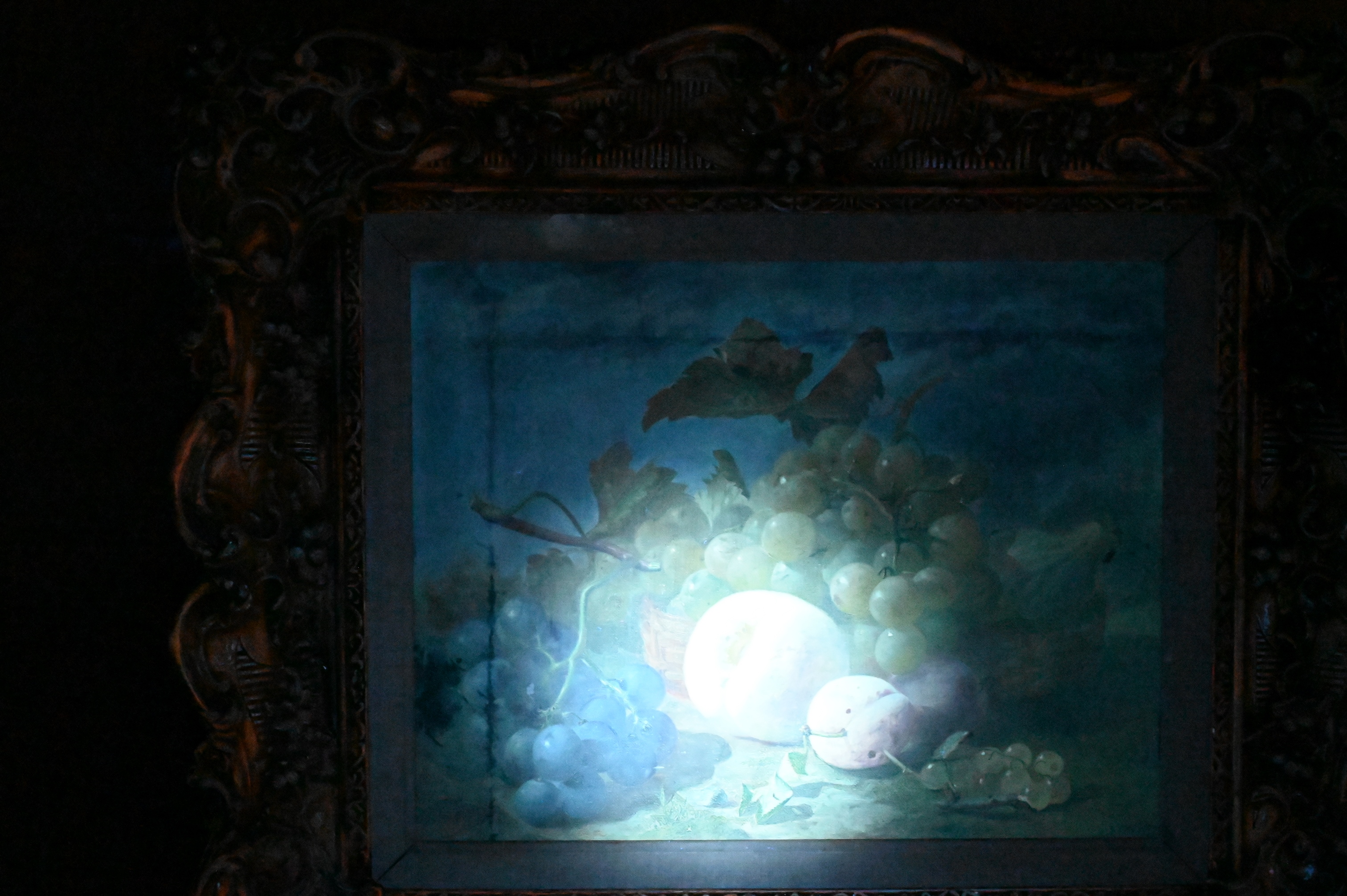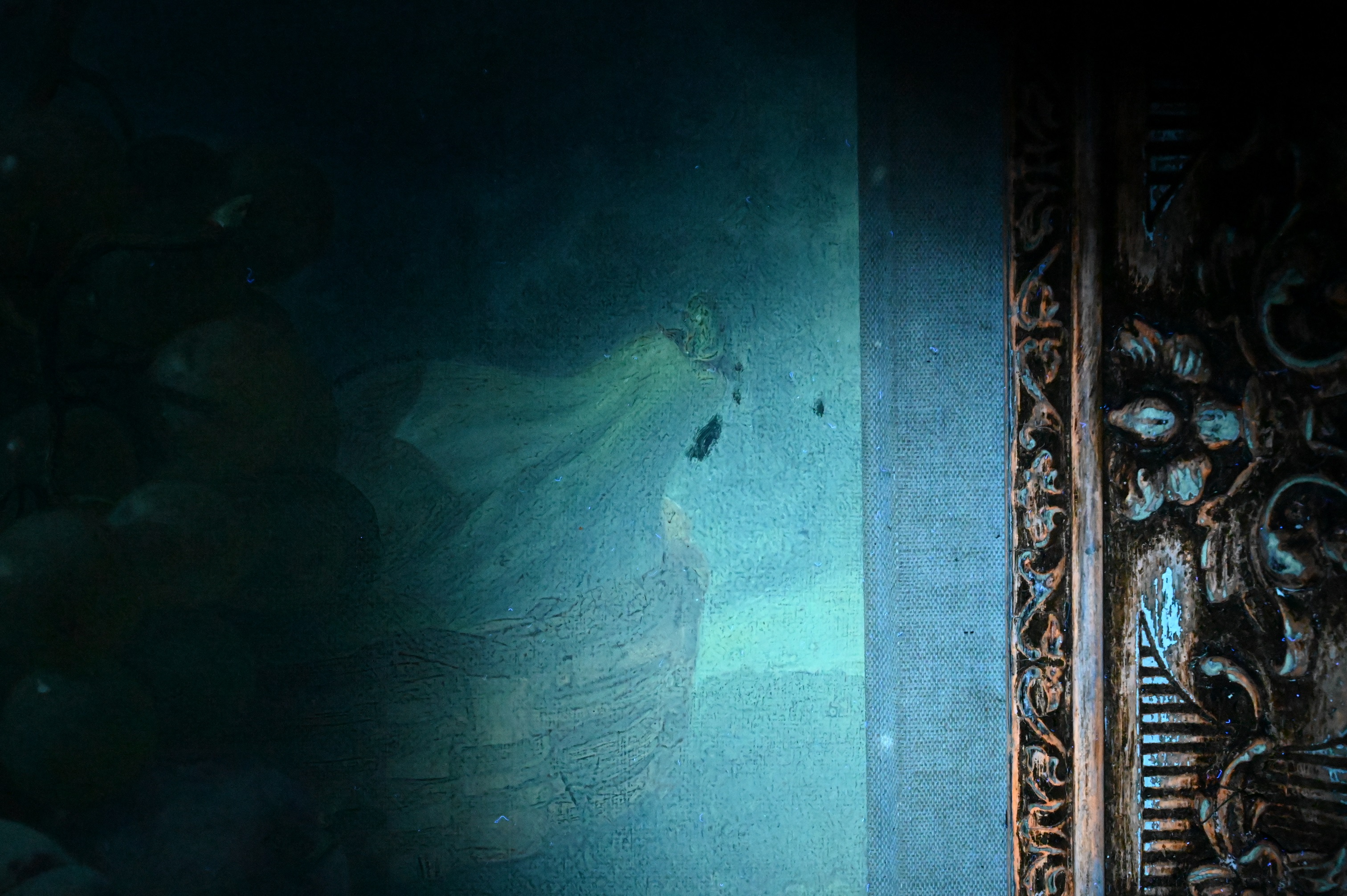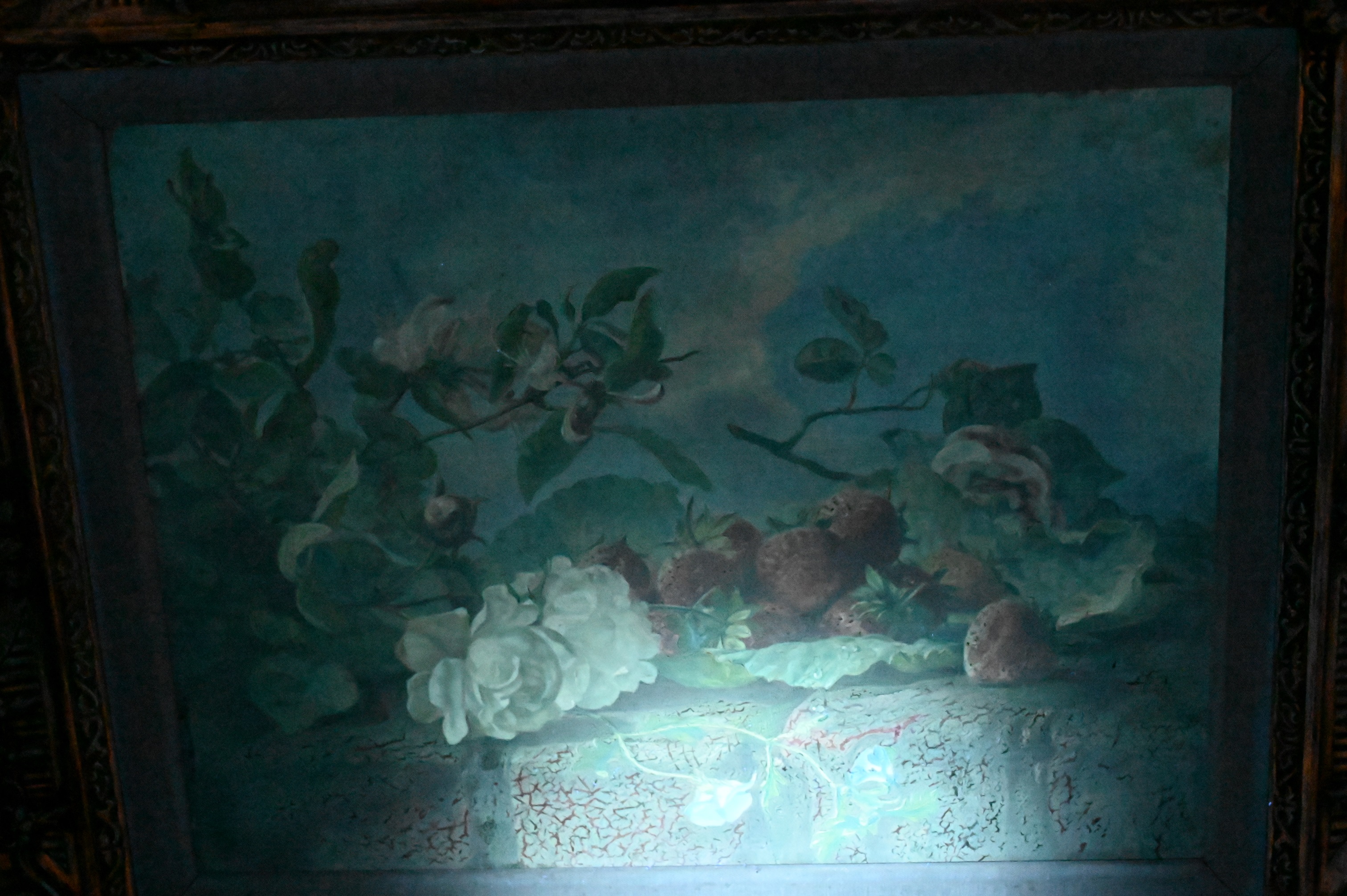 Black light: heavy varnish, inpainting, vertical and horizontal canvas repairs, see photos