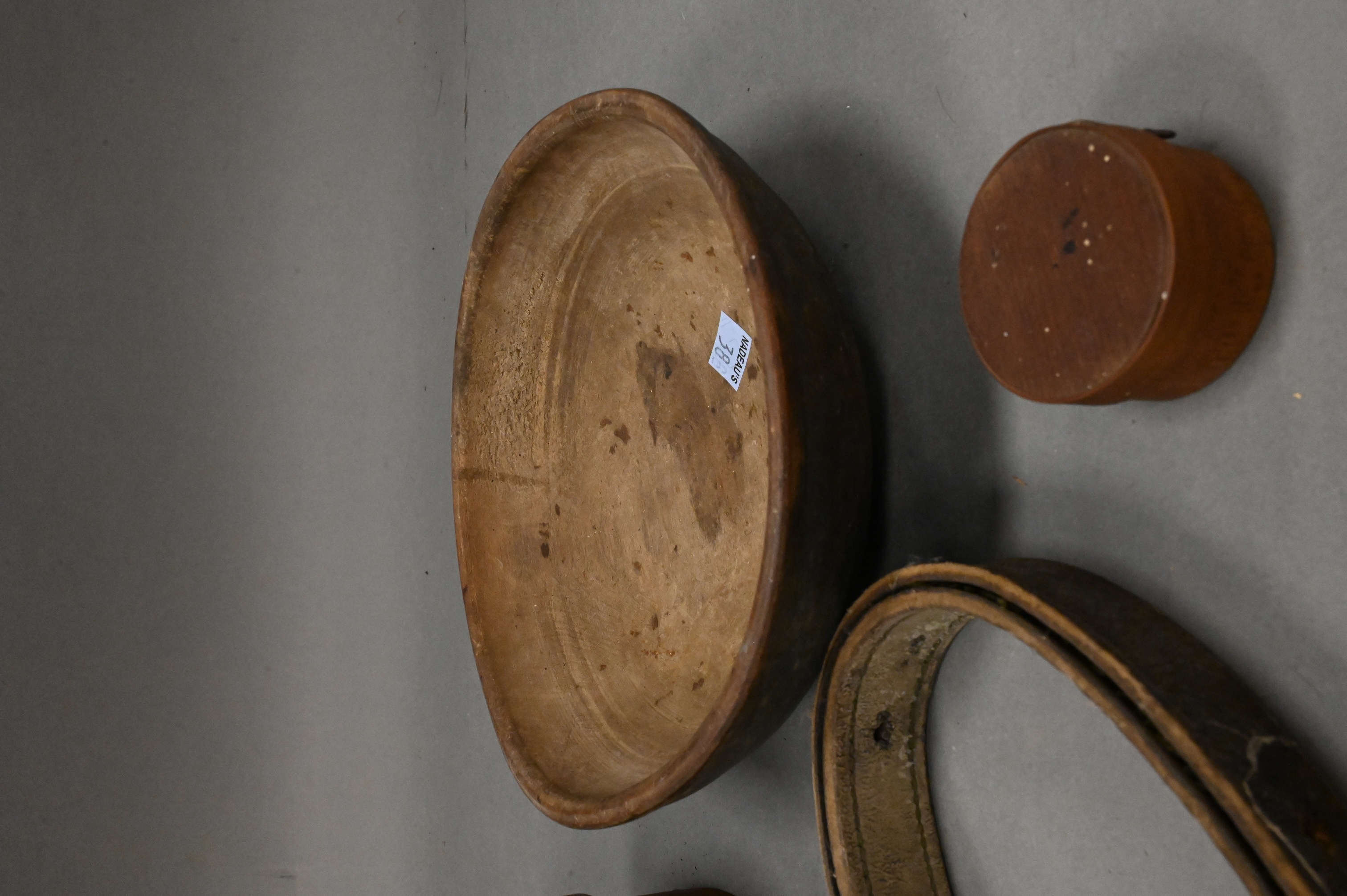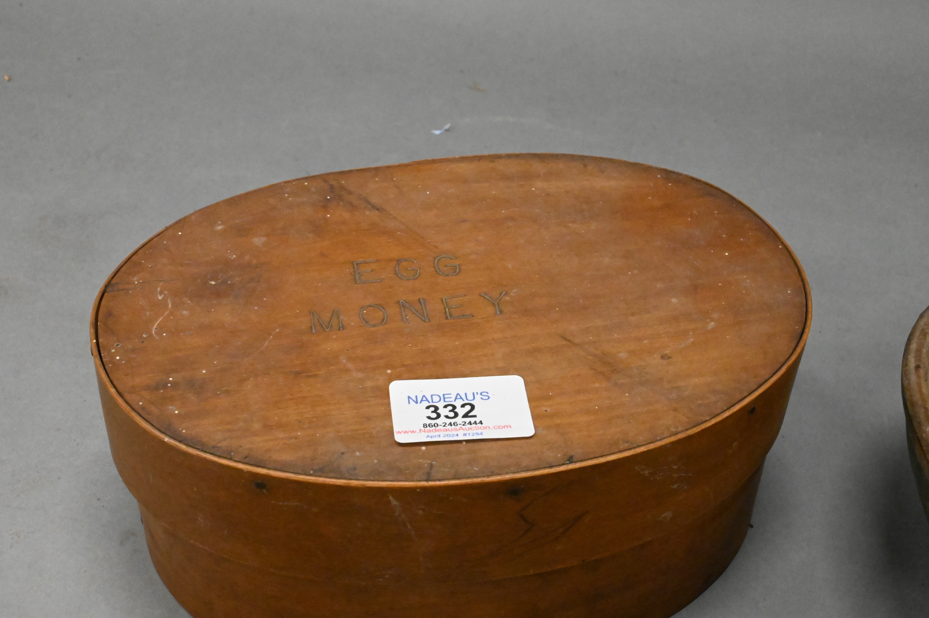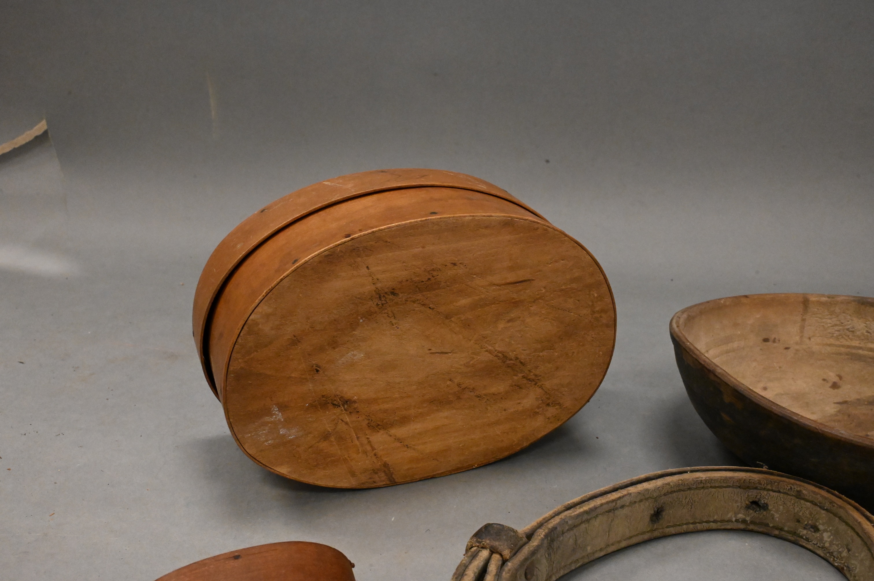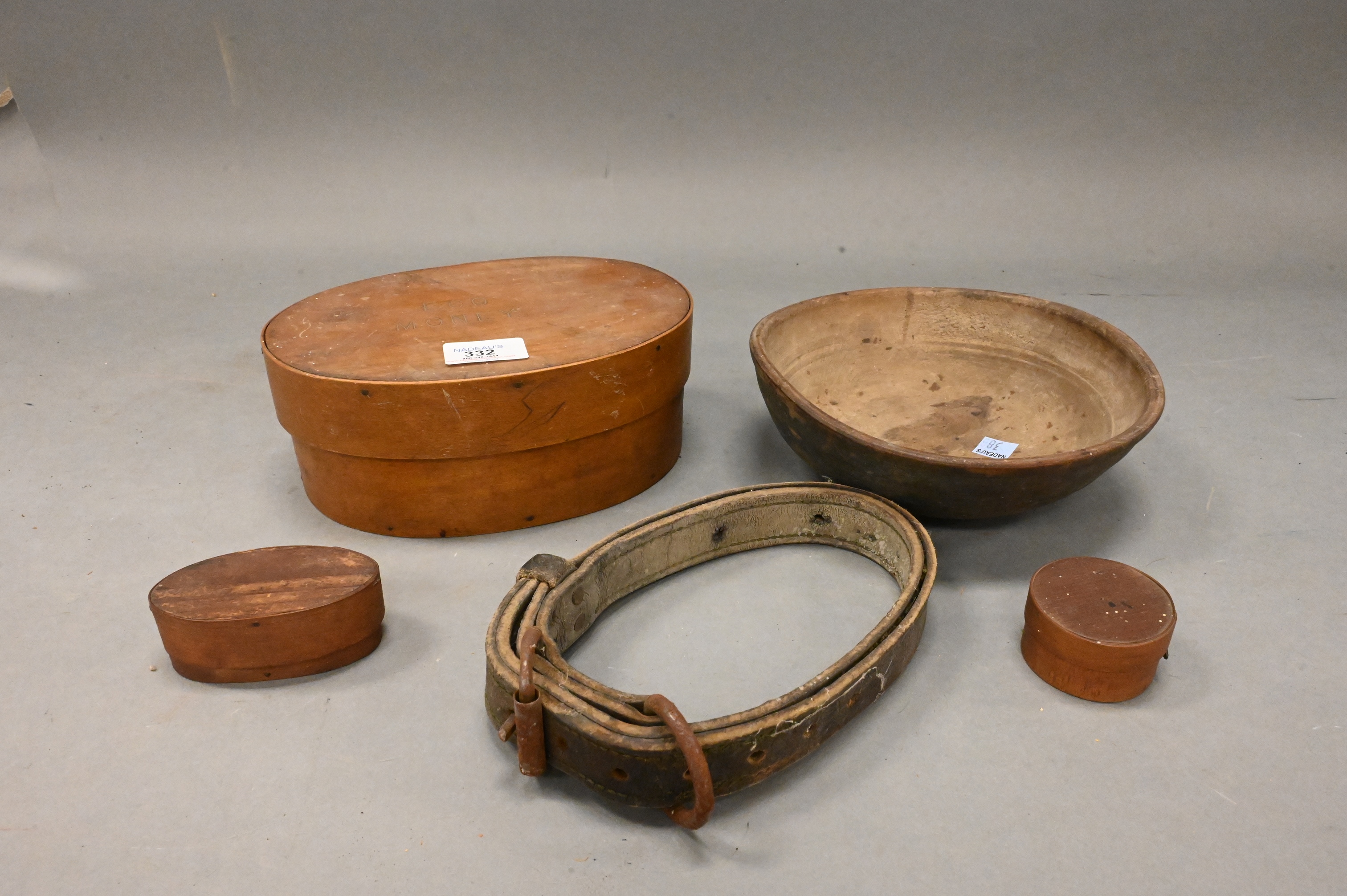 as well as three one finger boxes, one marked (Egg money) on top, one round, two oval, along with , early turned wooden bowl in old blue/green paint