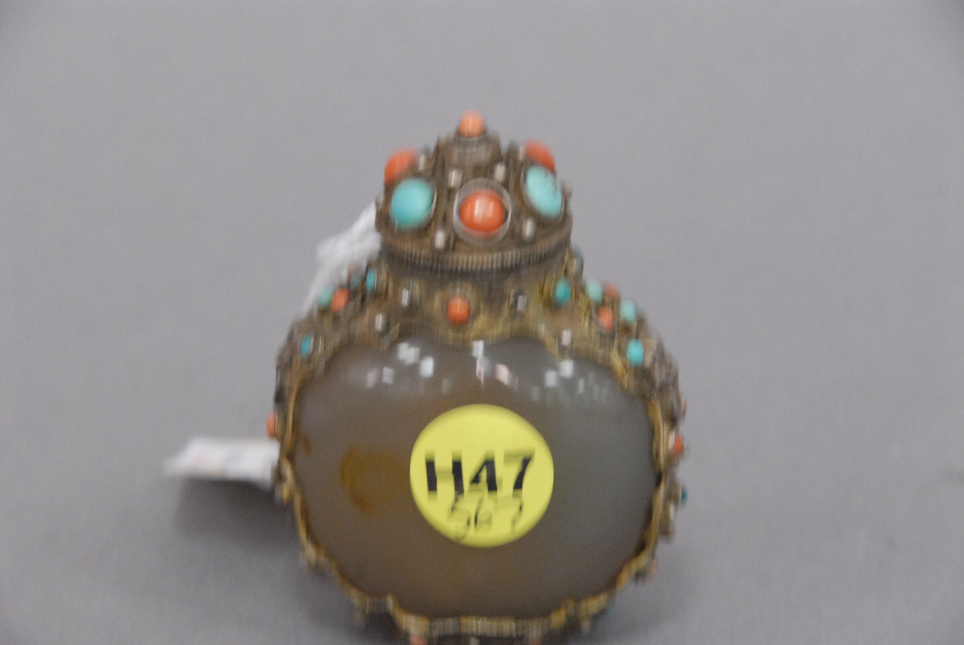 A Sino-Mongolian metal mounted shadow agate snuff bottle, large agate body mounted with metal stapwork around the exterior and forming in a low foot and high neck, inlaid with turquoise and coral, ht. 2 3/4.