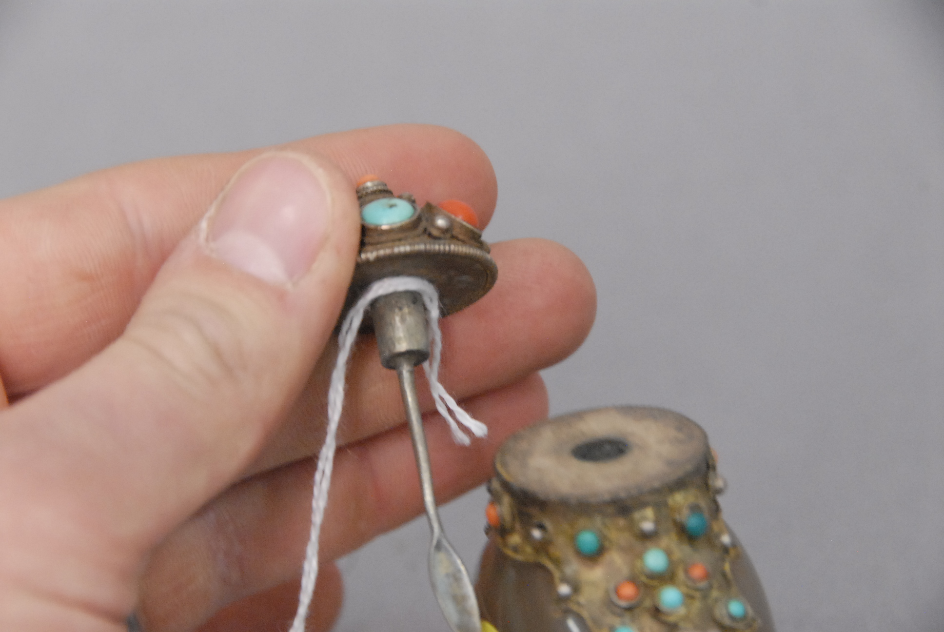 Lot 332: A Sino-Mongolian metal mounted shadow agate snuff bottle, large agate body mounted with metal stapwork around the exterior and formi…