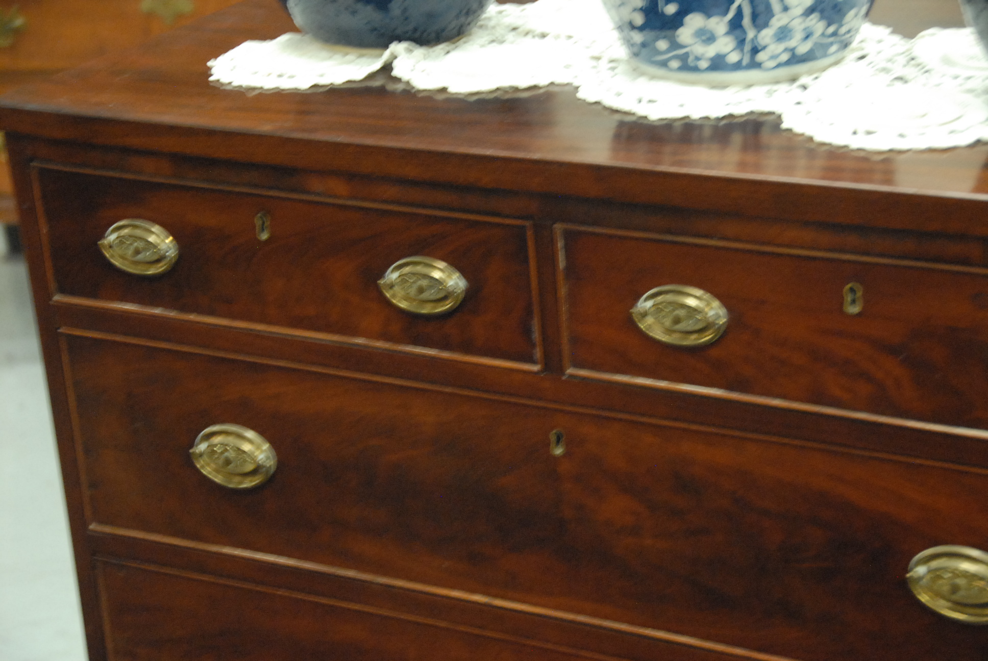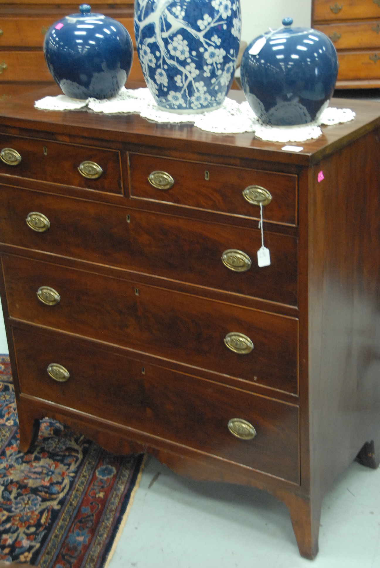 Lot 332: Federal mahogany chest with two short drawers over three long drawers with scalloped apron set on French feet, circa 1790-1810. ht. 41 in. wd. 38 in. dp. 18 in. Provenance: Property from The Estate of W. Scott Van Alstyne of Essex, Co