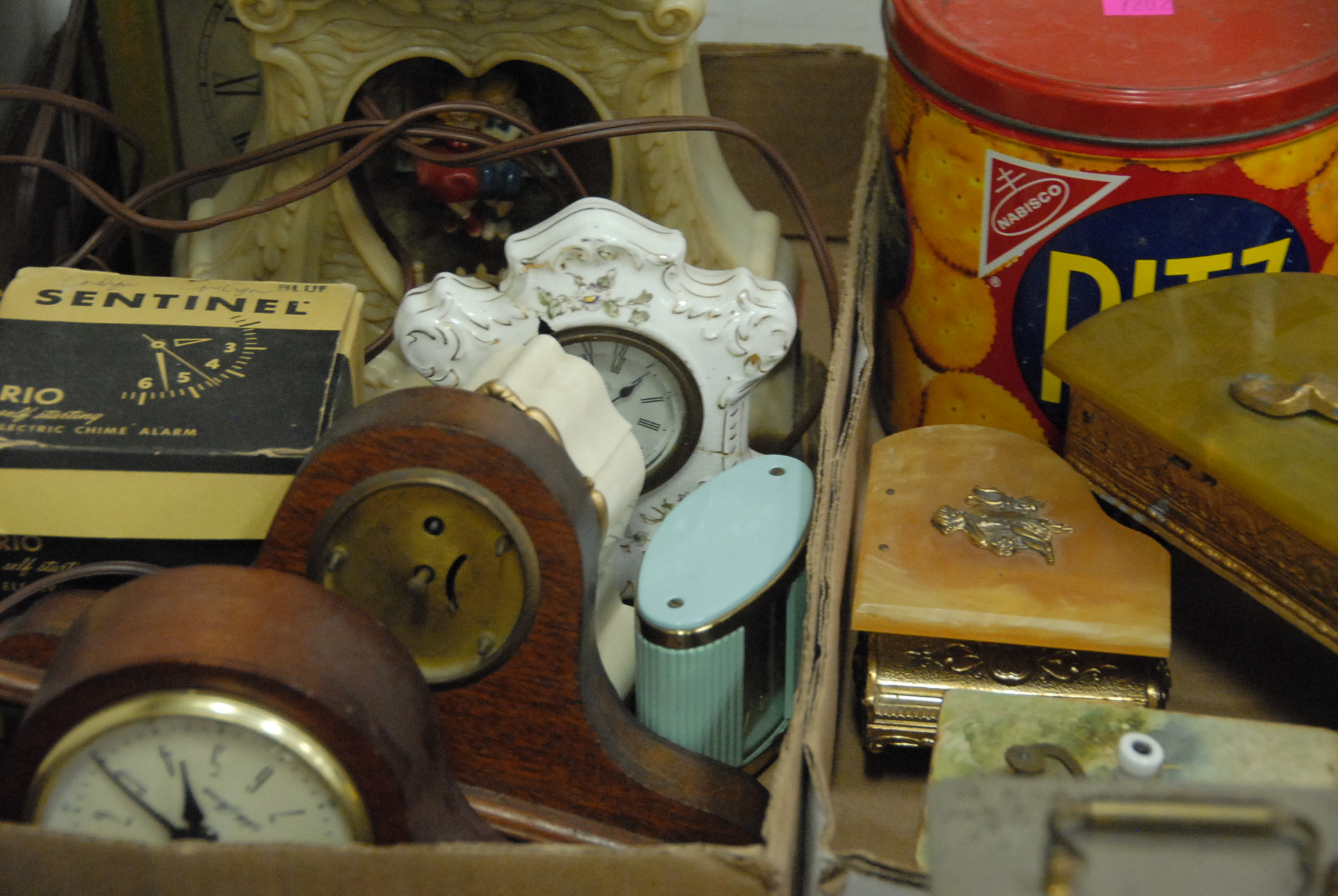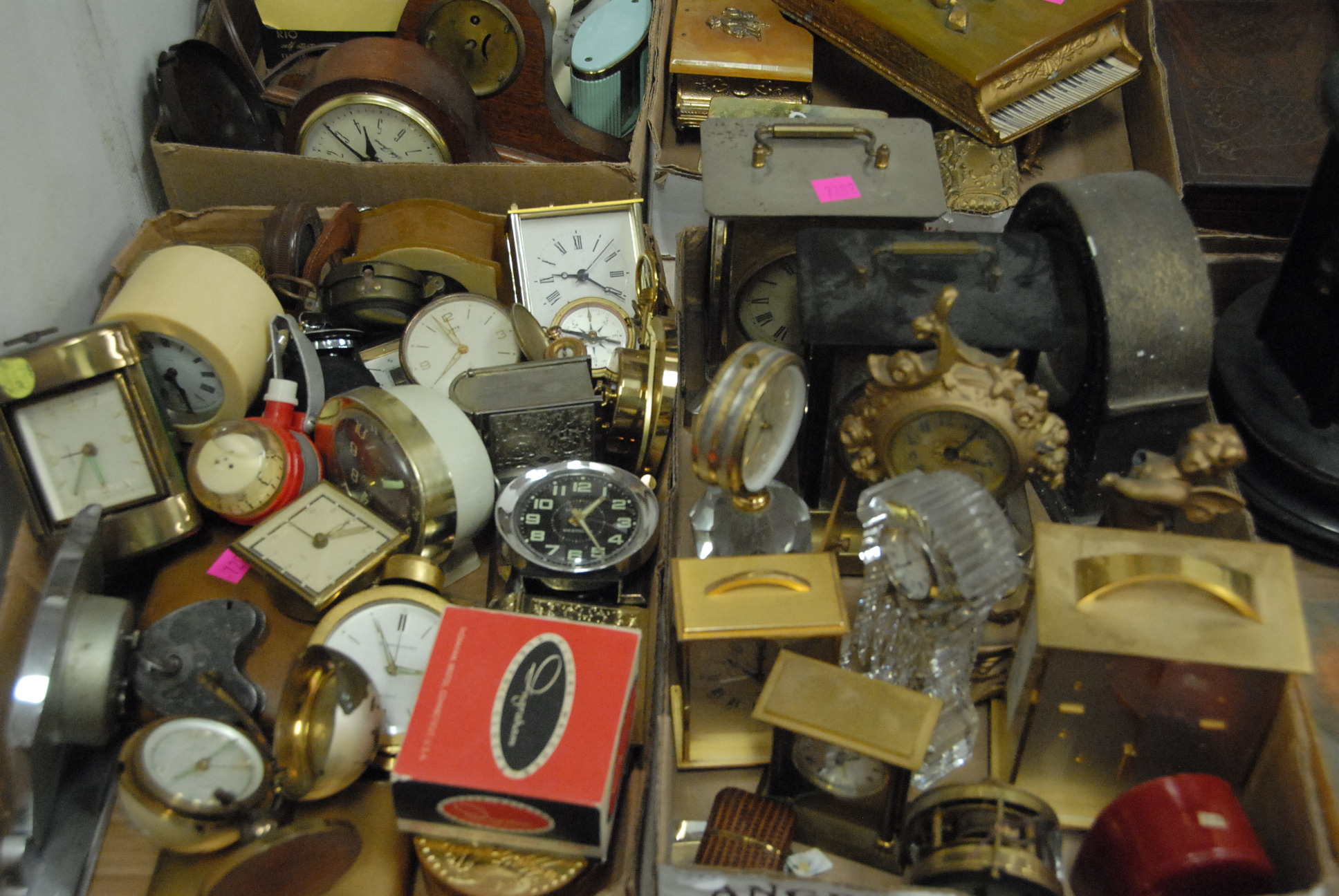Four box lots of clocks and music boxes including travel clocks and Waterford clock.