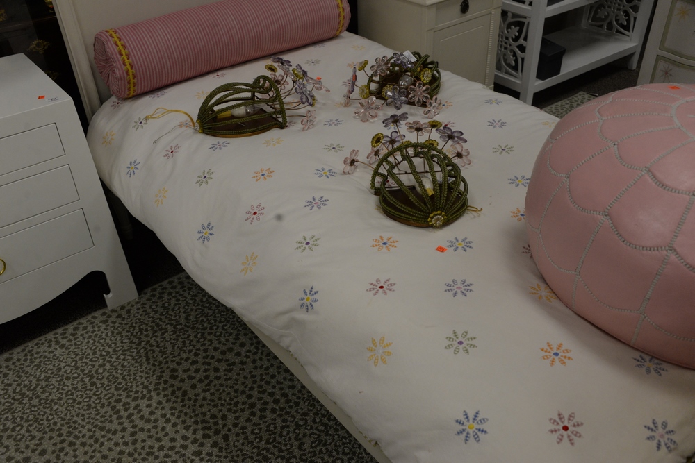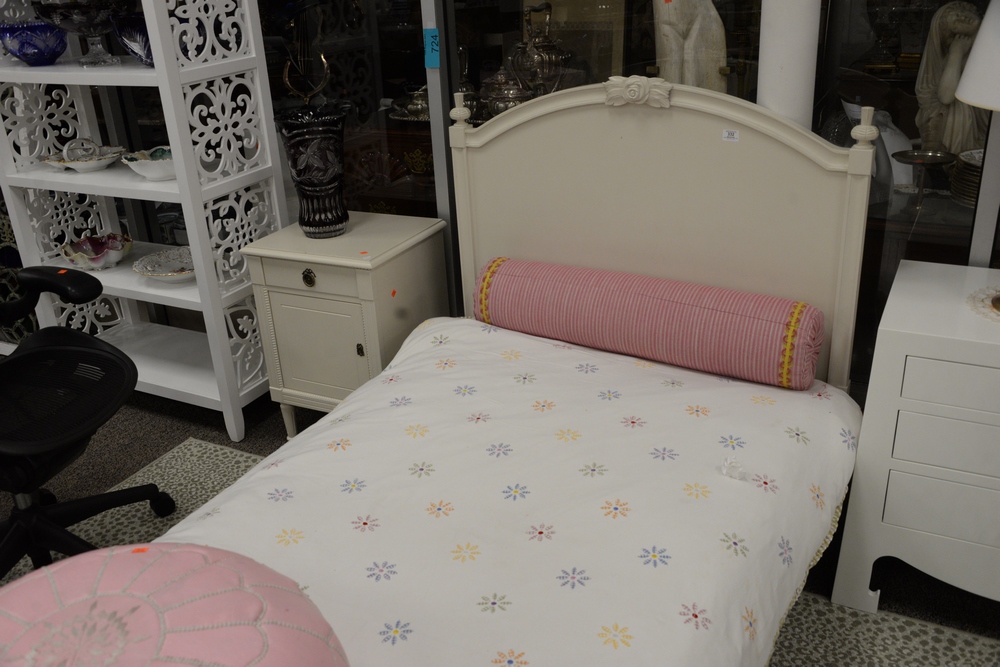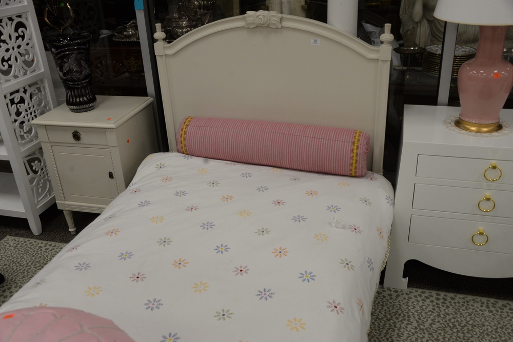 Lot 332: Four Piece Lot, to include a pair of custom twin beds with bedding along with a pair of custom night stands in cream paint, nightsta…