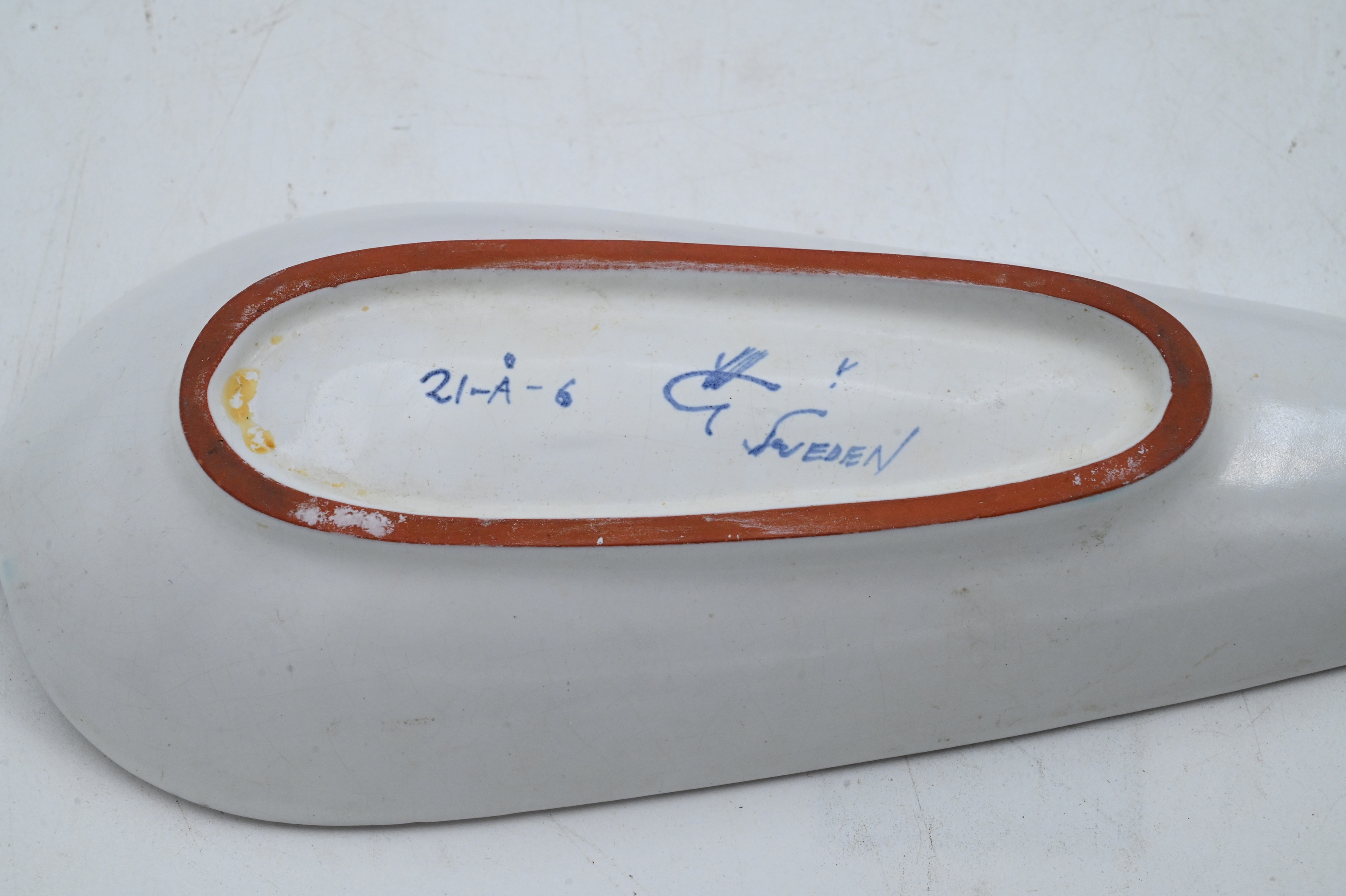 Danish mid-century modern faience to include long leaf form dish, round leaf form bowl, small rectangular tray along with large rectangular tray
