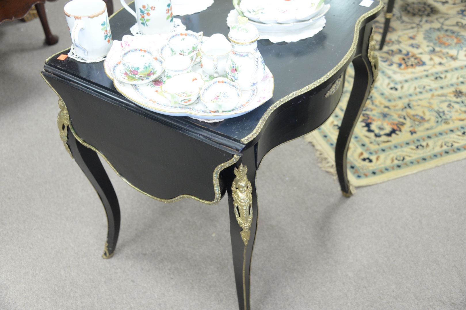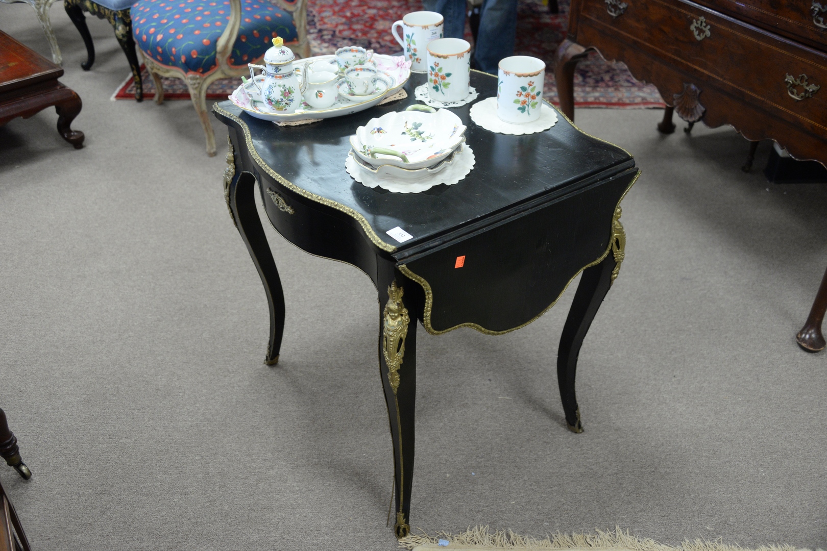Lot 332: French style center table painted black with figural bronze mounts, height 28 inches, top 28 x 28.