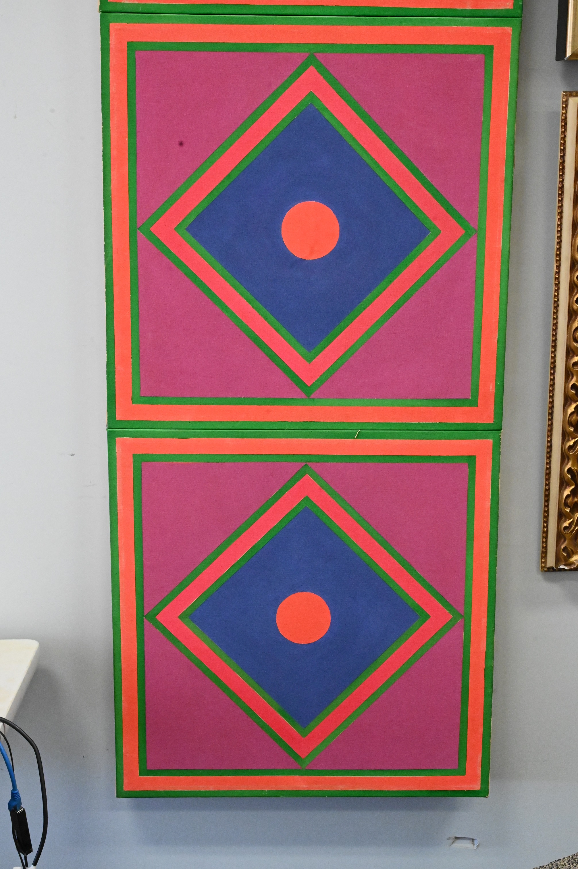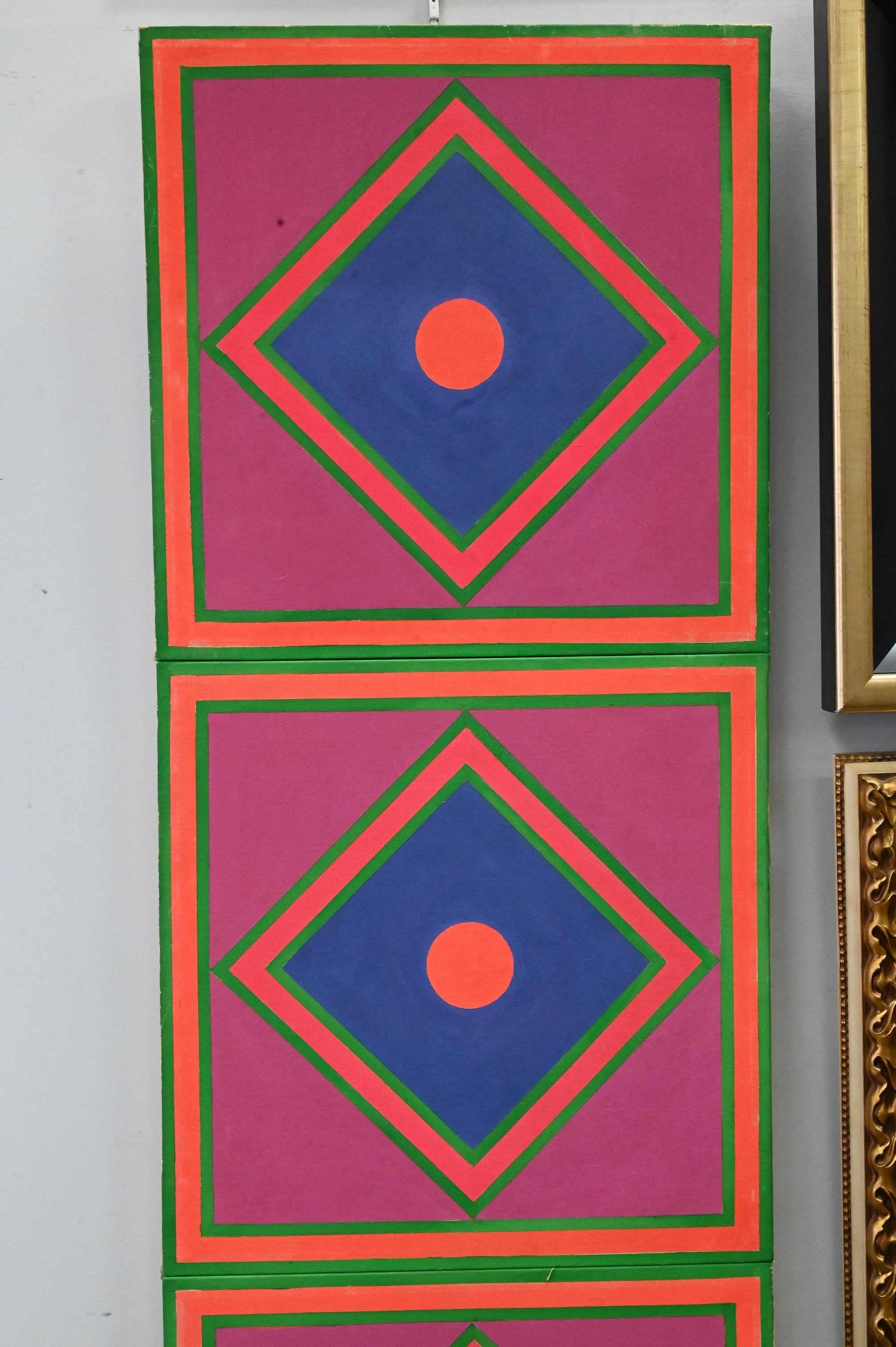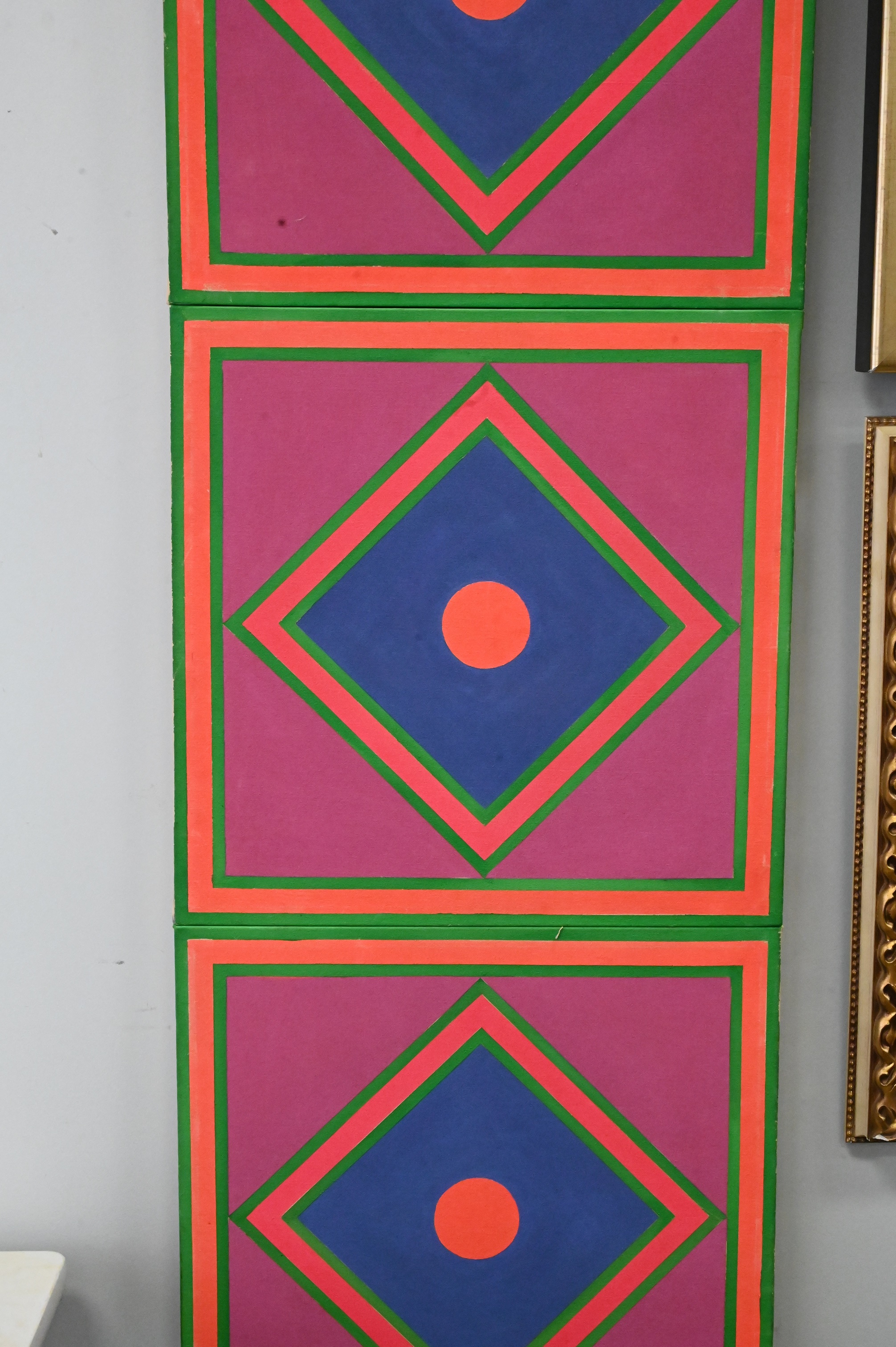 Geometric Abstract, oil on canvas, square diamond circles, vertical three part panel, unsigned, 74 1/4″ x 24 1/2″.