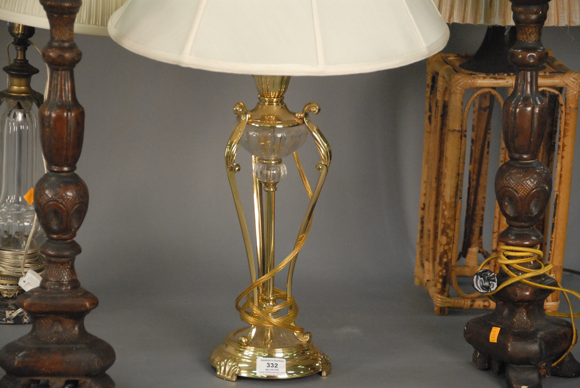 Group of five table lamps, two carved wood, two crystal and brass, and one bamboo.
