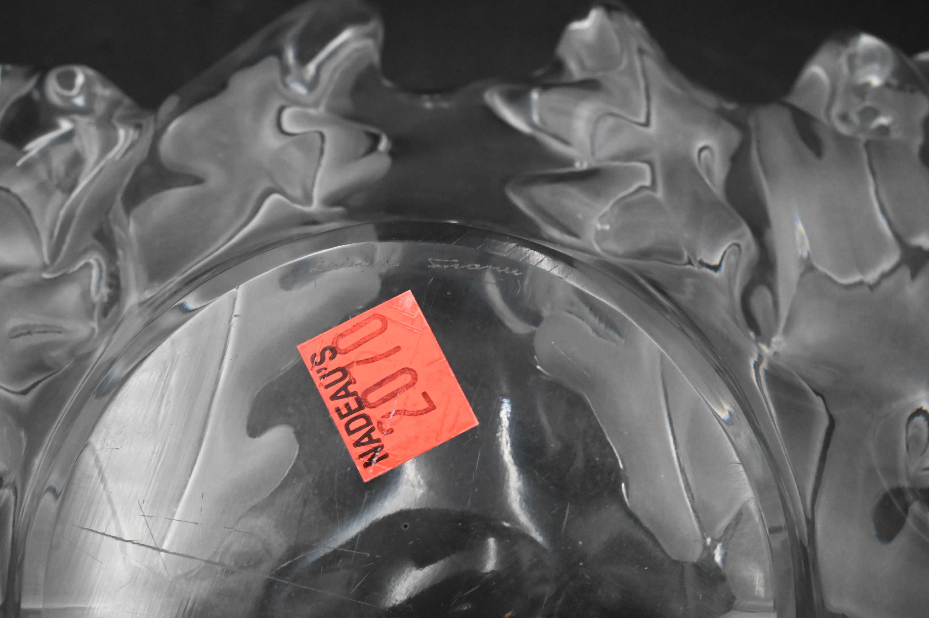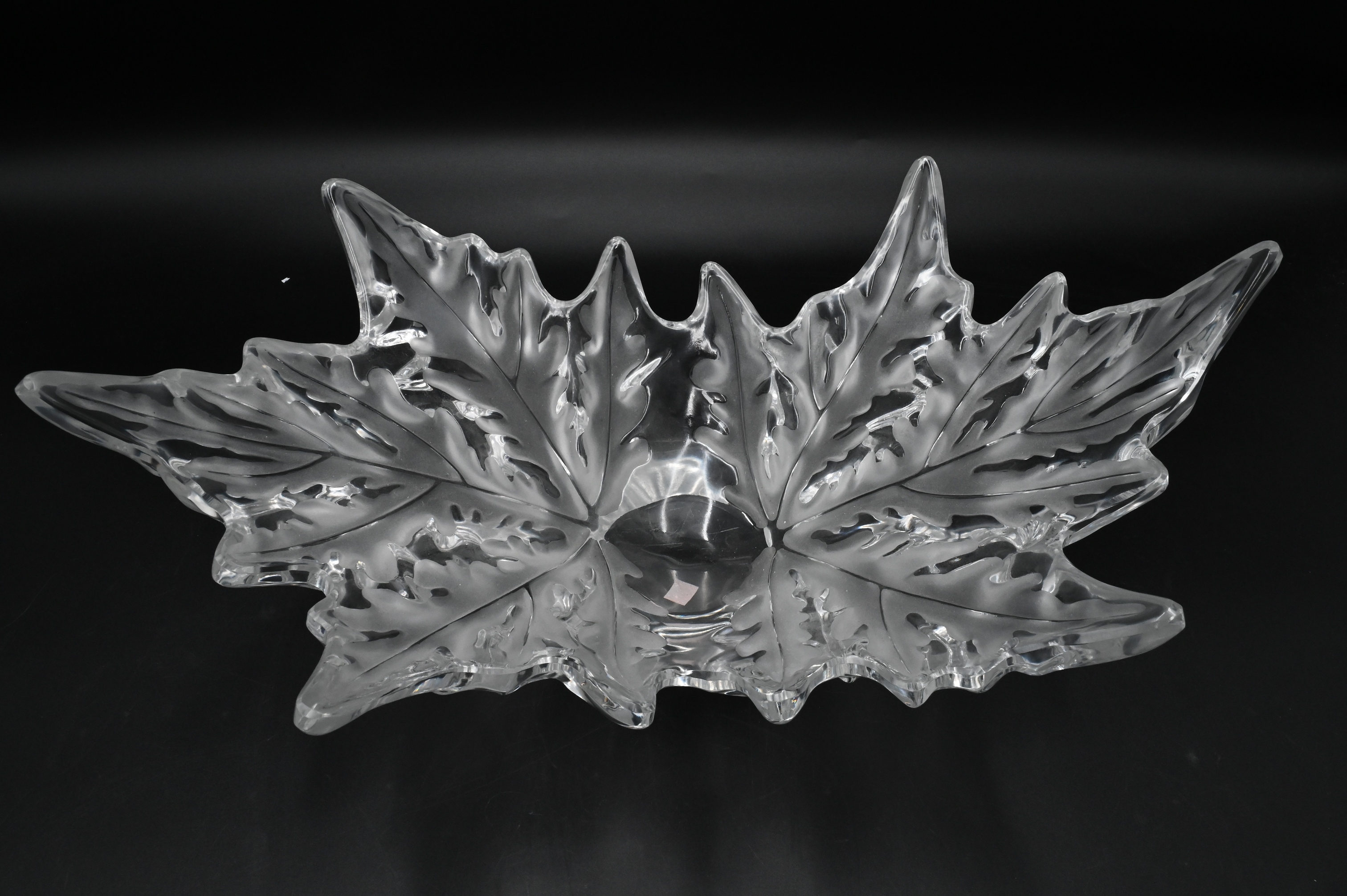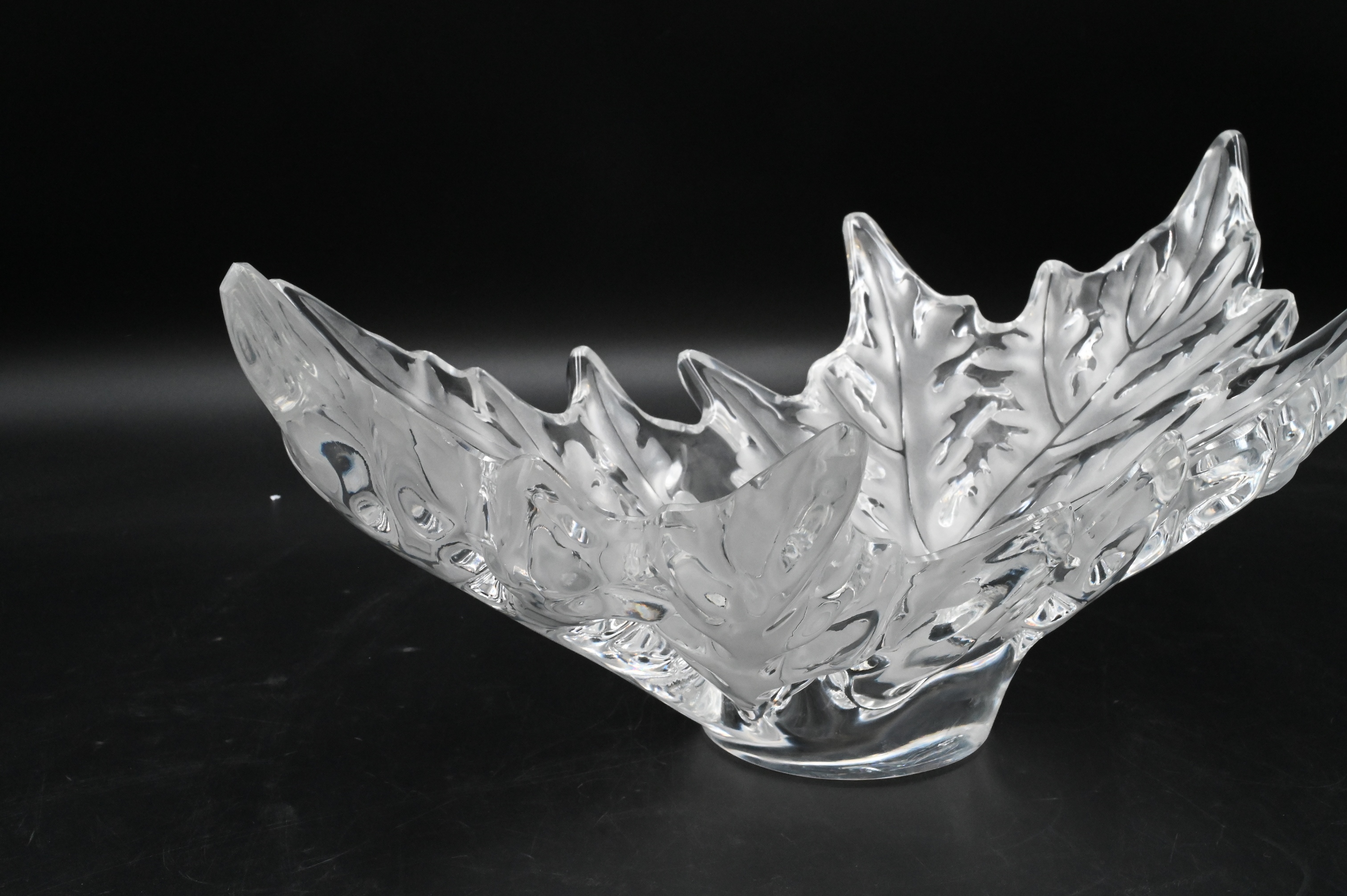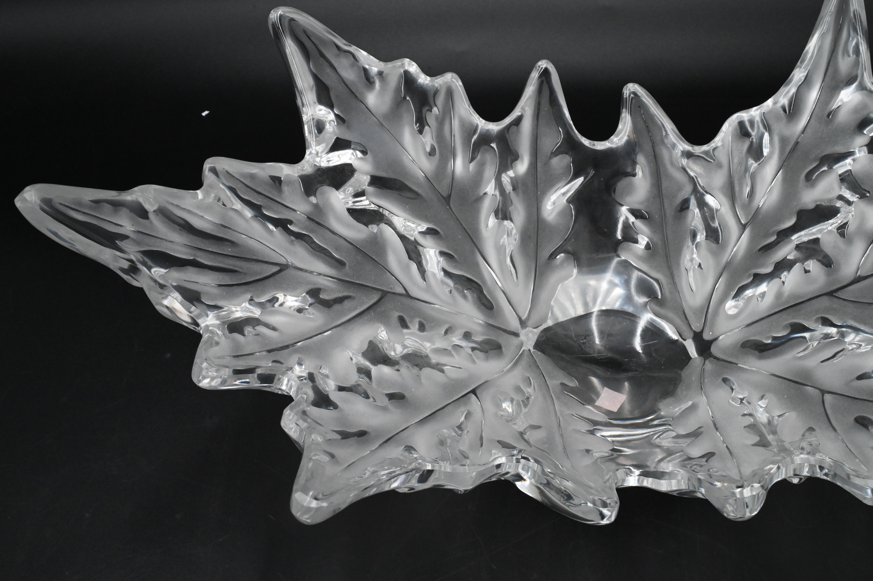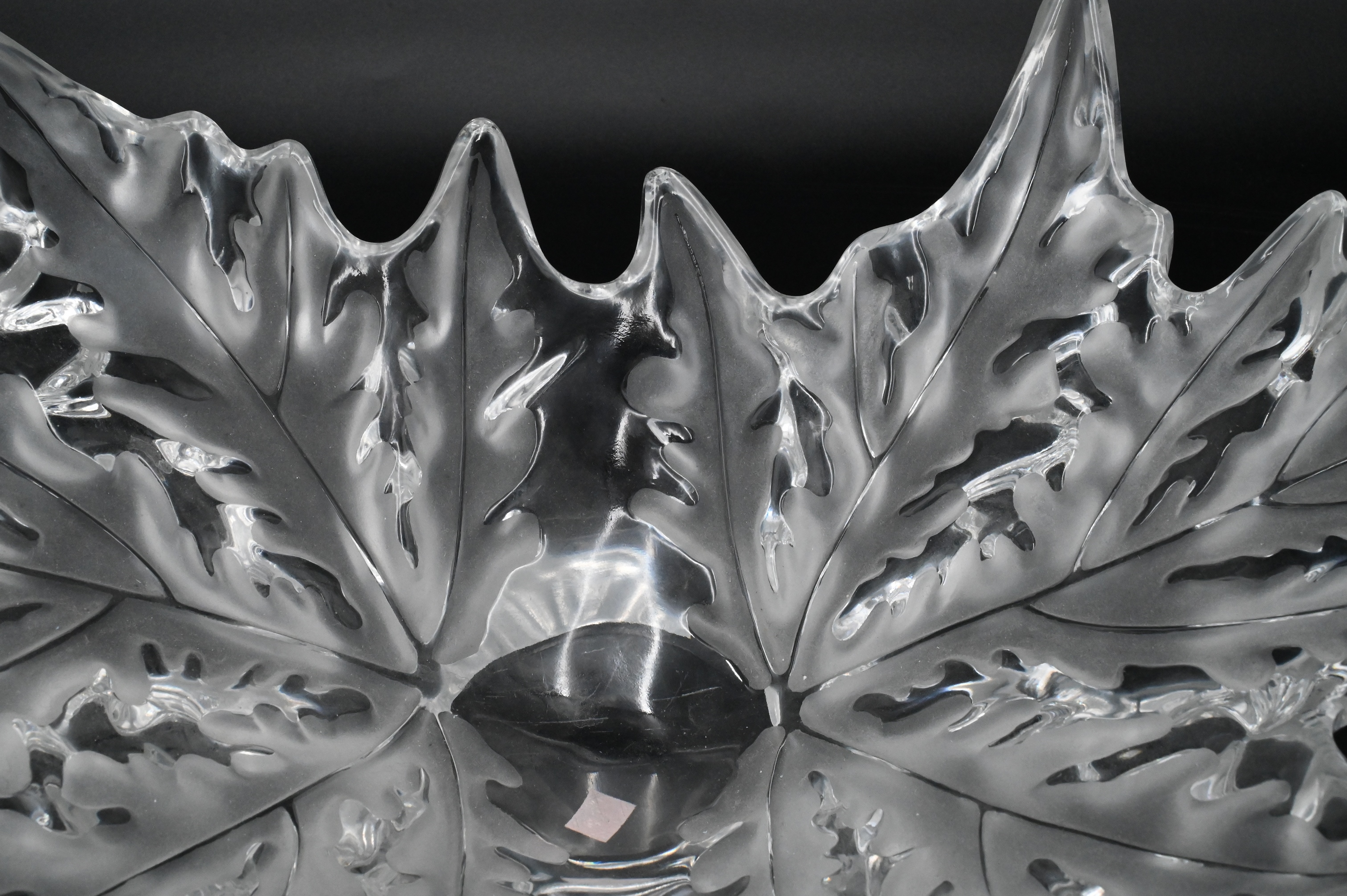 Lalique “Champs Elysees” Leaf Form Centerpiece Glass Bowl, signed on base, height 7 1/2 inches, length 18 inches.