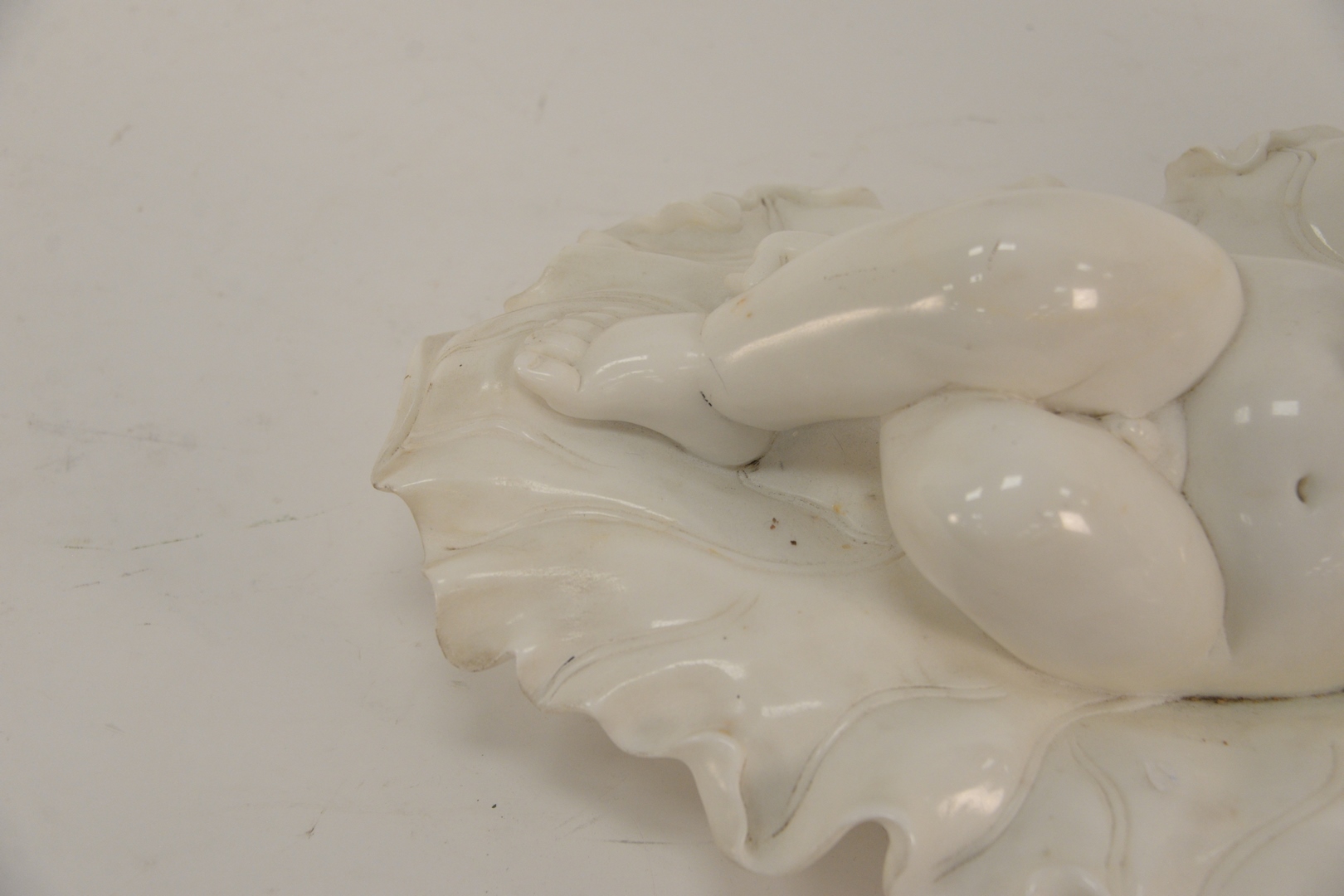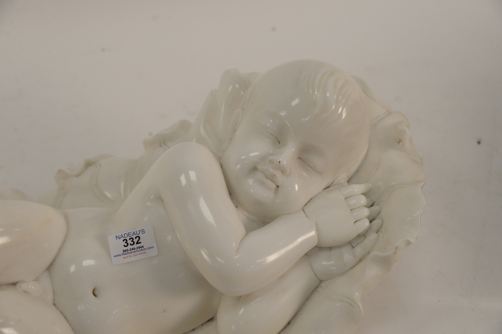 Lot 332: Large Italian Carrara Marble Sculpture of a Sleeping Baby, polished marble figure of a baby boy sleeping on leaf form, 20th century, height 8 1/2 inches, length 25 inches.