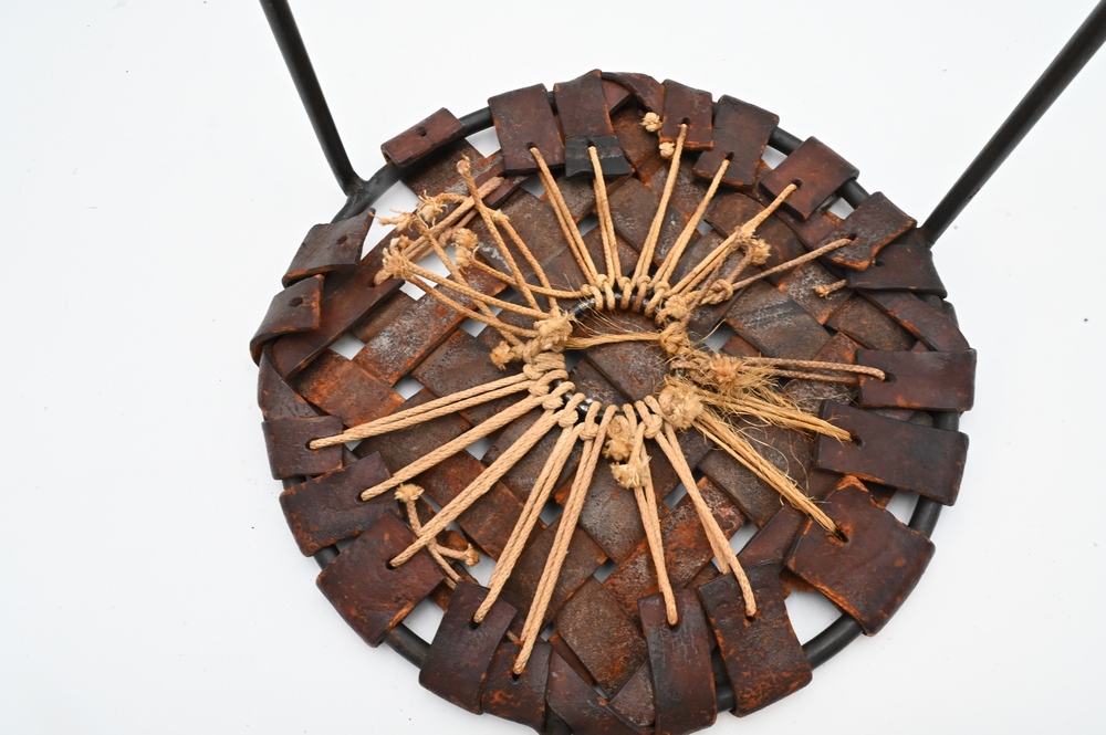 Lila Swift and Donald Monell Stool, iron with leather wrapped round top, height 12 inches, diameter 5 1/2 inches.