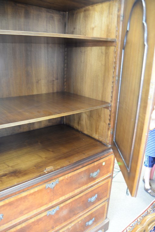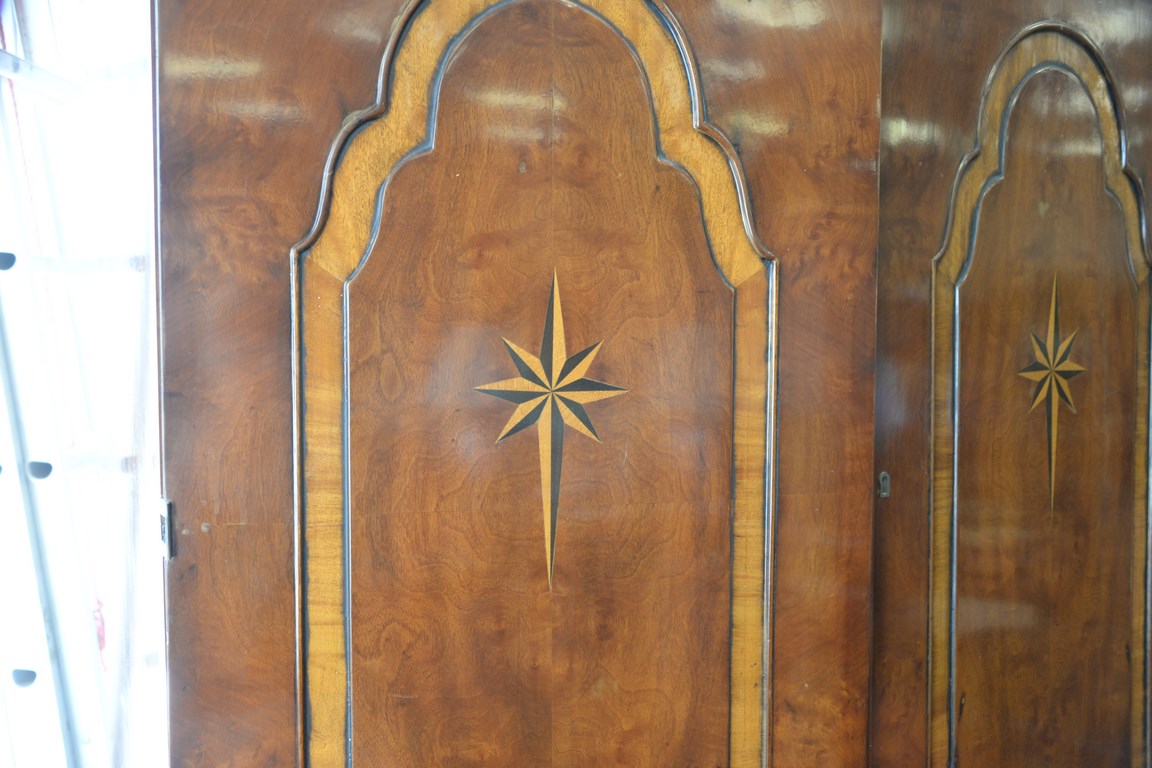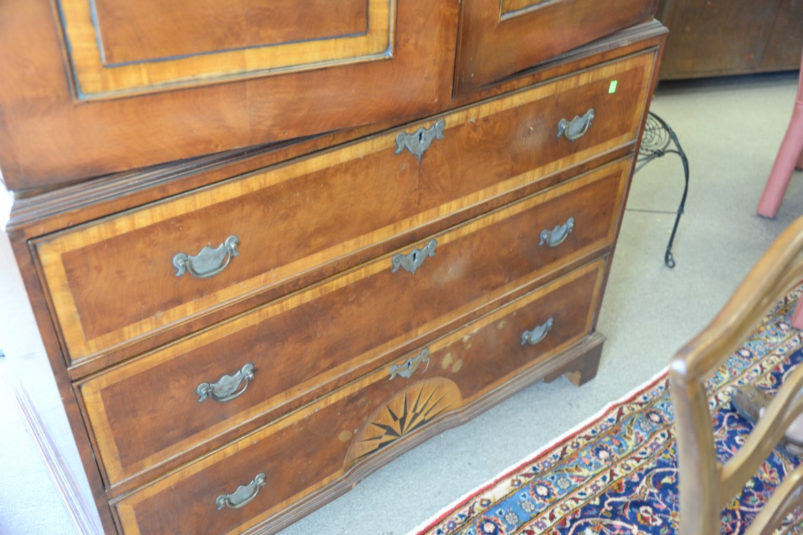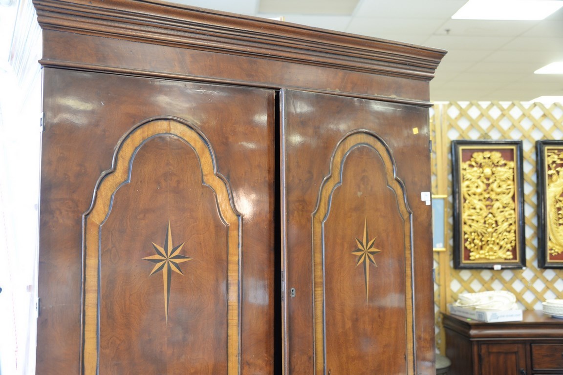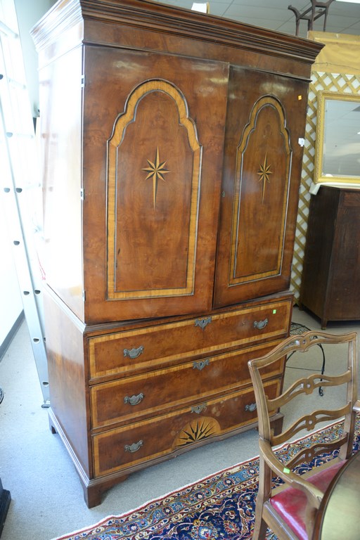 Lot 332: Mahogany inlaid linen press/cabinet, interior with shelves. ht. 84 in. wd. 48 in. dp. 27 1/2 in.