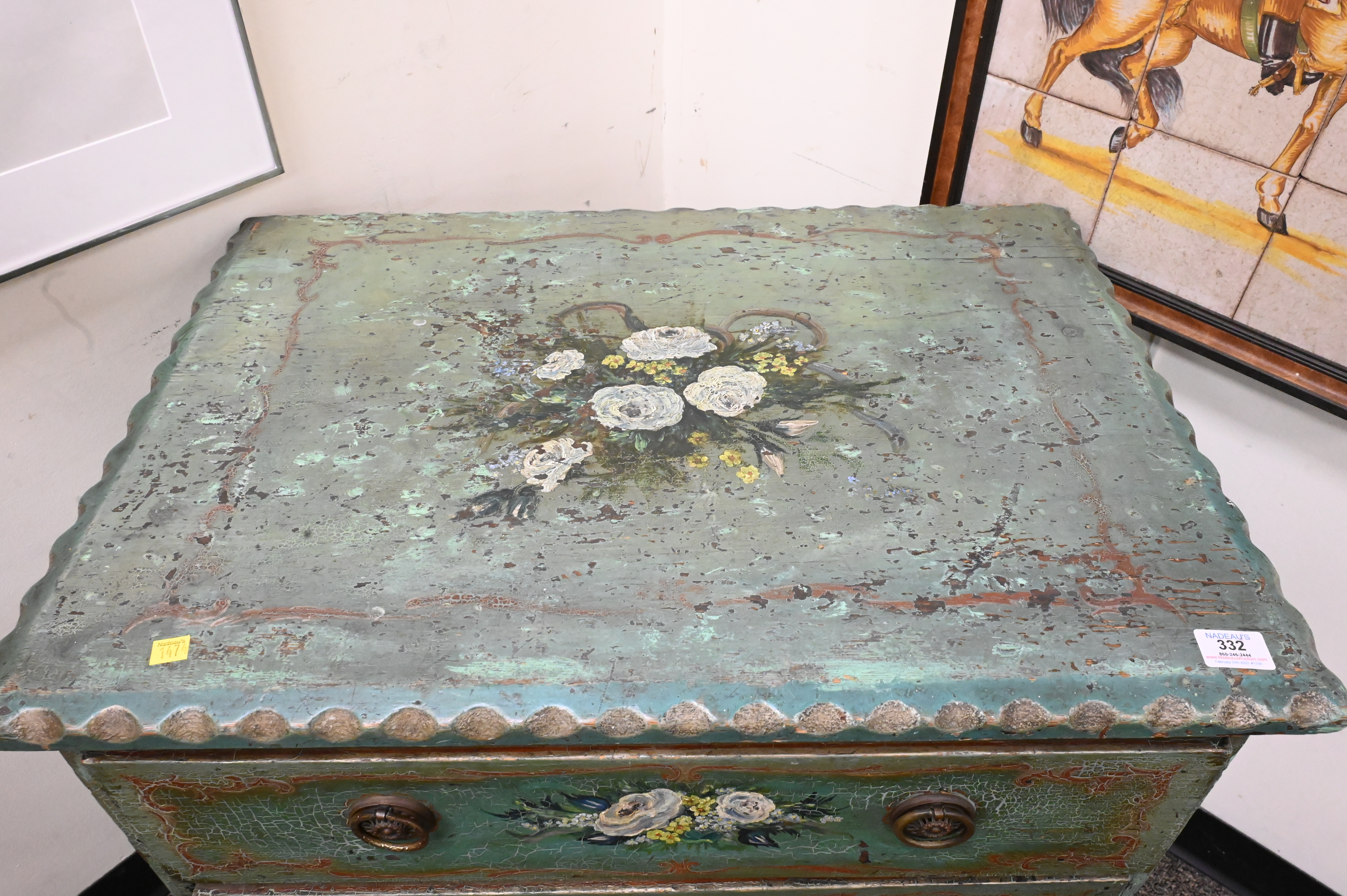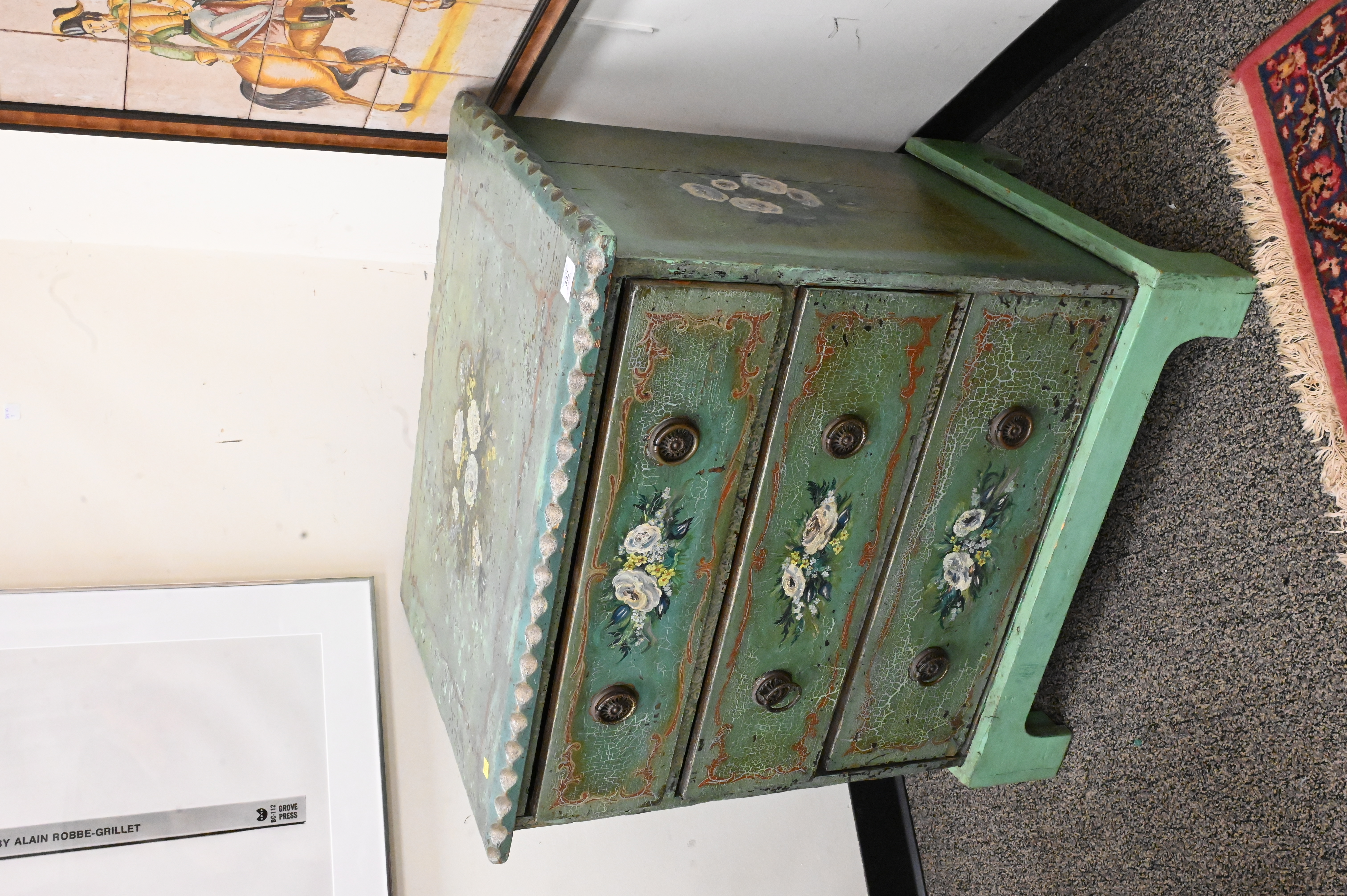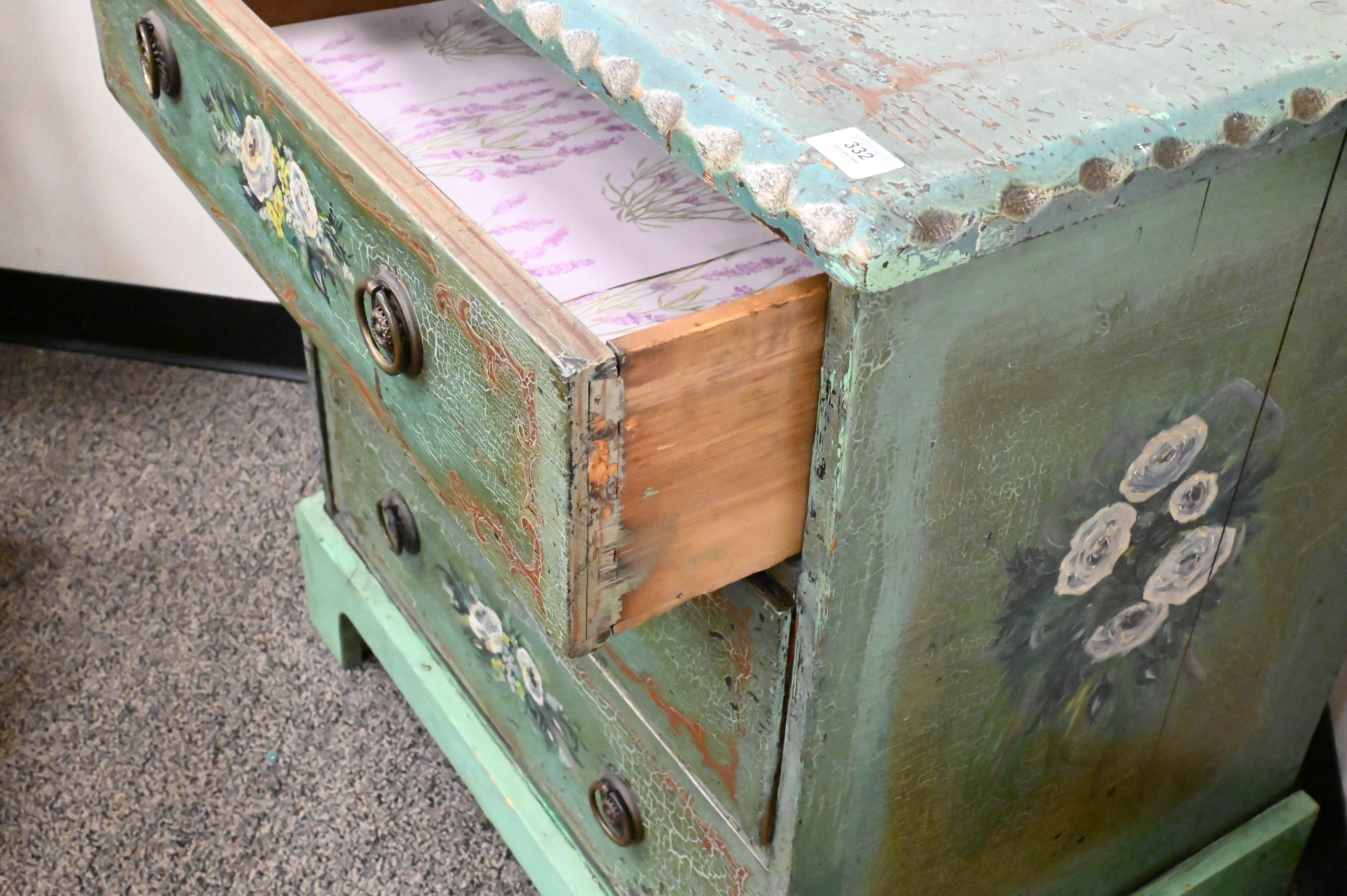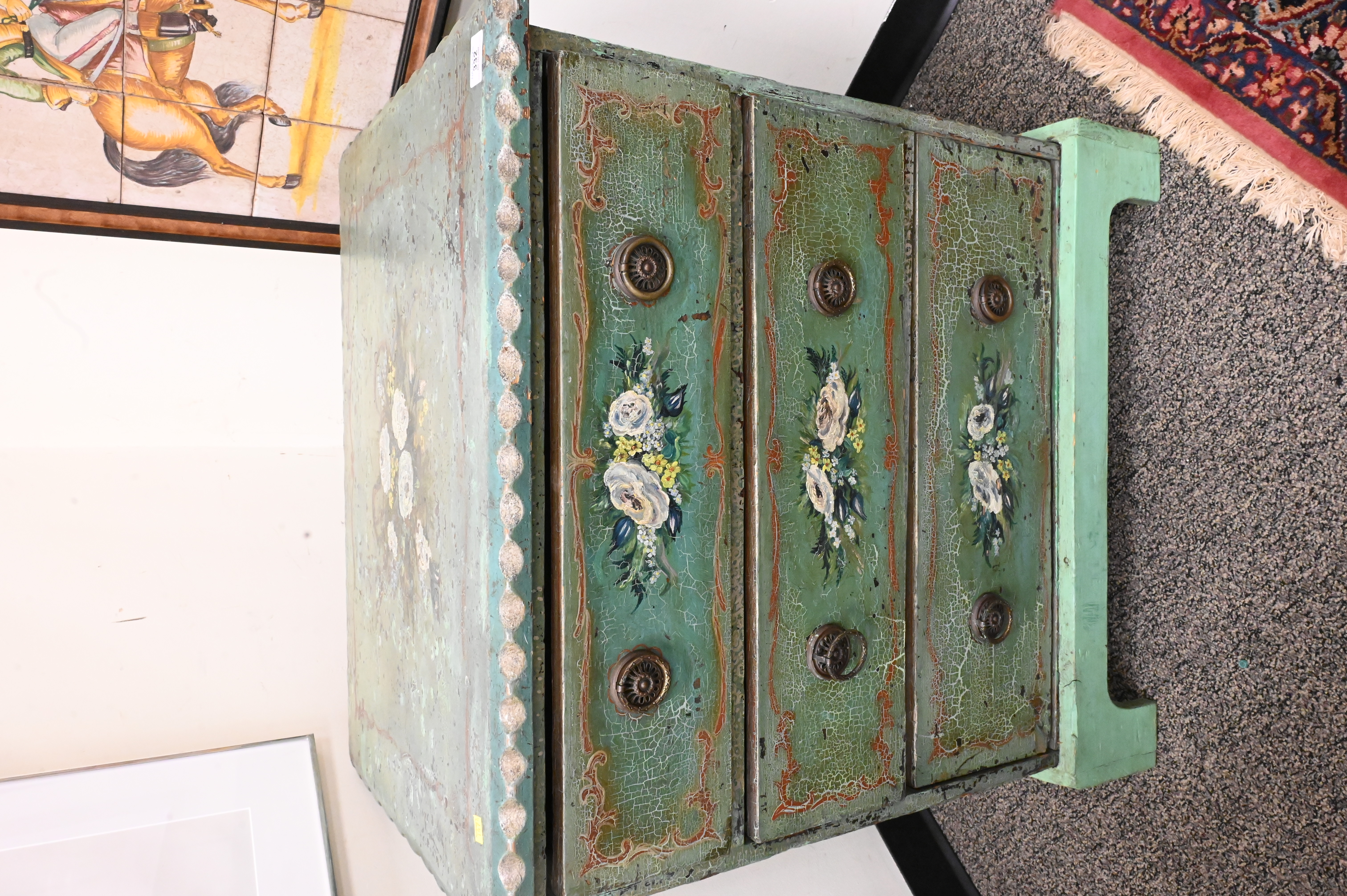 Paint Decorated Pine Chest, having three drawers, height 32 inches, top 21″ x 30″.