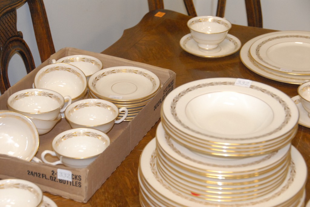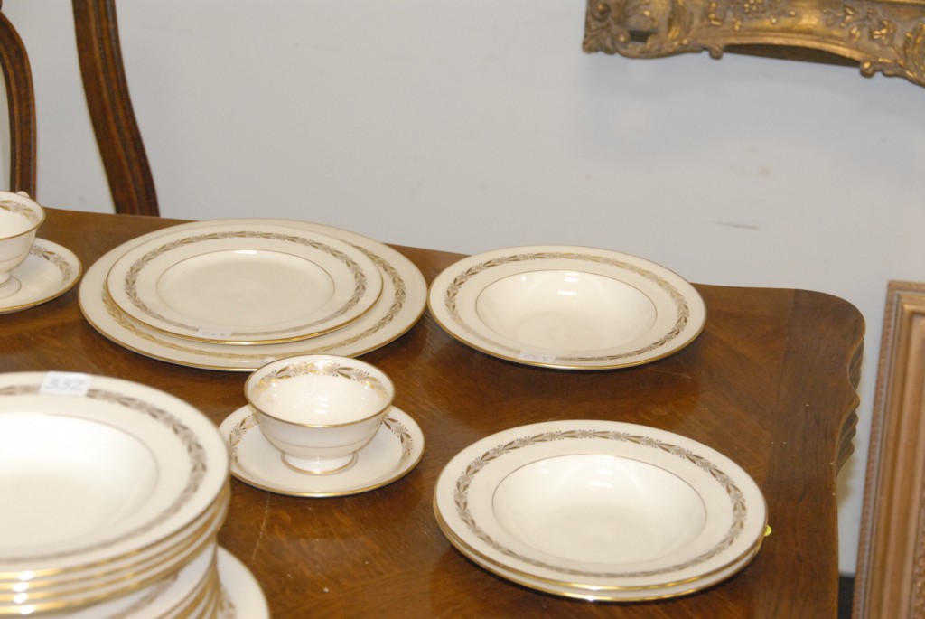 Set of gold wreath pattern Lenox china cups, saucers, plates 2 sizes and bowls.