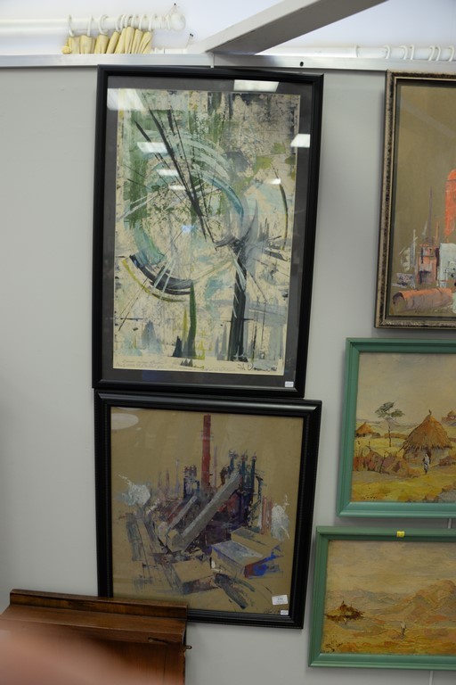 Seven framed paintings: five Alfred Vetromile mixed media on paper including Abstract, Crane Building, Bombs Away Berlin, Space, etc., along with two South American palette knife oil paintings, one signed Gaddi. sizes: 15 x 20 to 25 16 Provenance: Estate of Arthur C. Pinto, MD