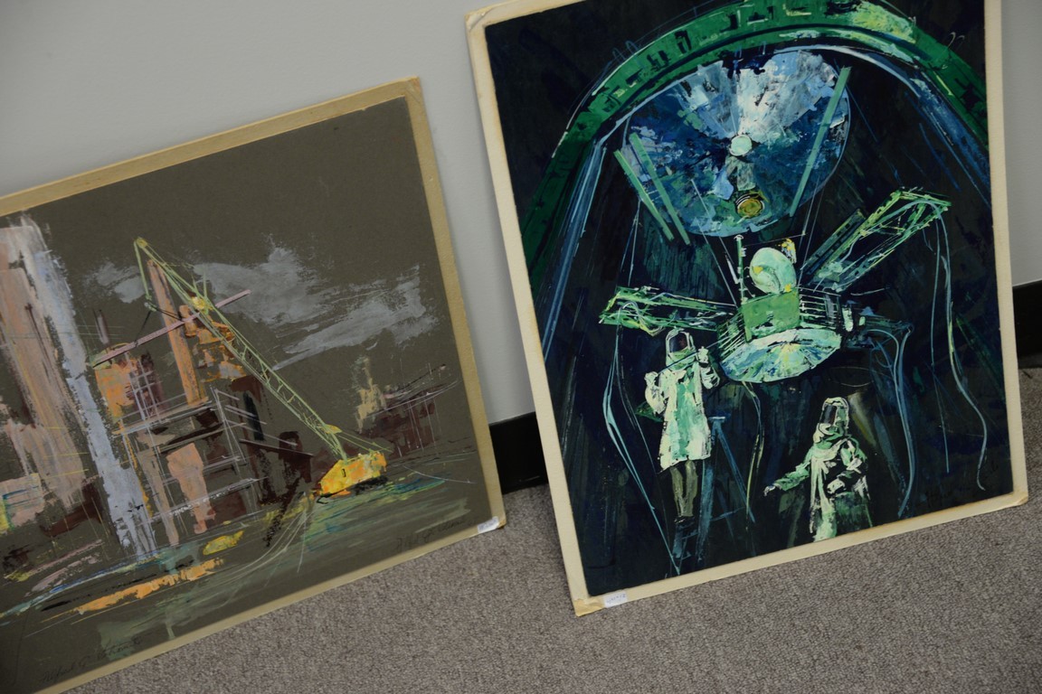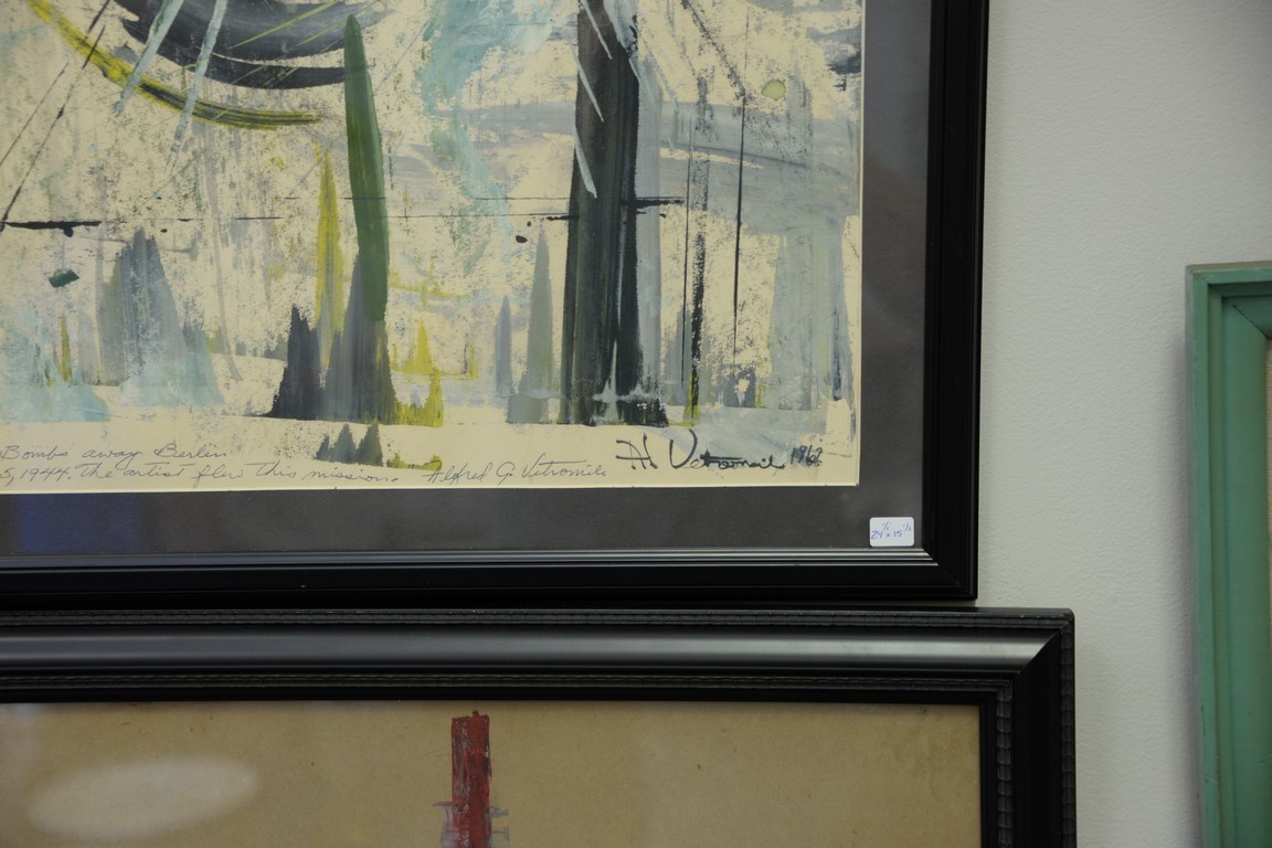 Lot 332: Seven framed paintings: five Alfred Vetromile mixed media on paper including Abstract, Crane Building, Bombs Away Berlin, Space, etc…
