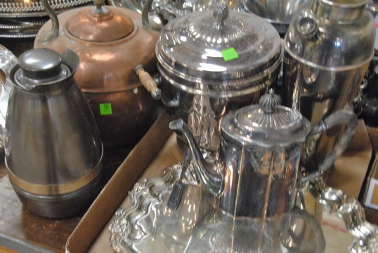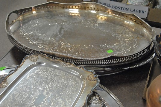 Silverplated lot including ten trays one with gallery, bowl, tea pot, etc.