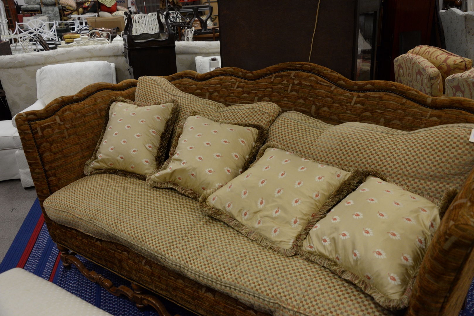 Stanford Furniture Company Continental Style Upholstered Sofa, height 41 inches, length 83 inches, depth 40 inches.