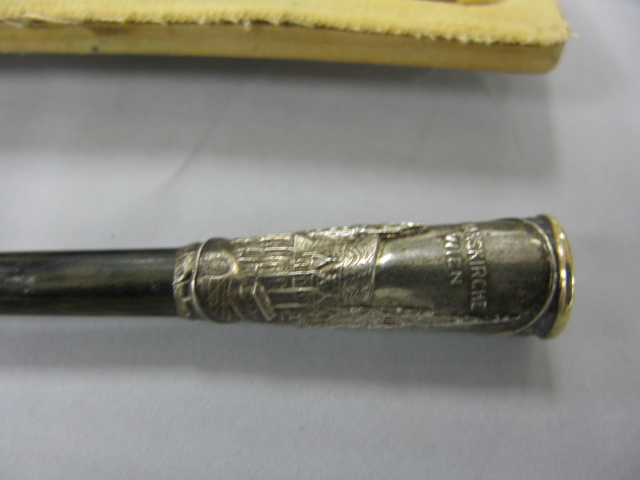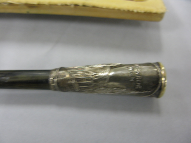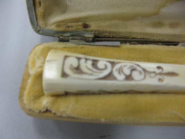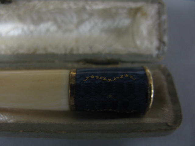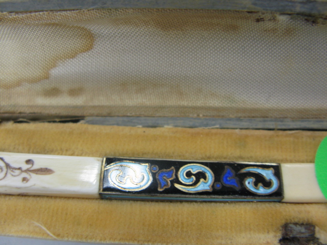 Three ivory cigarette holders, two with enameling and one with a silver tip.