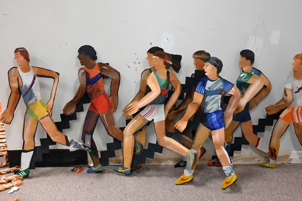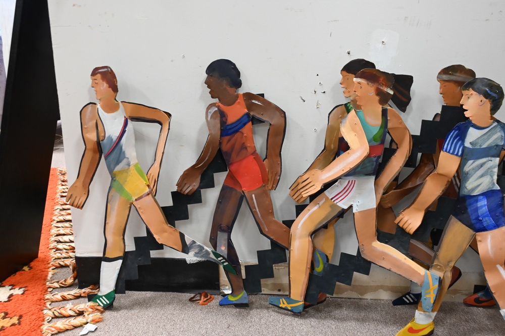 Lot 332: Timothy Woodman (American, 1952 – 2018), foot race, 1983, oil on aluminum in three parts, overall 26″ x 95″ x 4″.