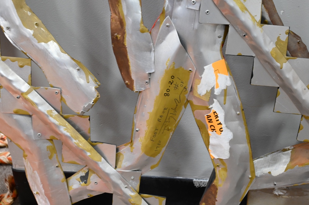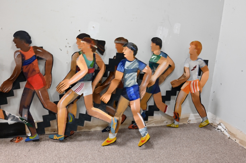 Timothy Woodman (American, 1952 – 2018), foot race, 1983, oil on aluminum in three parts, overall 26″ x 95″ x 4″.