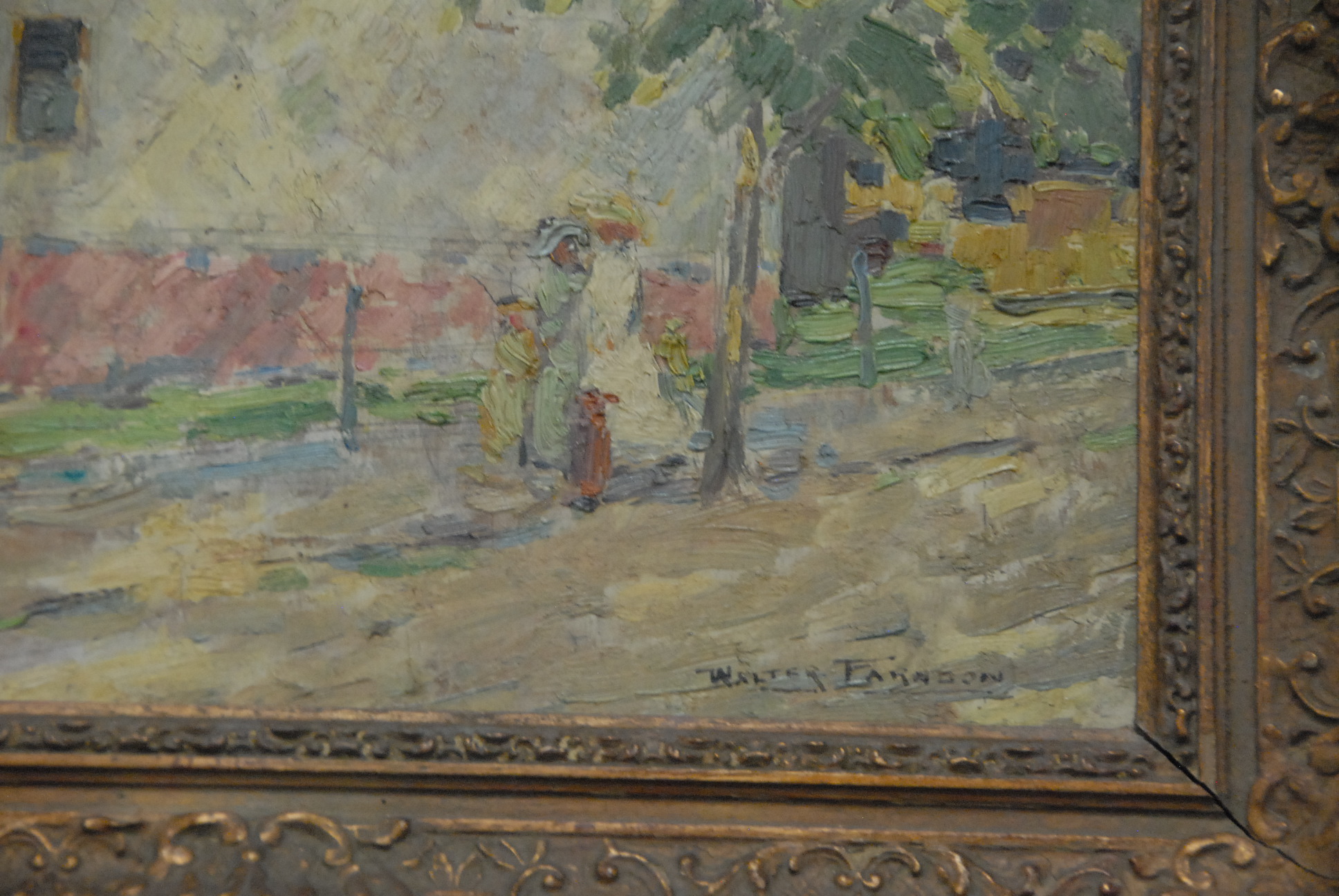 Lot 332: Walter Farndon 1876-1964 A SUMMER AFTERNOON WHITE HOUSE IN SUNLIGHT oil on panel signed lower right Walter Farndon sketch on verso 12 x 16