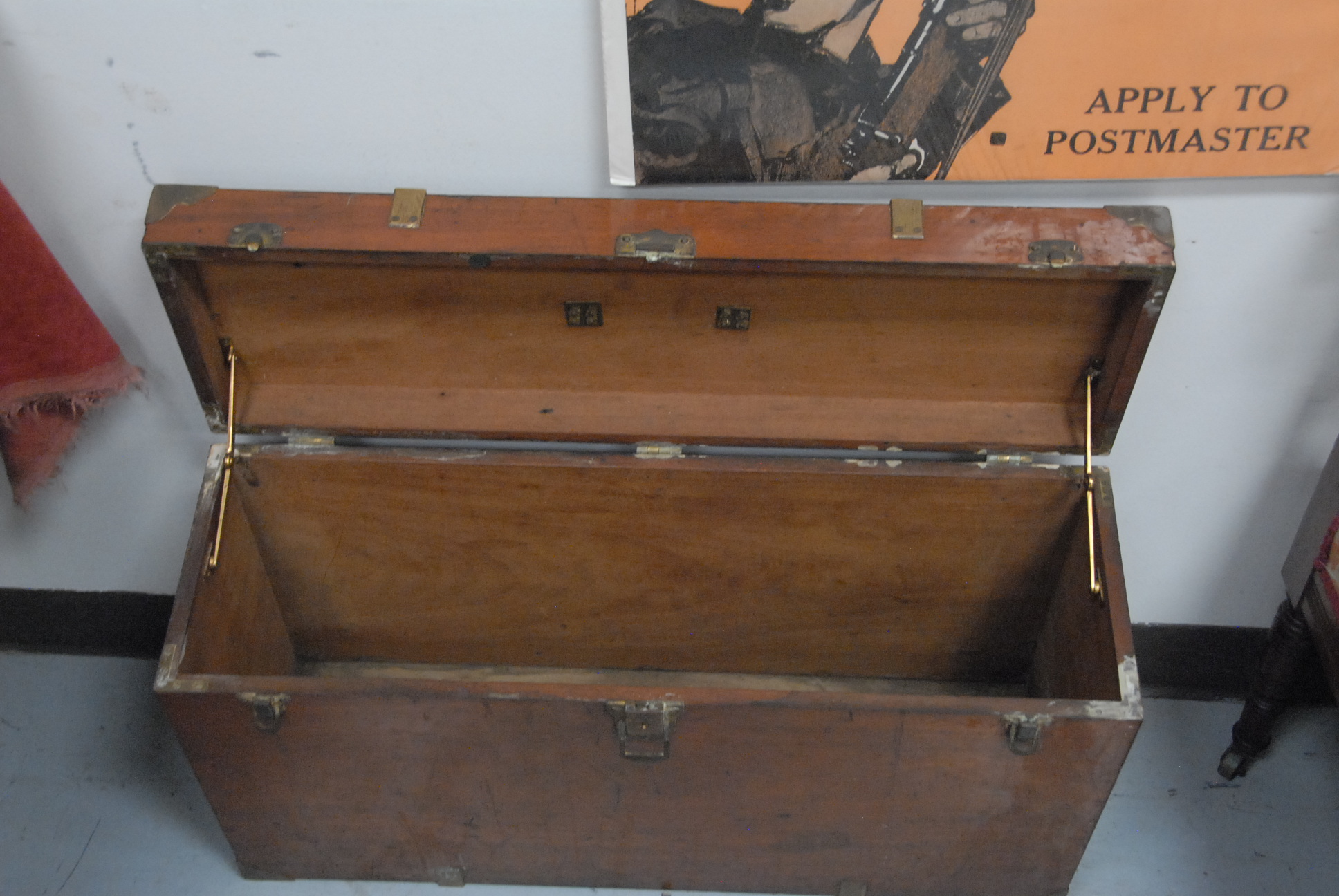 Lot 333: Brass bound lift top chest marked on plaque Nu Yorkas Zihnas Beedri, ht. 16 1/2in. lg. 29in. dp. 9in.