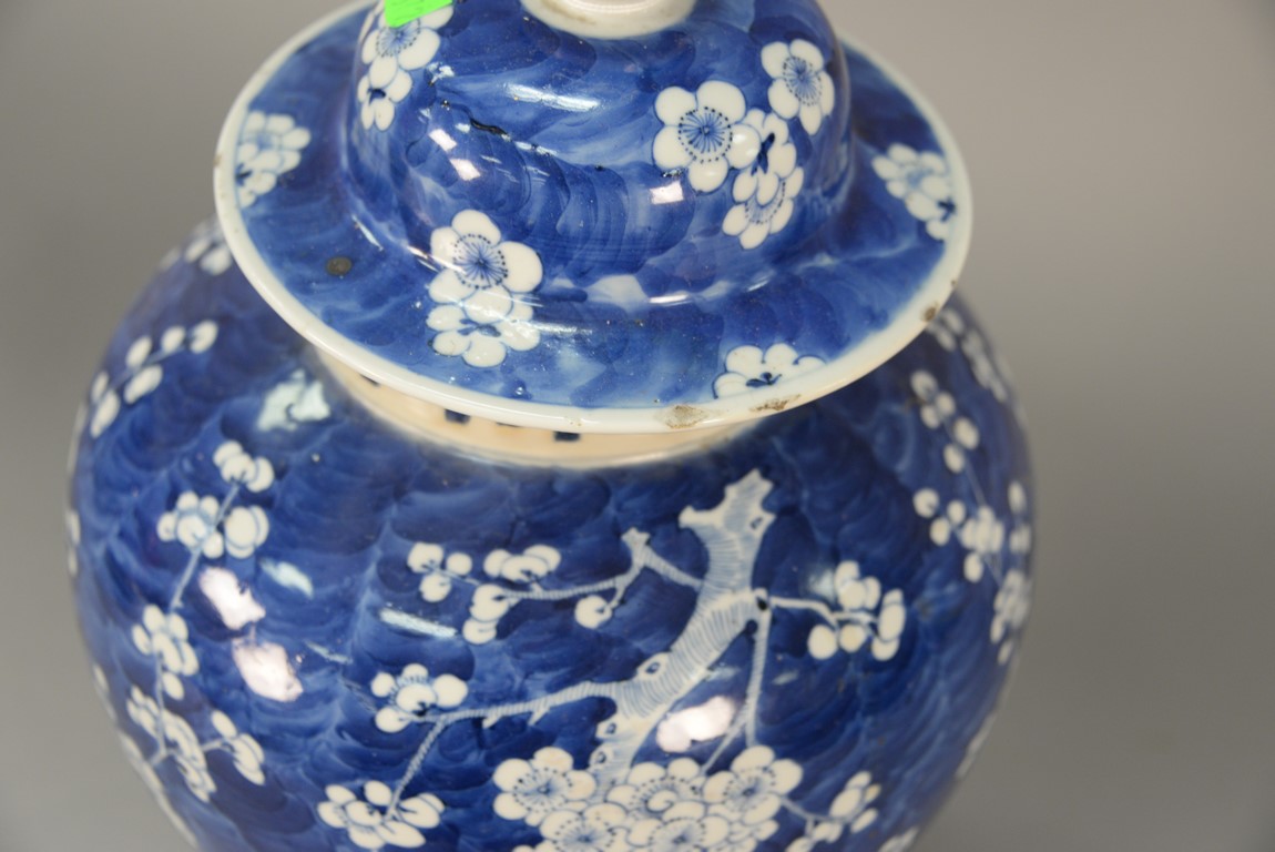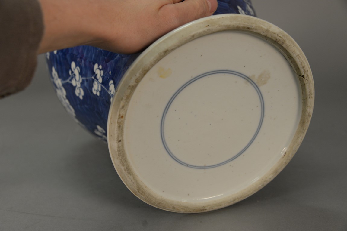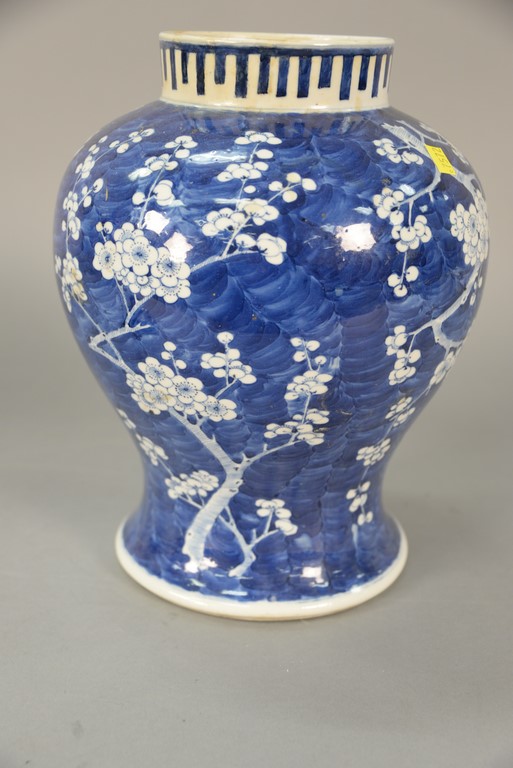 Lot 333: Chinese blue and white apple blossom ginger jar with cover top rim broken and repaired and small chips on cover. ht. 17 in.