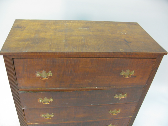 Federal tiger maple four drawer chest with flat fluted columns on French feet.