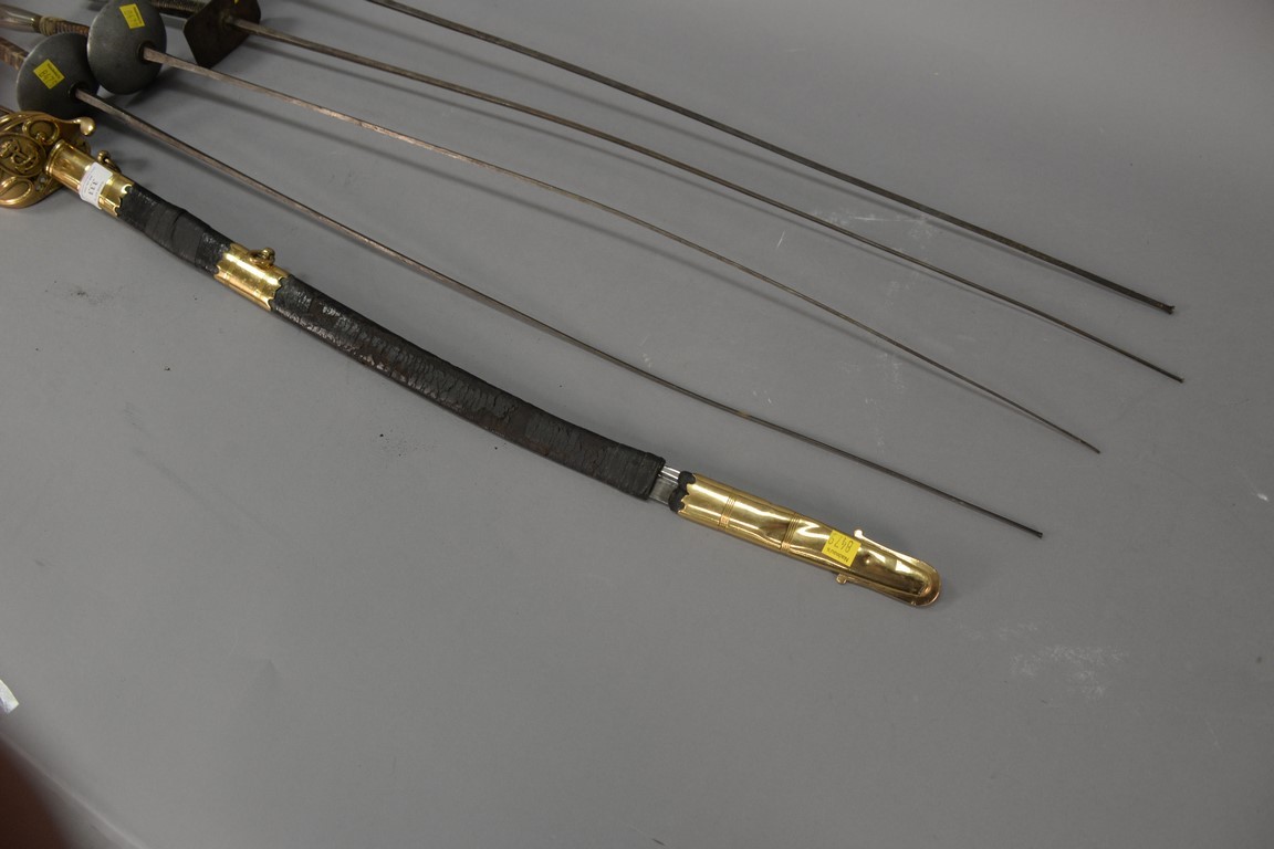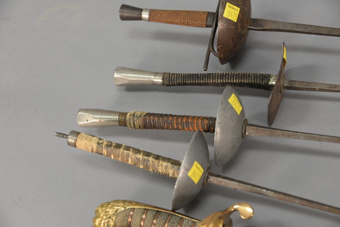 Lot 333: Five swords including fencing sword marked Sollinger, two fencing swords made in France, fencing sword marked illegibly, and a Gurne…