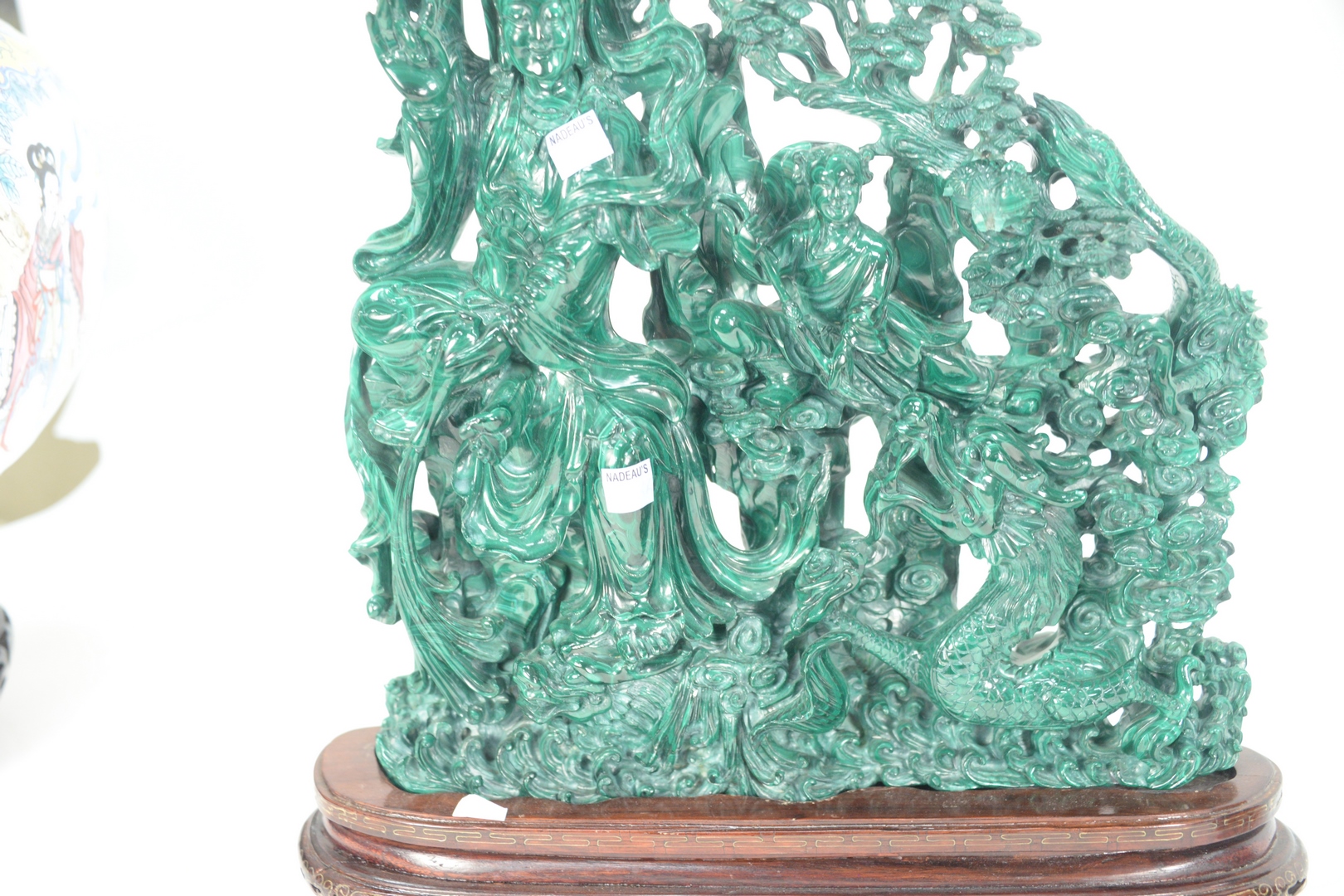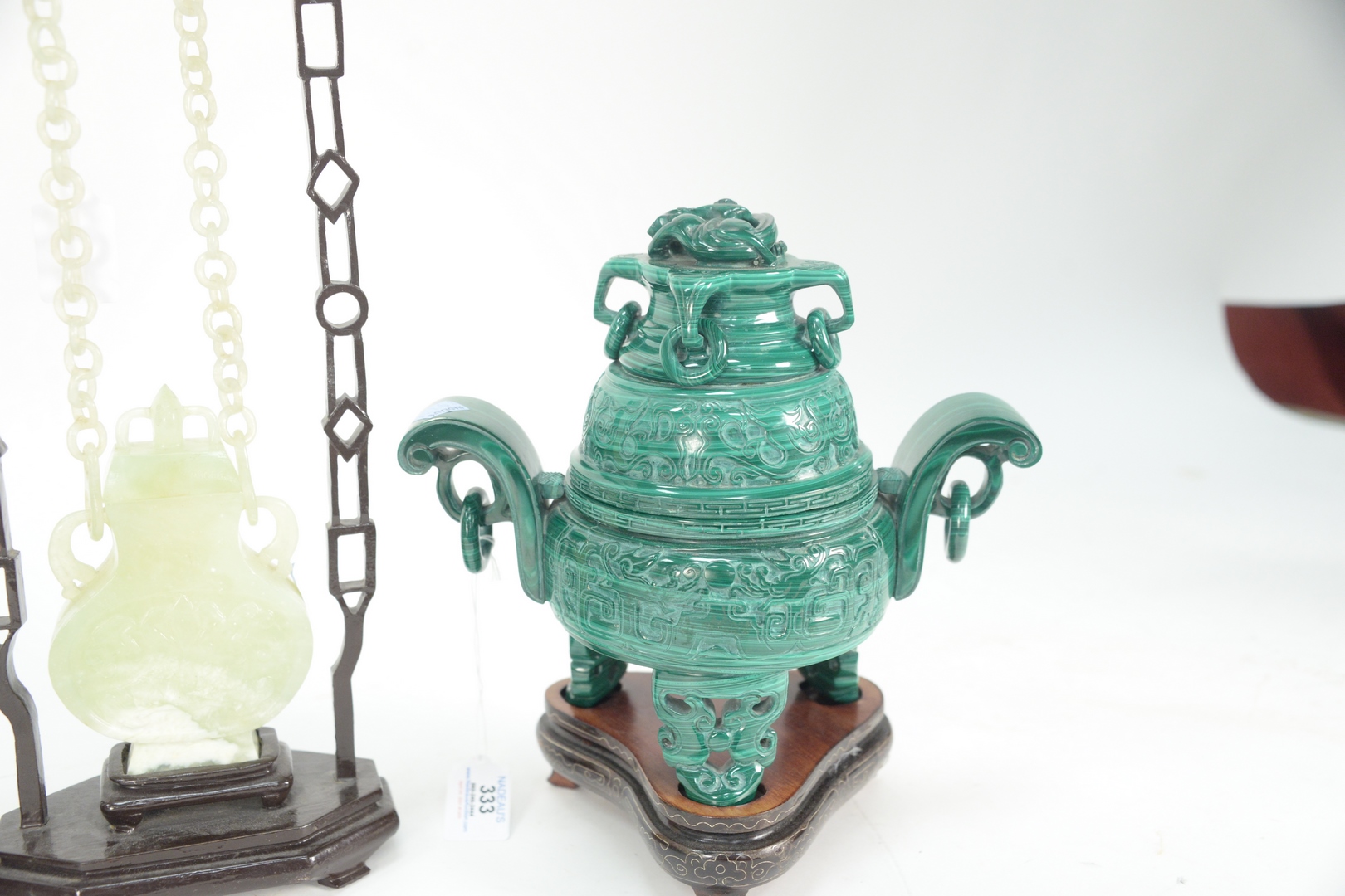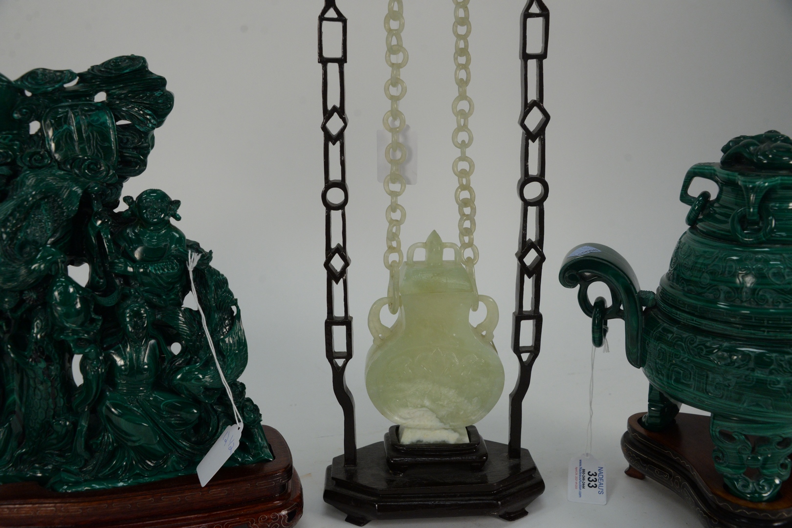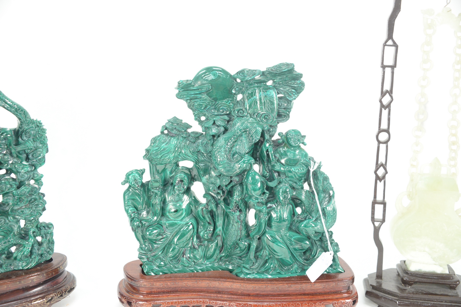 Lot 333: Four Piece Carved Malachite Group to include a censer with tripod base, a large figural group, a smaller figural group with scrolling vine and birds, along with a Jade urn with stand, height of censer 11 inches, large figural group 17 x 13.