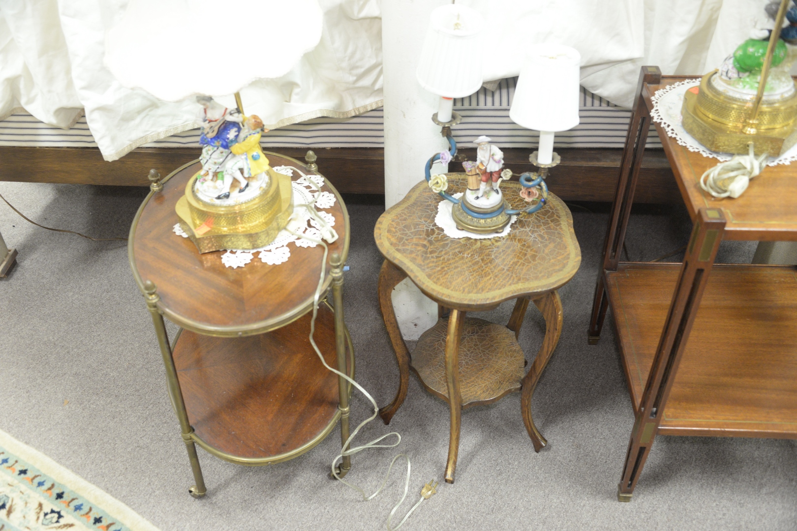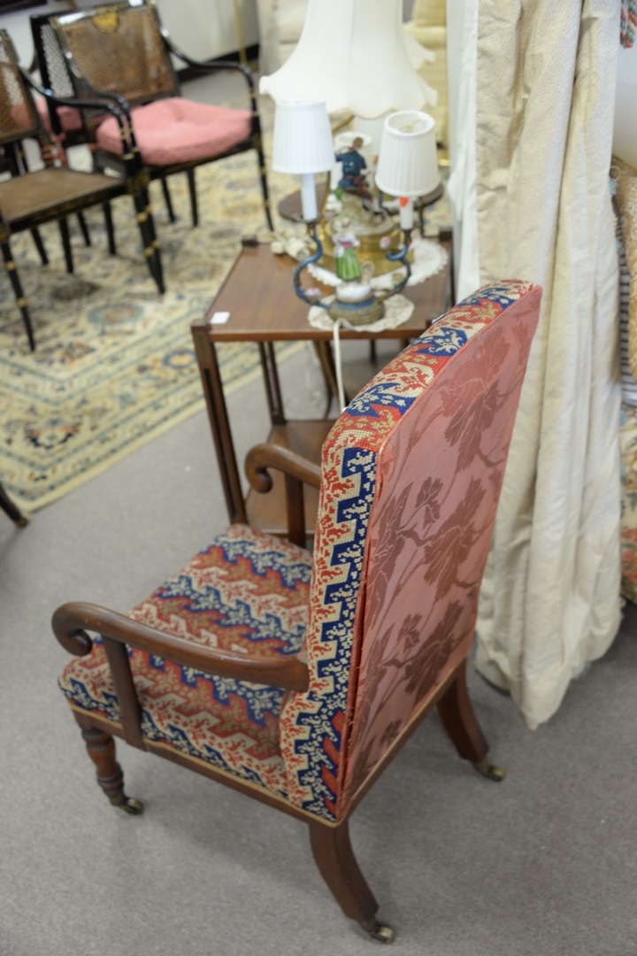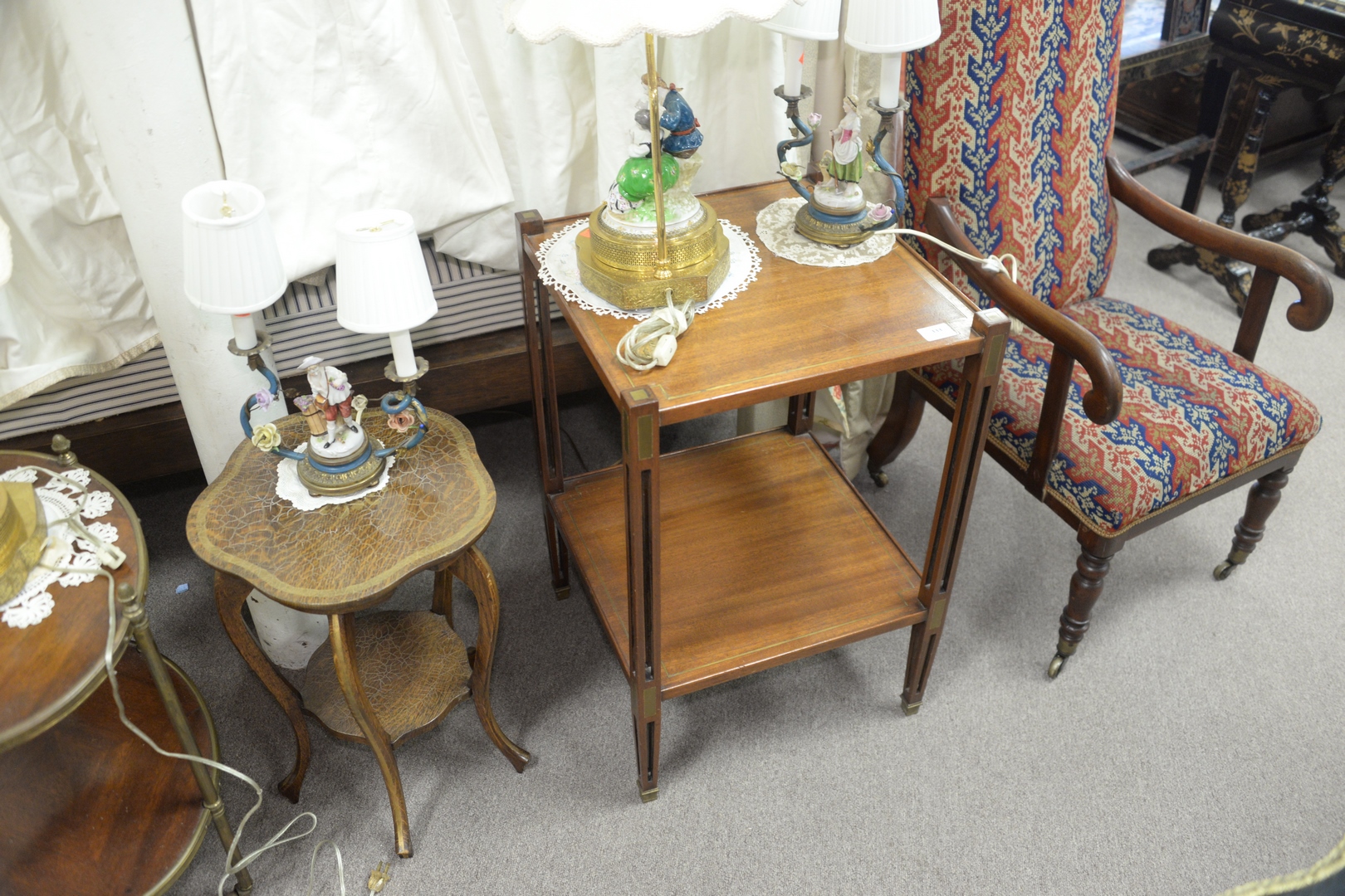 Four Piece Lot, to include child’s armchair with needlepoint upholstery, height 36 inches along with three mahogany stands including oval brass bound French stand.