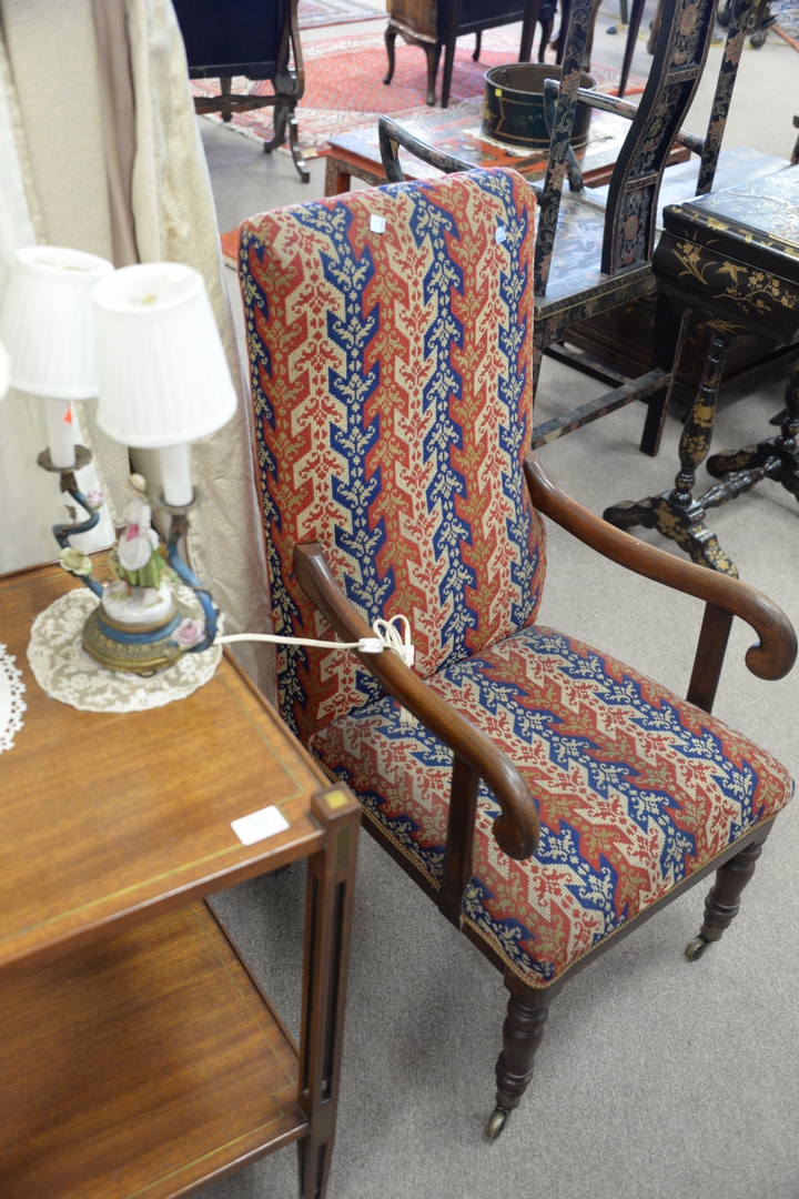 Lot 333: Four Piece Lot, to include child’s armchair with needlepoint upholstery, height 36 inches along with three mahogany stands includin…