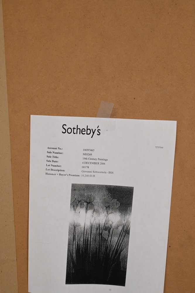 Giovanni Sottocornola (1855 – 1917), Iris, pastel, signed and dated top center GS 1898, sight size 29 1/2″ x 18″. Provenance: Sold at Sotheby’s, December 4, 2006, Lot 178.