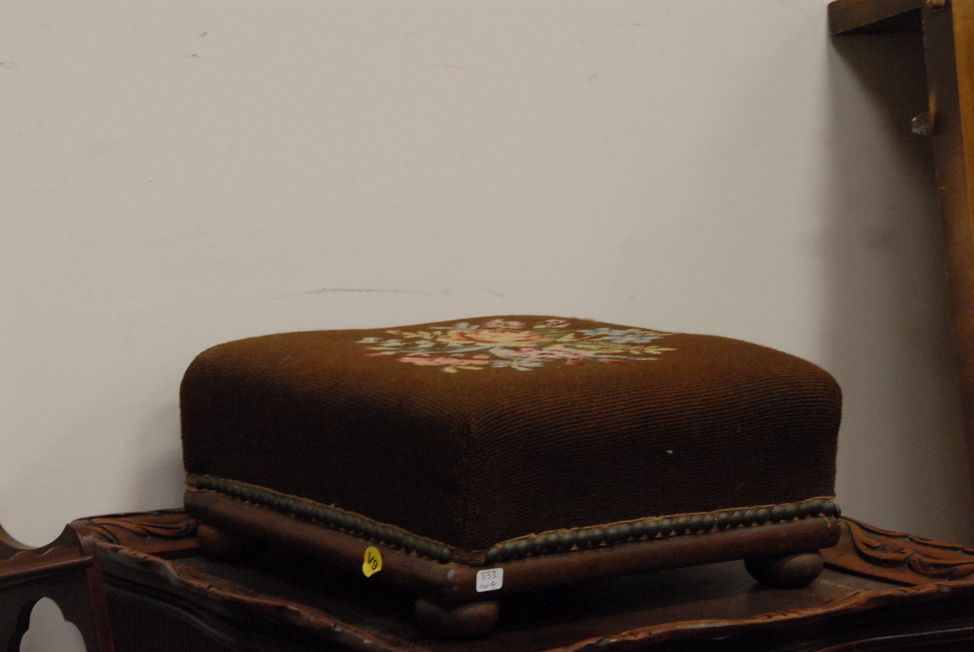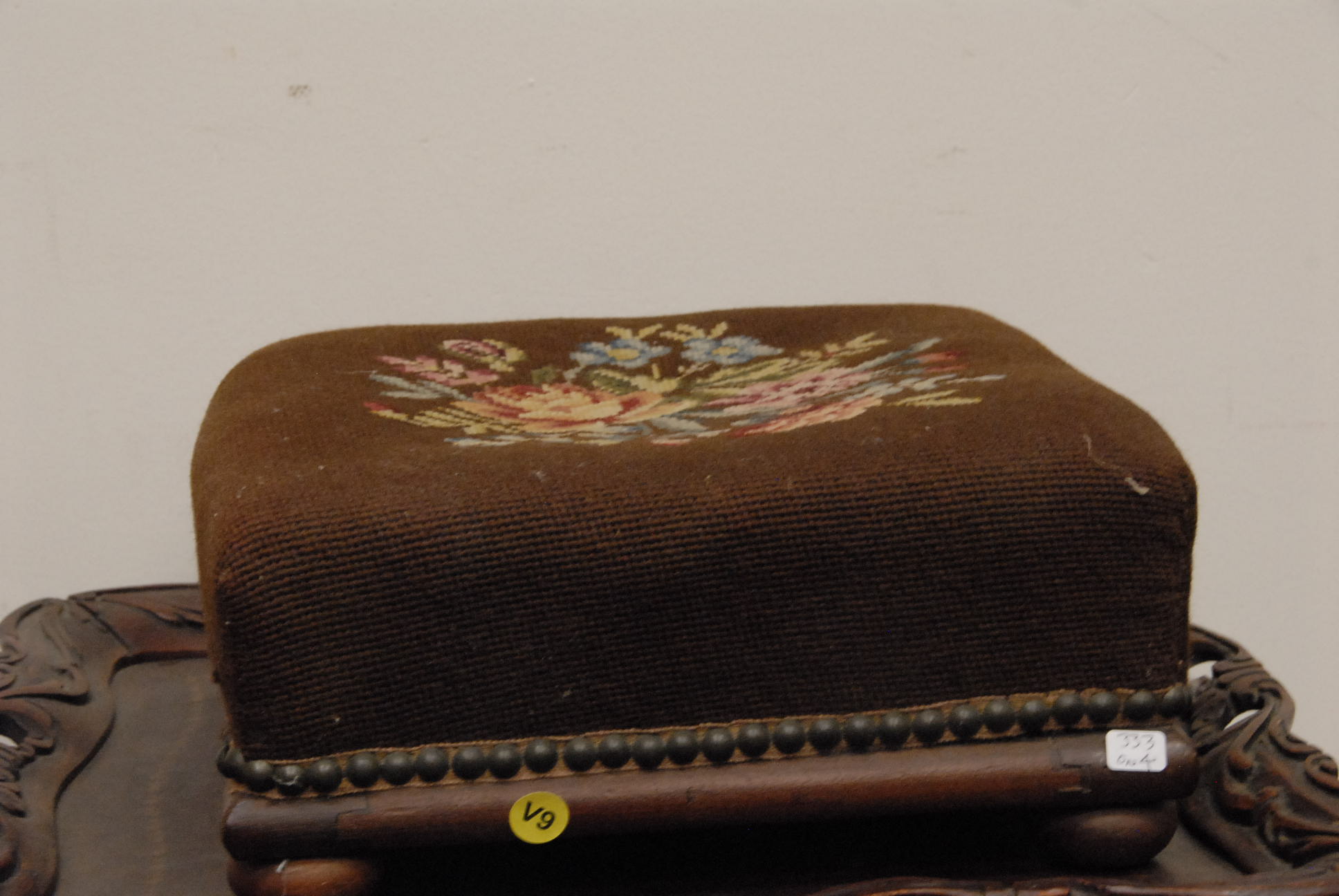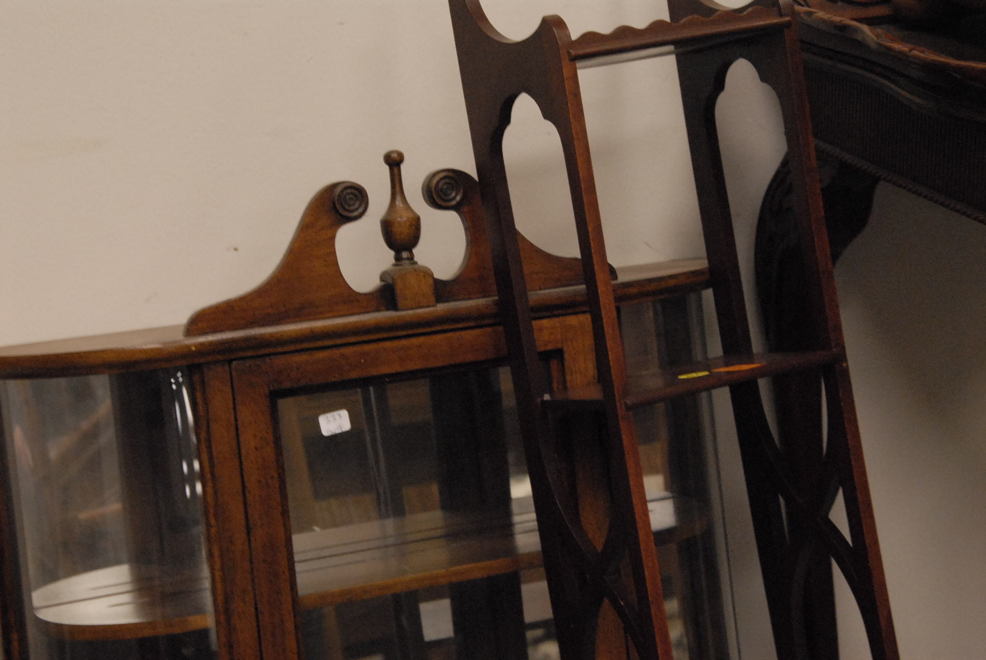 Group lot to include two footstools, a hanging curio cabinet and hanging shelf
