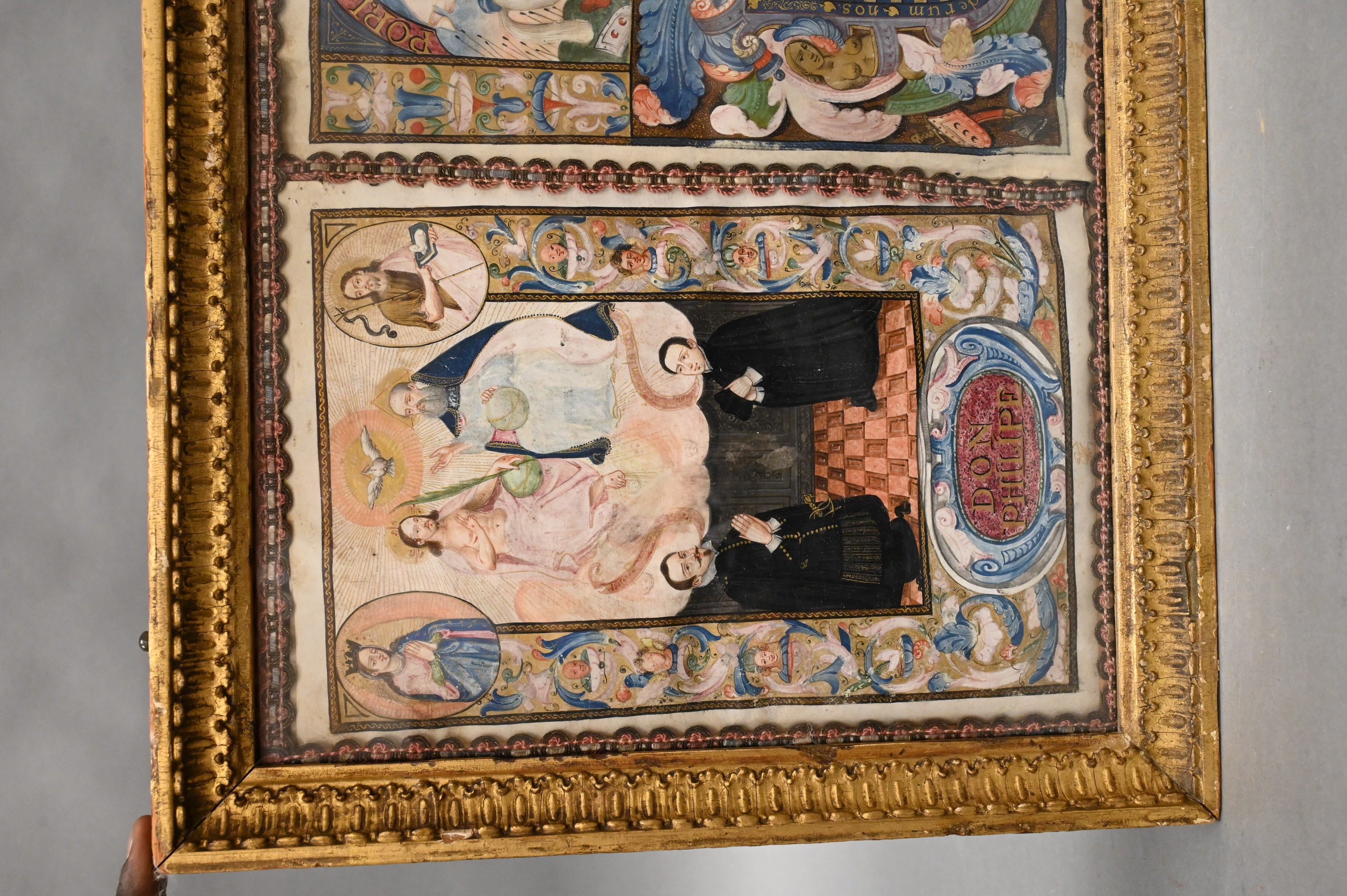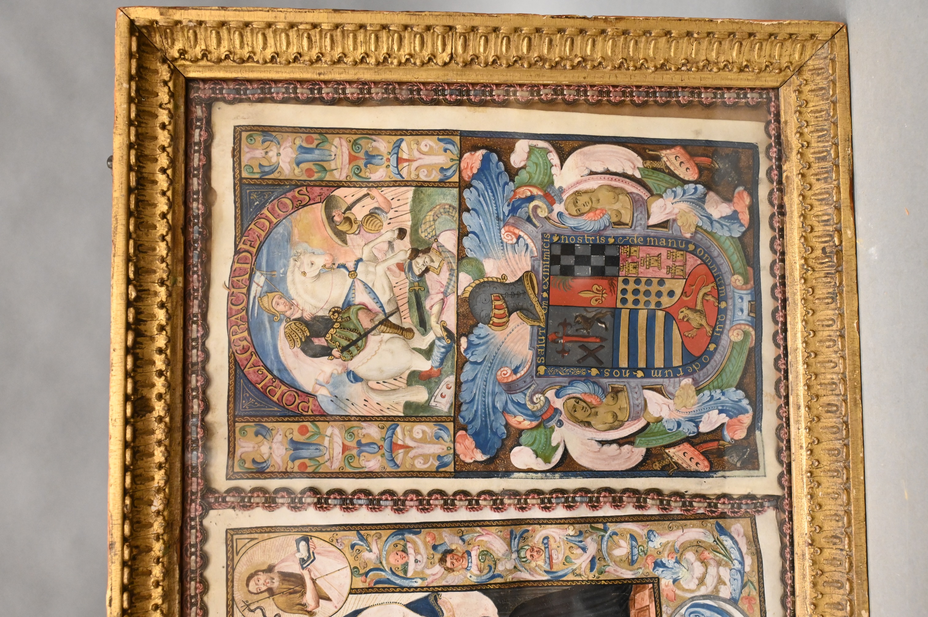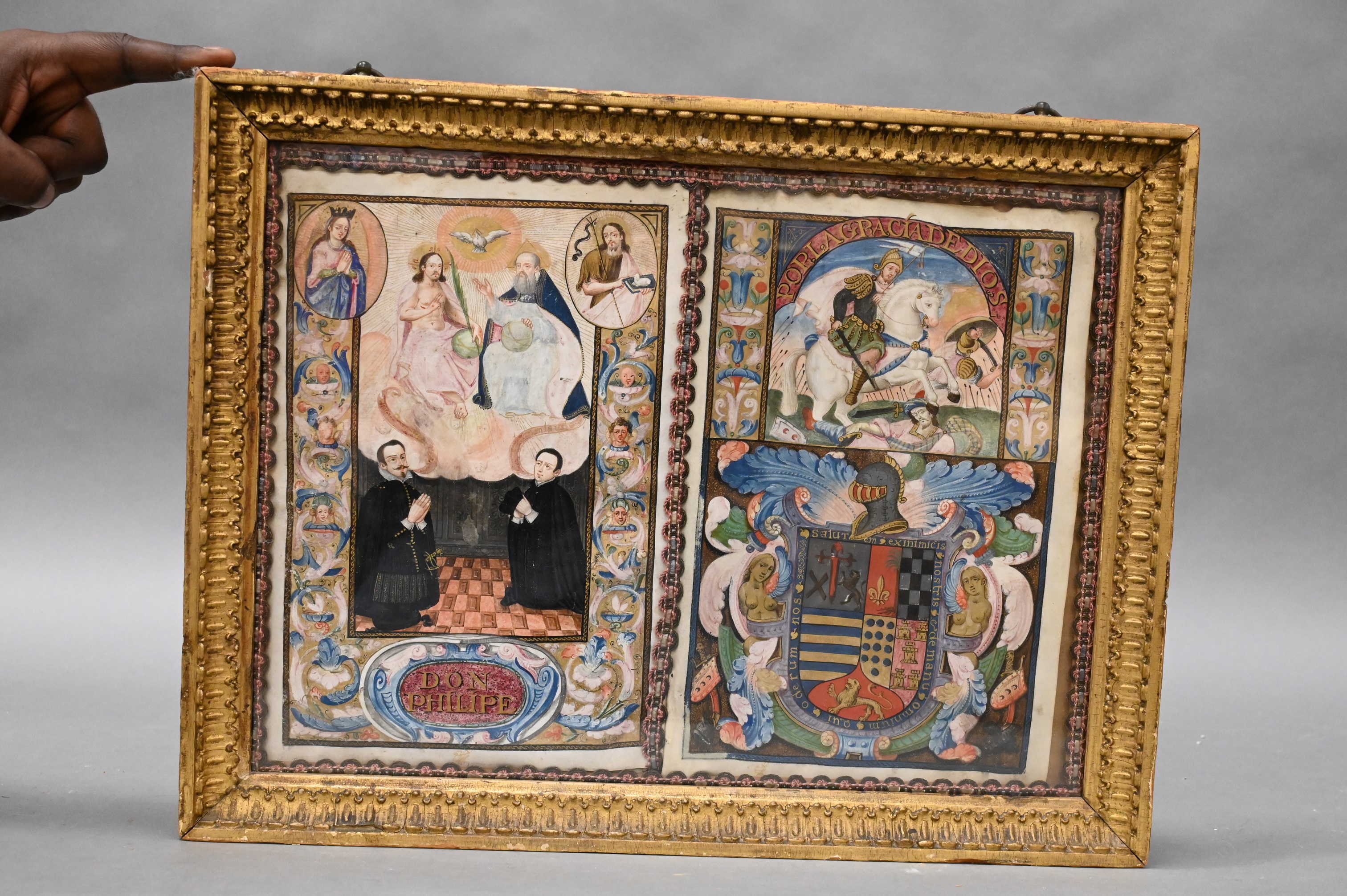 One page depicting The Holy Trinity over Spanish Royalty, the other page depicting a coat of arms and soldier on horseback