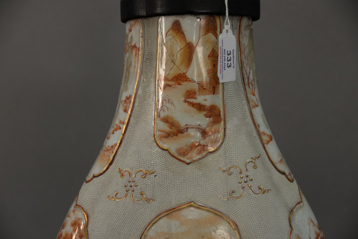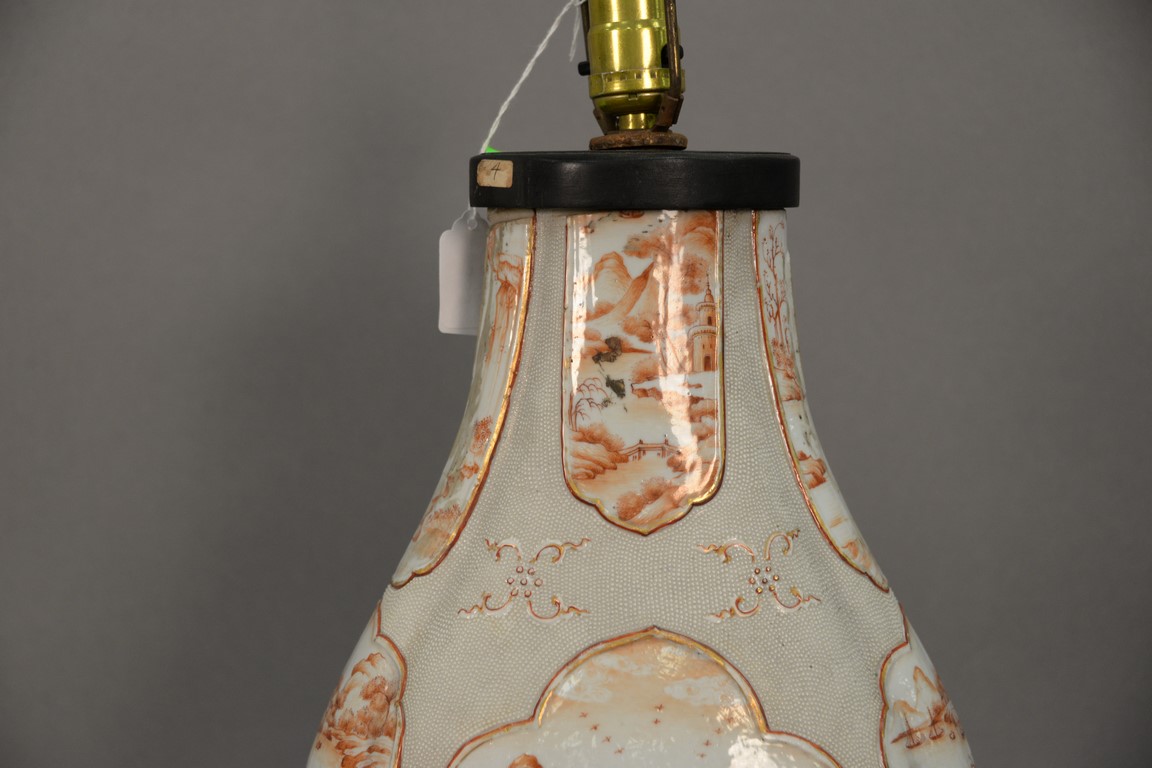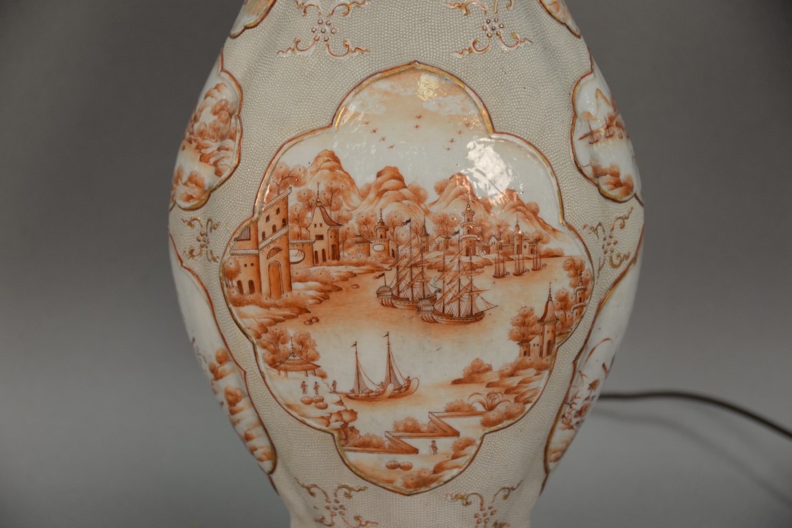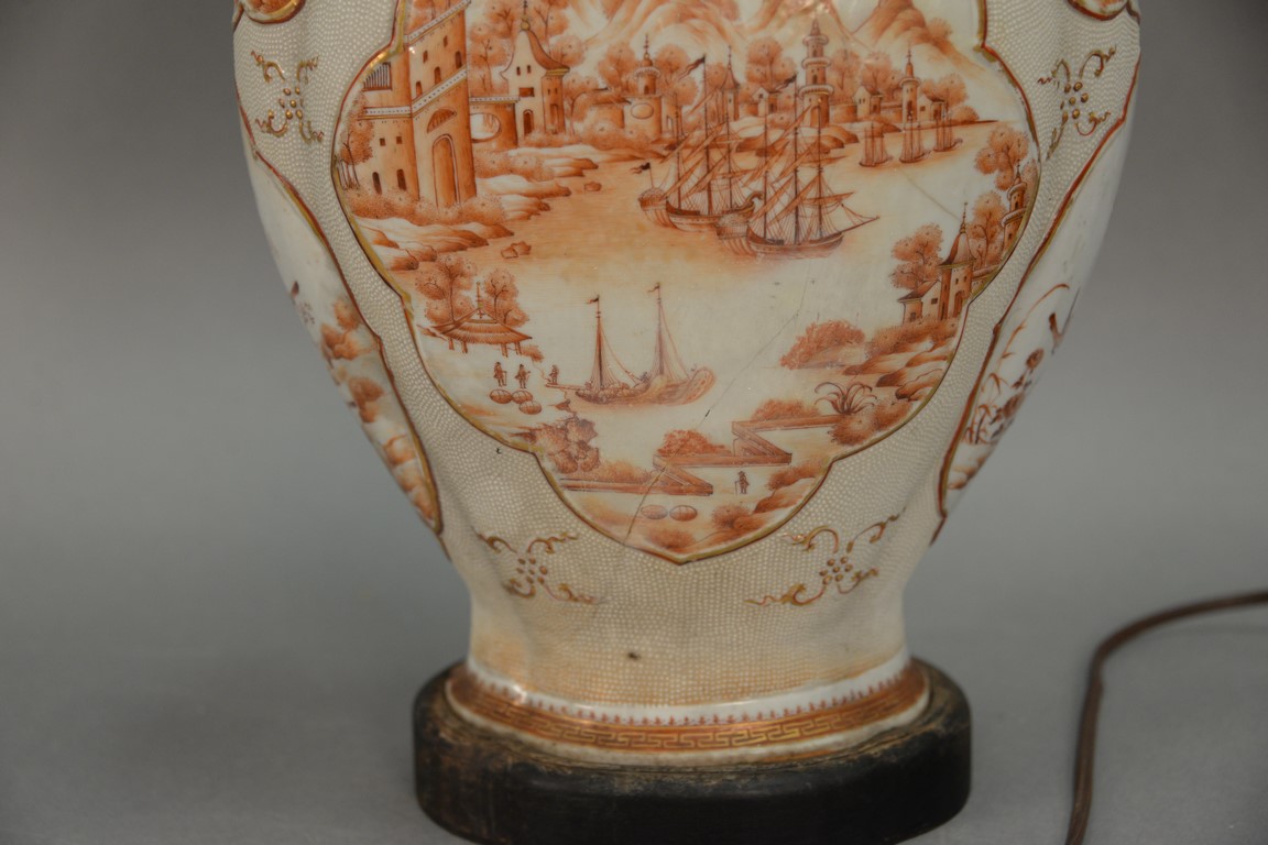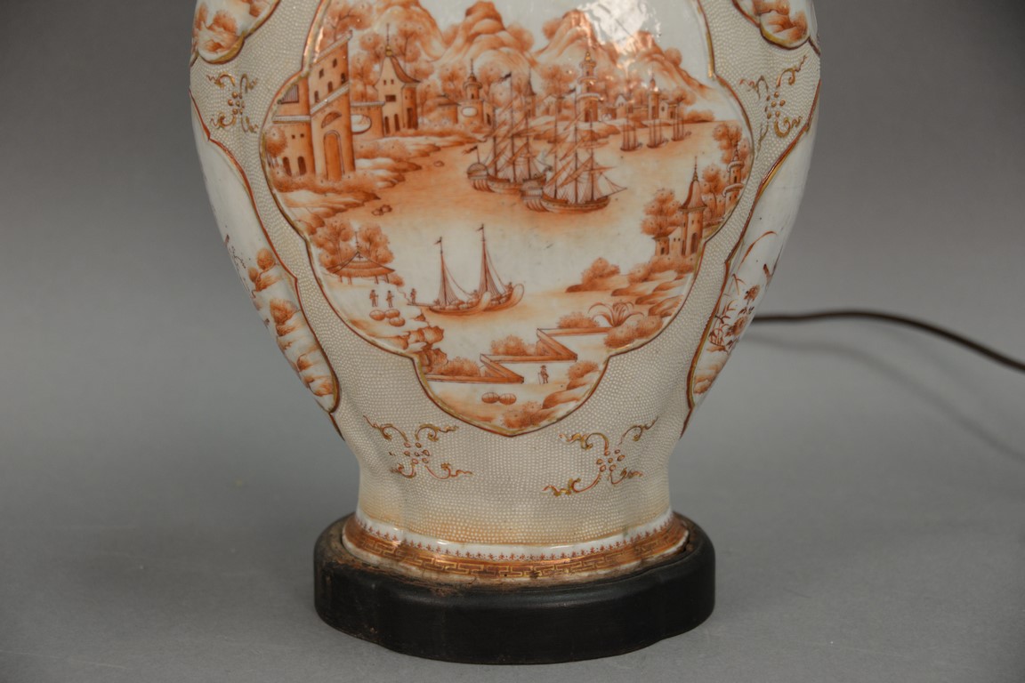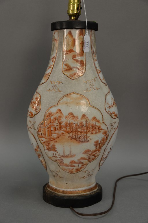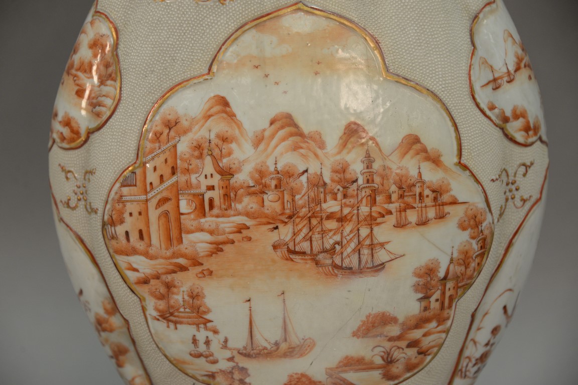 Lot 333: Large Chinese export porcelain vase having orange painted panels of landscapes and harbor scenes as is total ht. 29 1/2in.