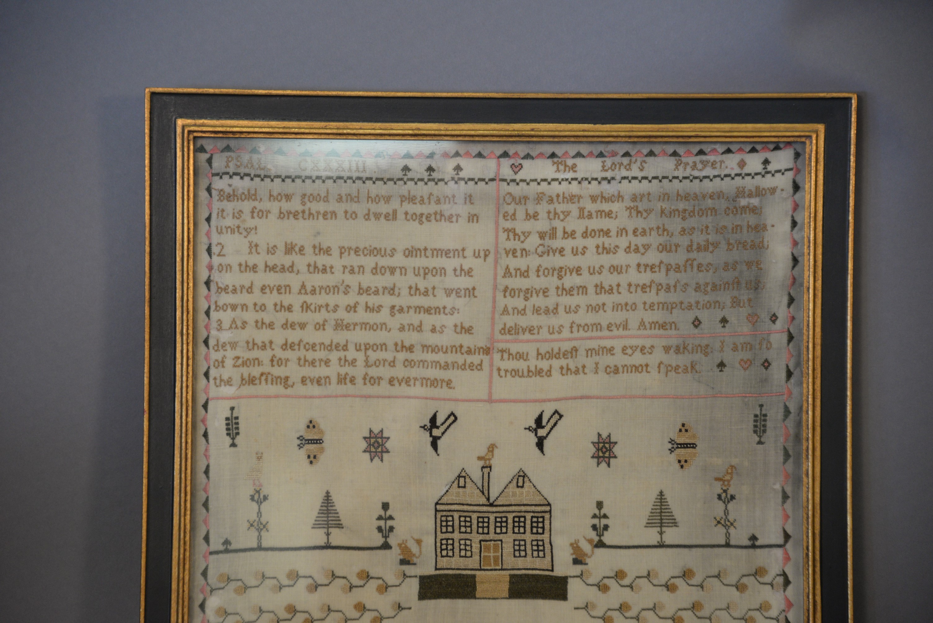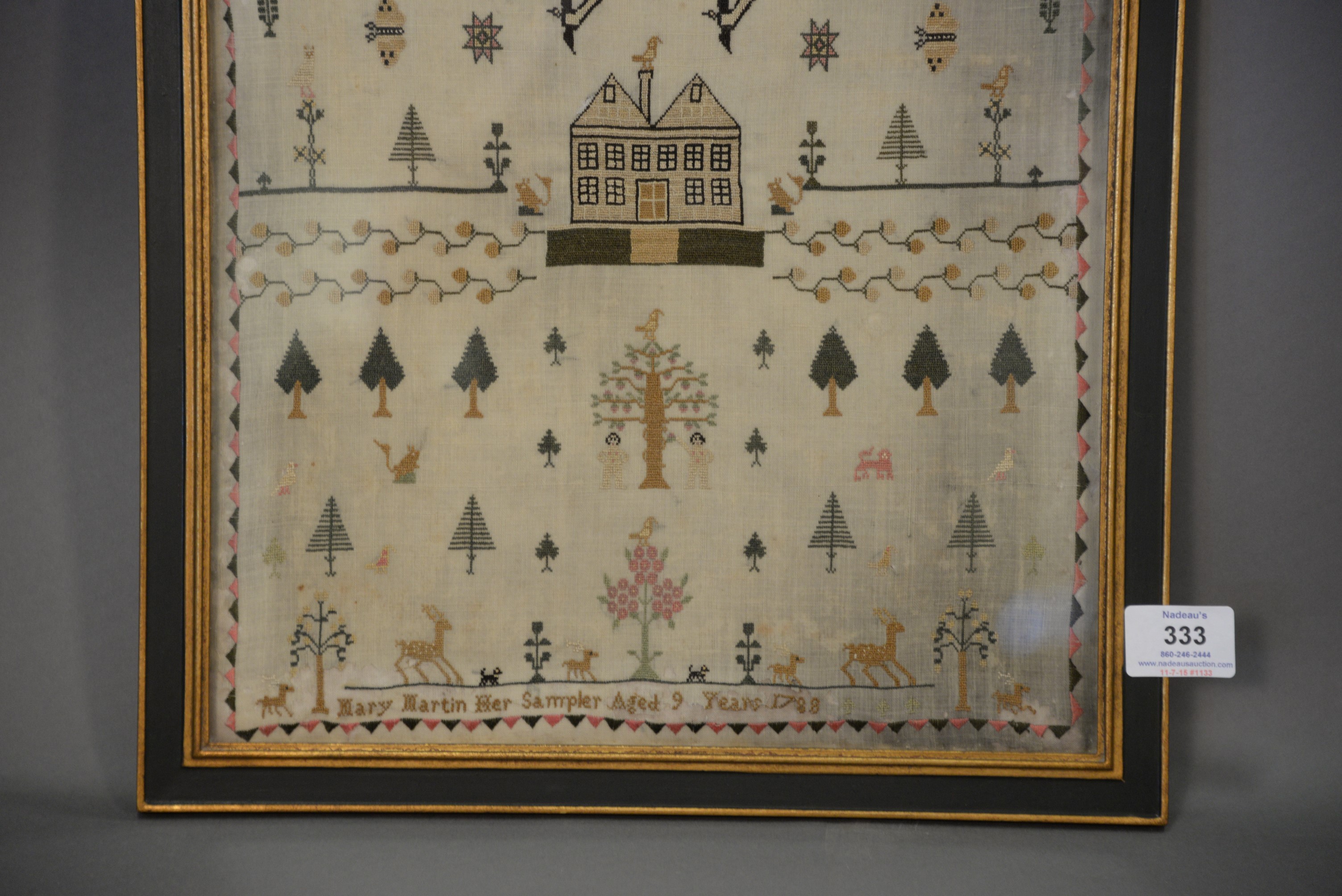 Needlework sampler marked Mary Martin 1788. 16 1/2 x 12 1/2