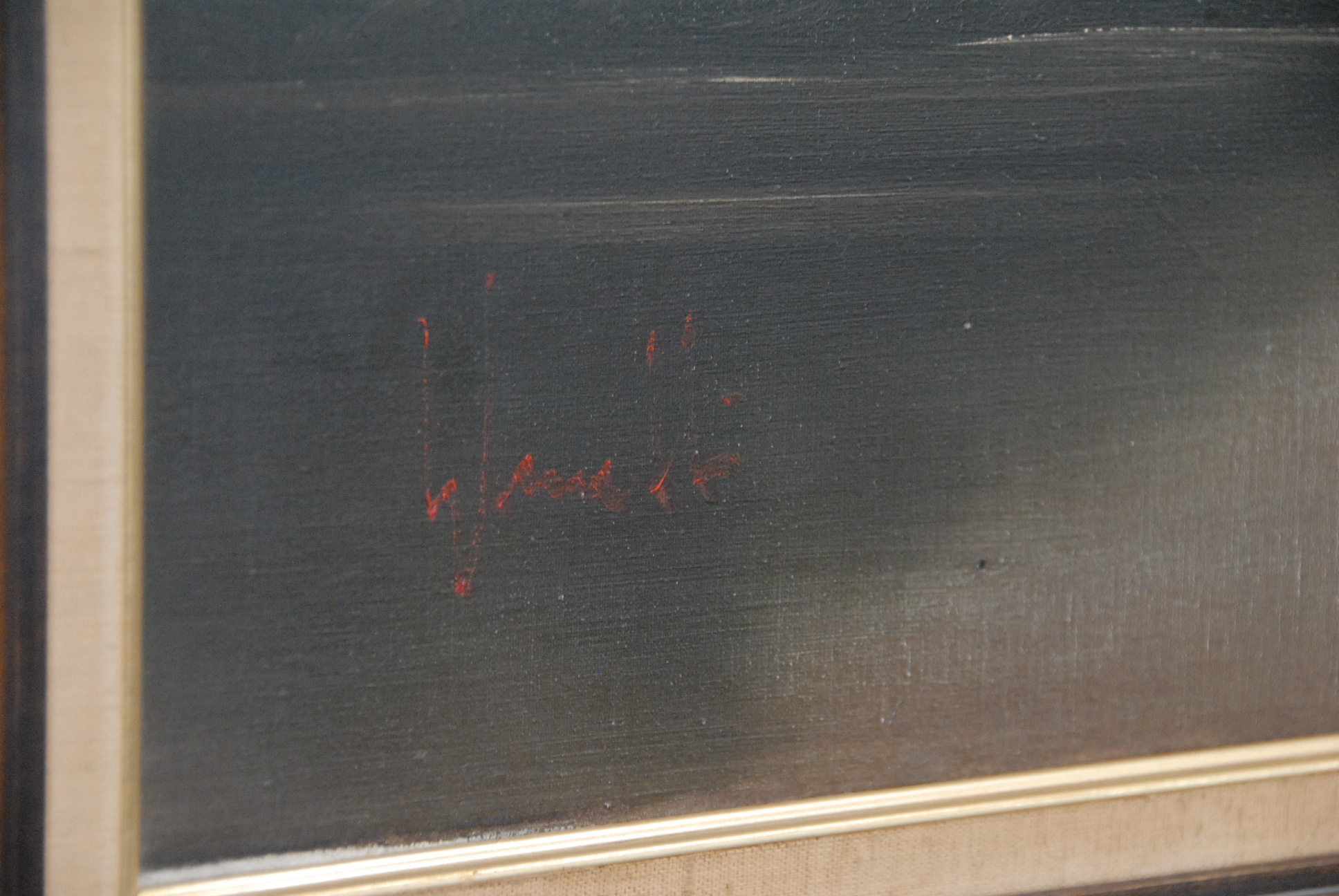 Oil on canvas landscape with castle signed indistinctly, 24 x 48.