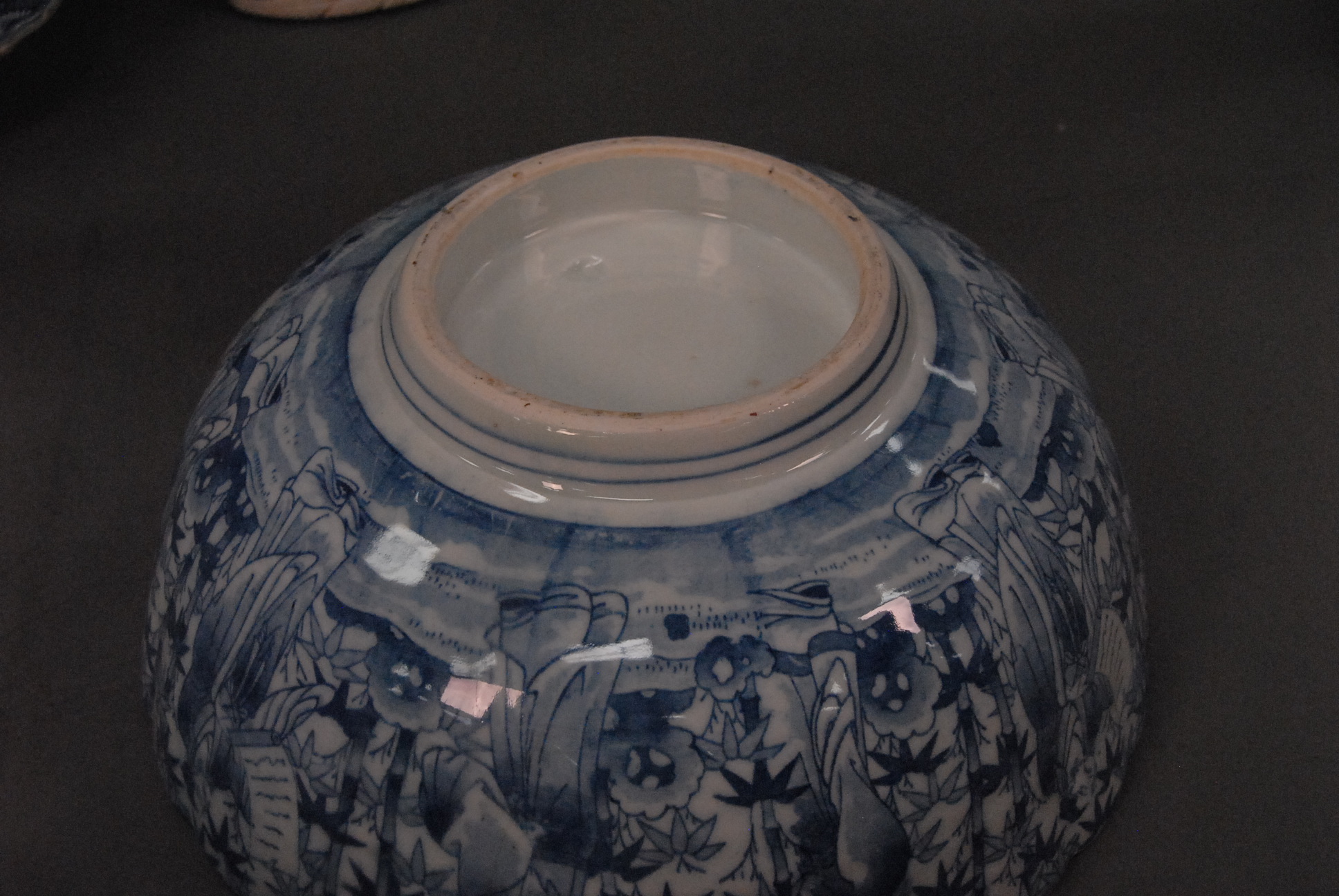 Oriental blue and white scalloped and footed bowl, ht. 6, dia. 14 1/2.