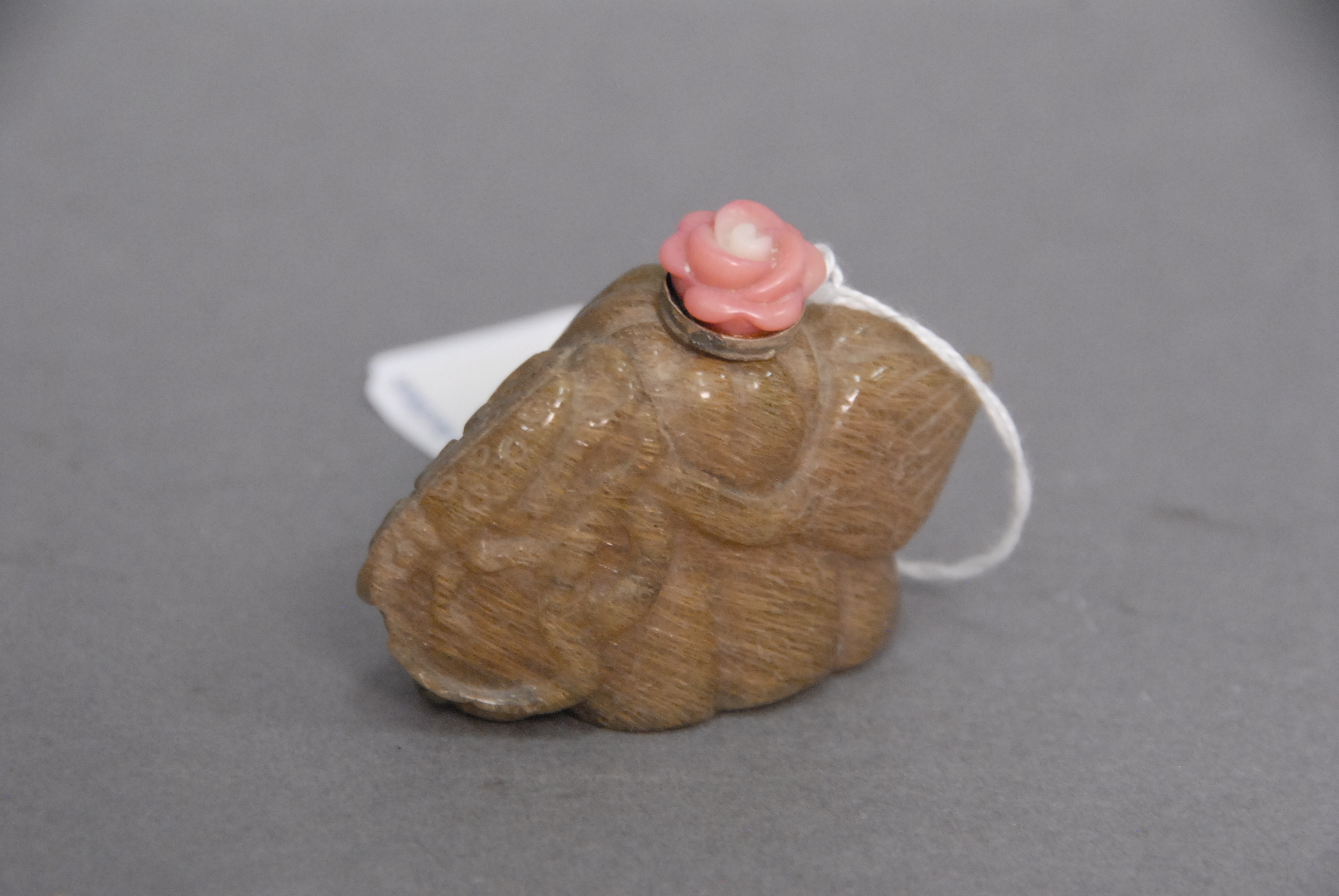 Lot 333: Rutilated quartz snuff bottle in squash form overall heavily rutilated with red glass top, 19th century, ht 1 .