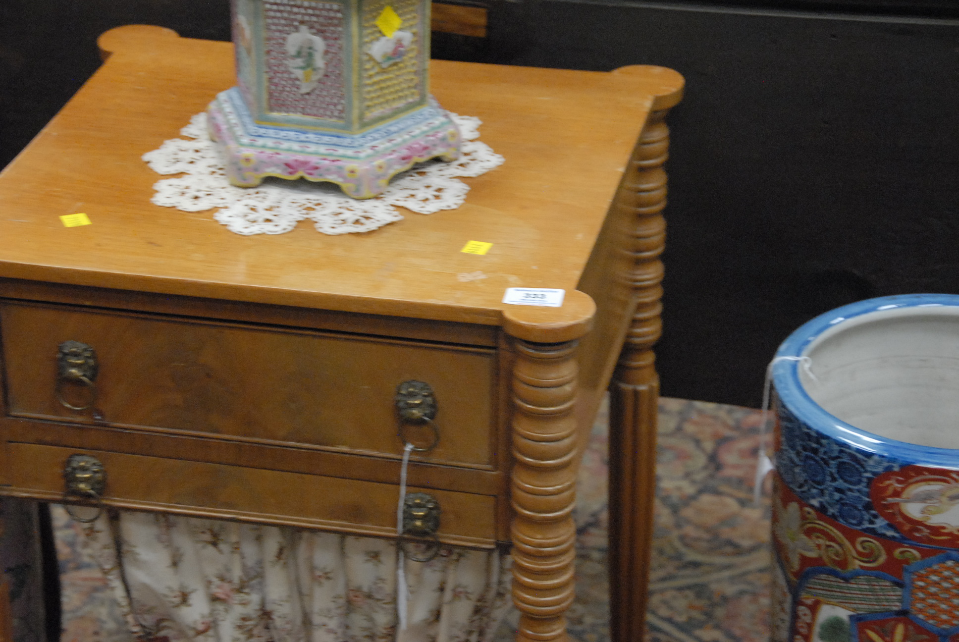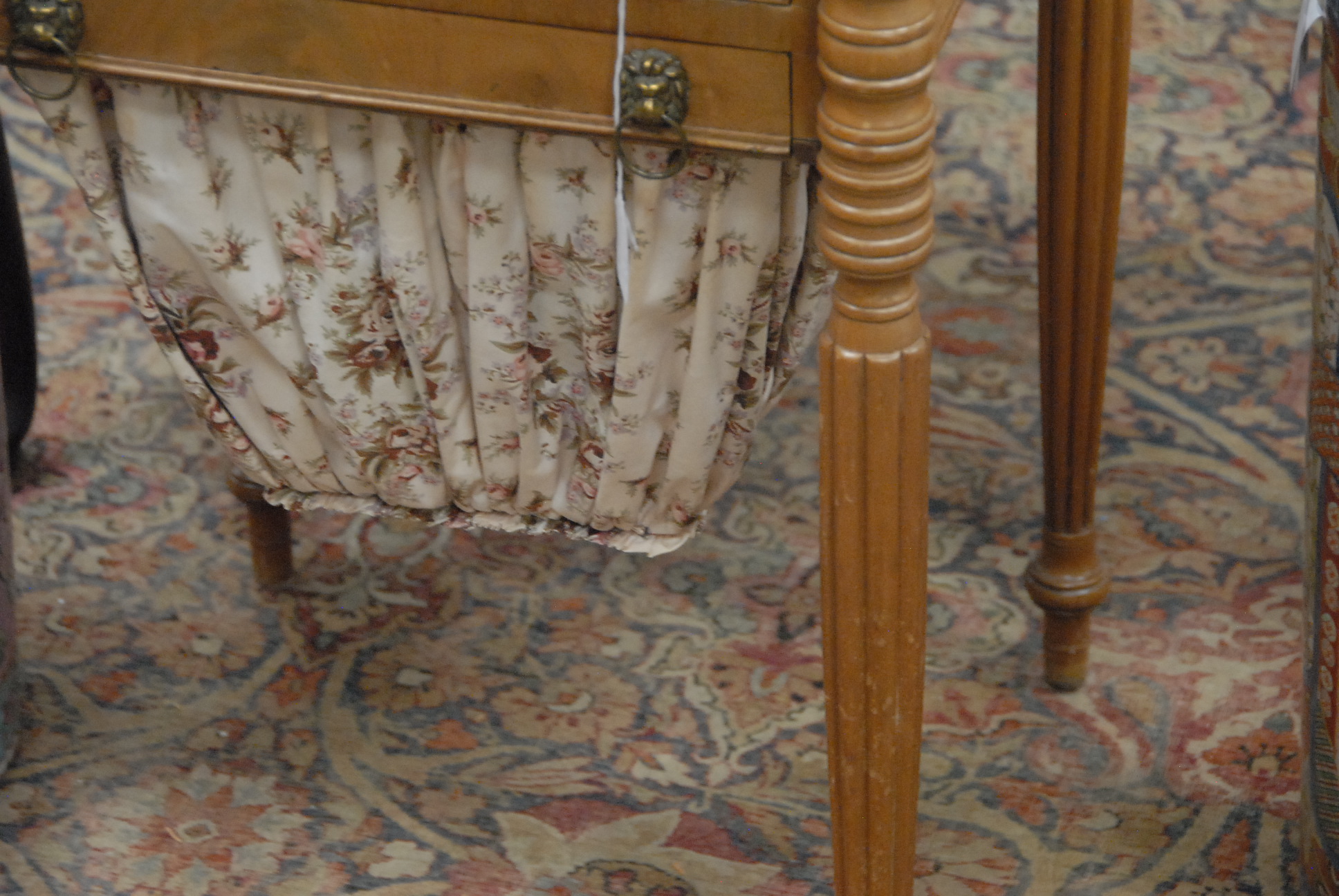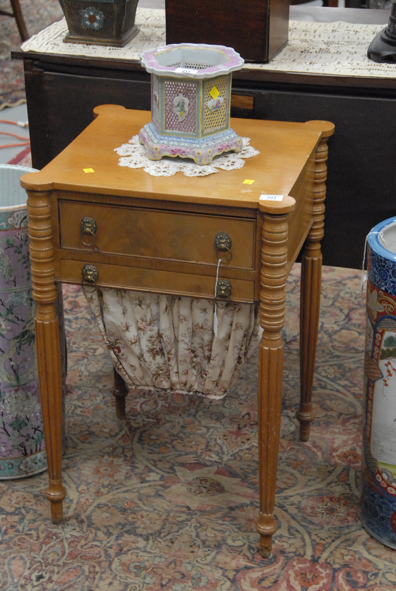 Lot 333: Sheraton mahogany sewing stand with drawer and bag, drawer top with turret corners, all set on turned and fluted legs in light finish. ht. 28 1/2in. wd. 17 1/2in. dp. 17 1/2in.