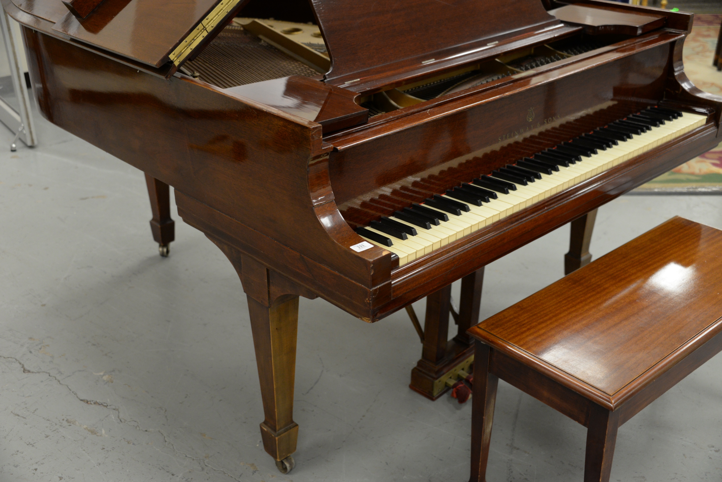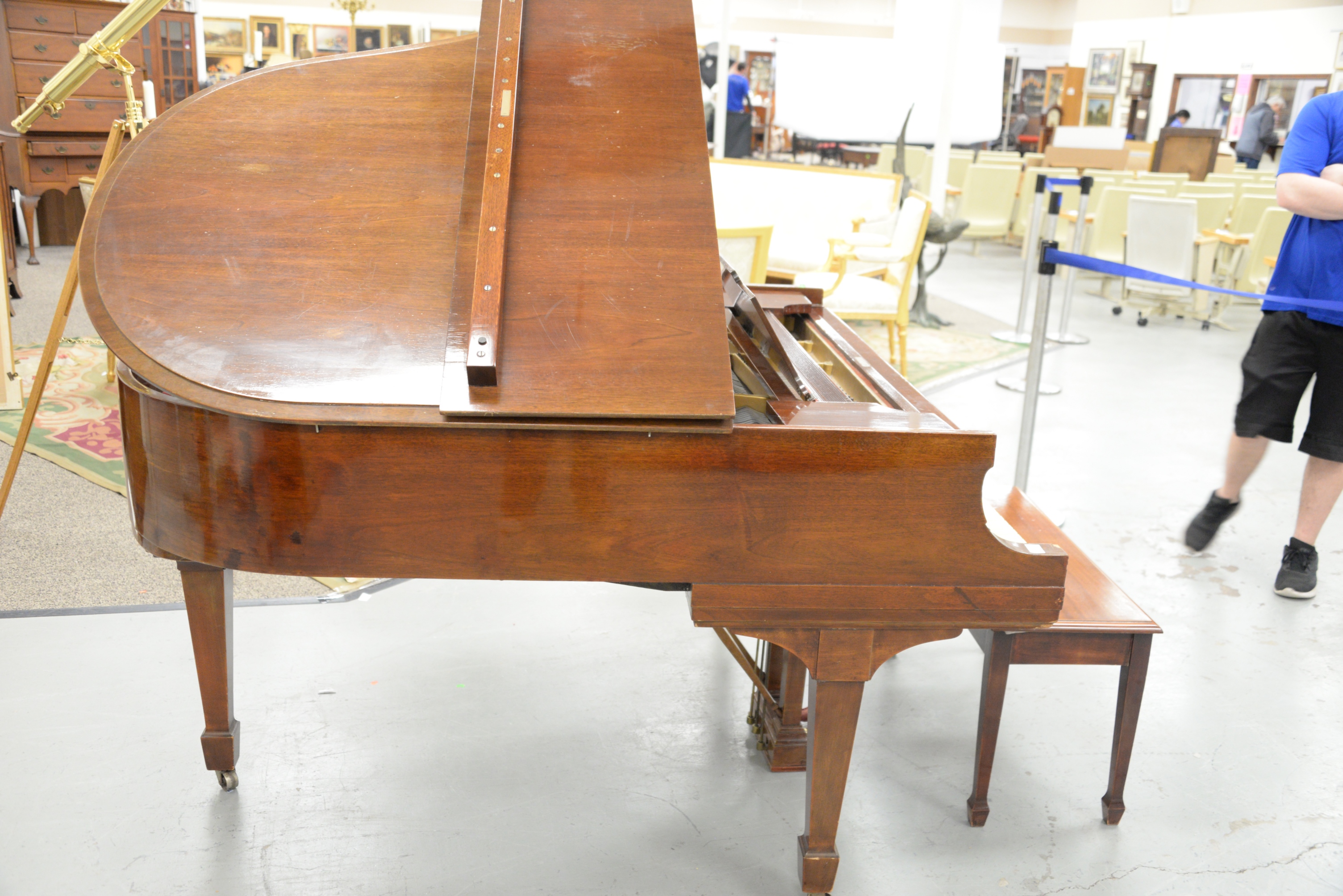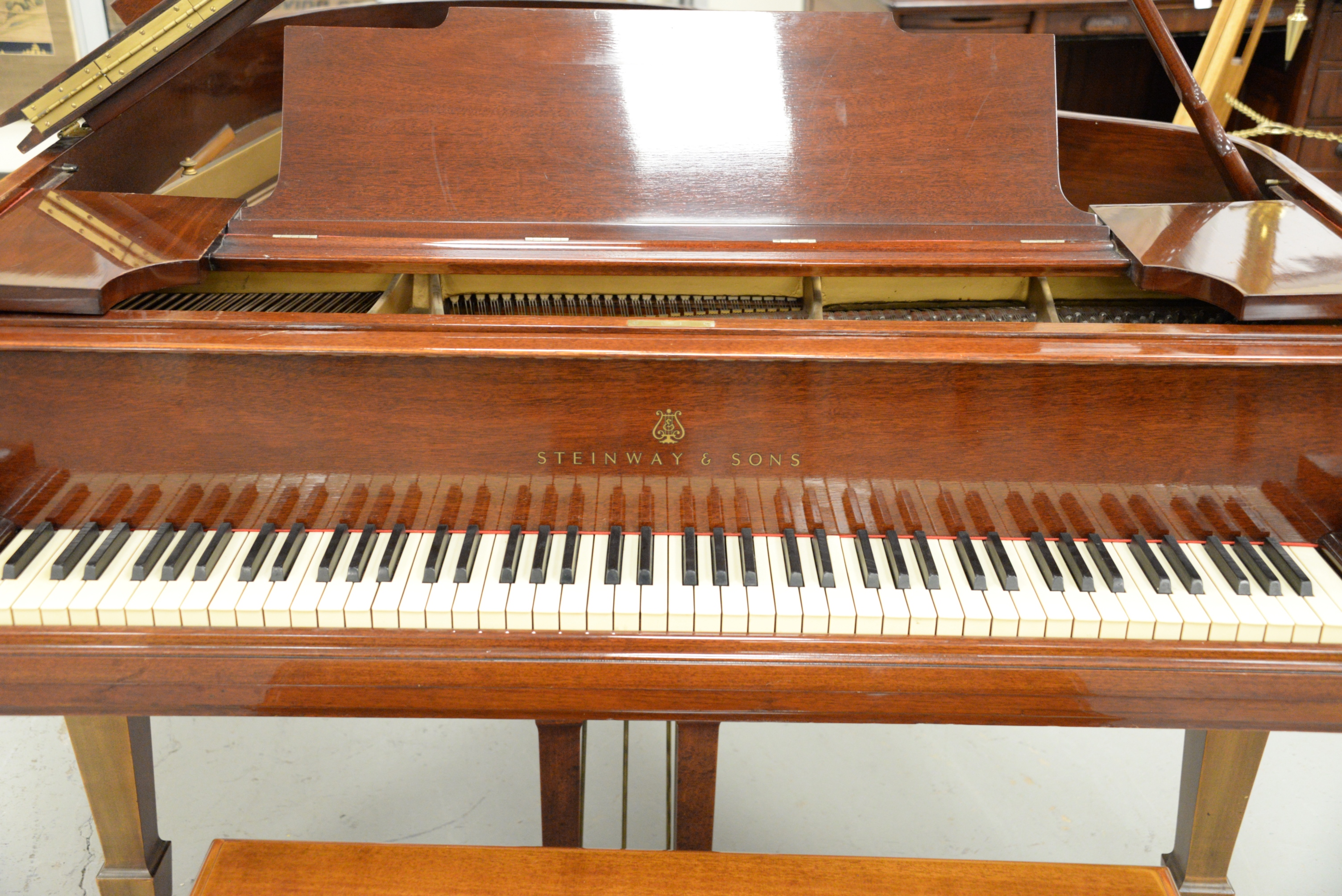Steinway & Sons Mahogany Baby Grand Piano, circa 1912, serial no. 155108, along with bench, piano height 41 inches, length 66 inches, width 56 inches.