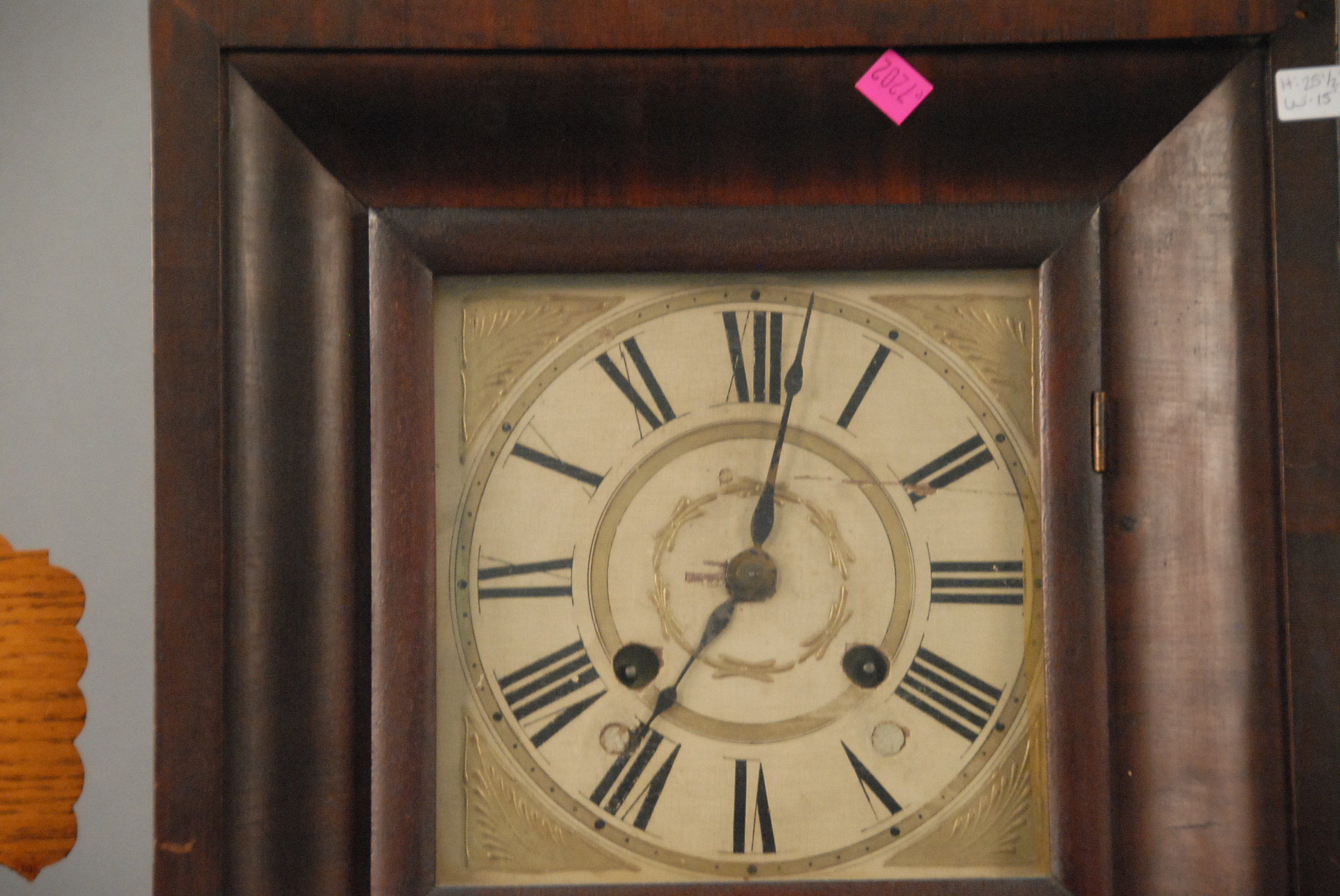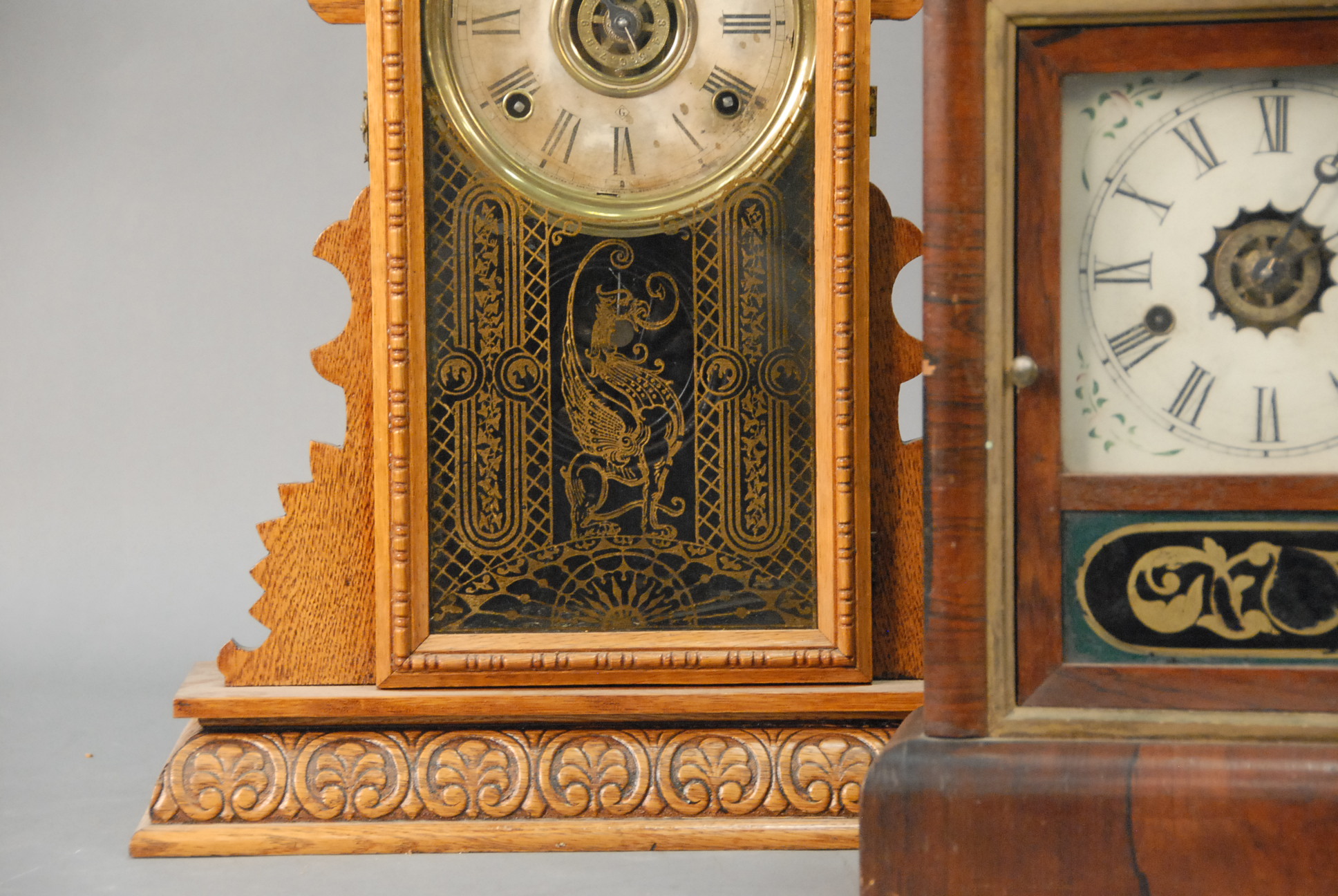 Three clocks including an ogee clock, shelf clock, and oak Victorian clock.