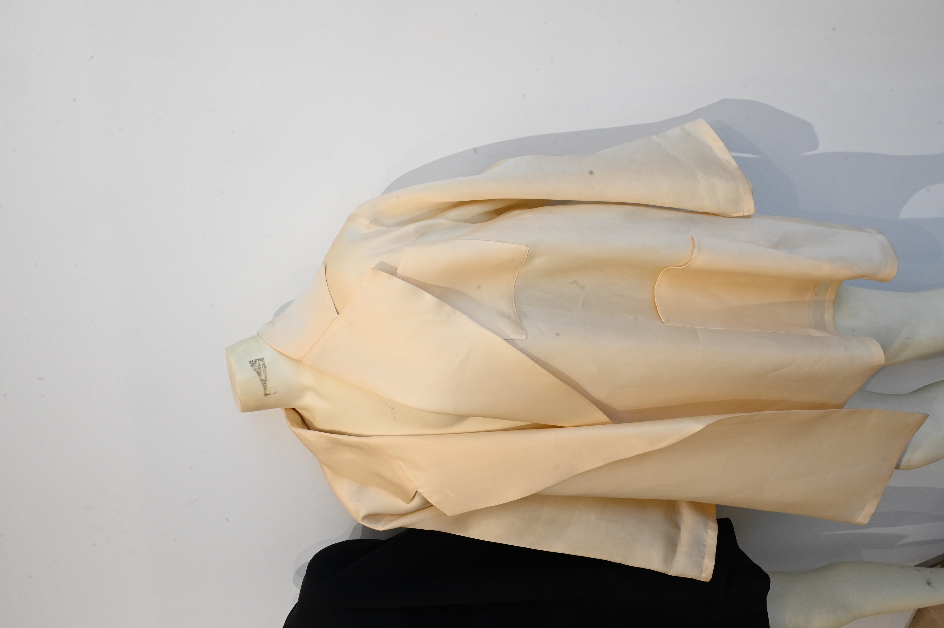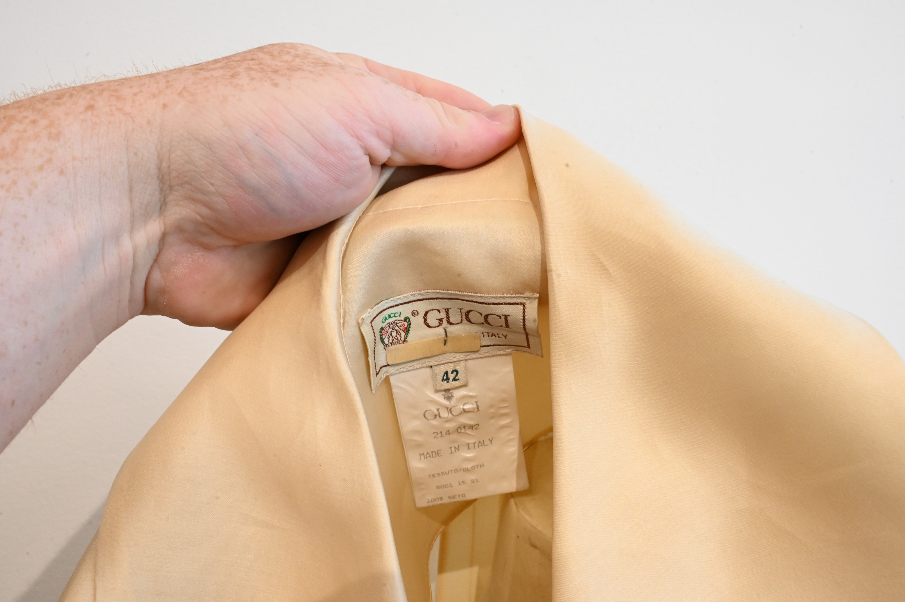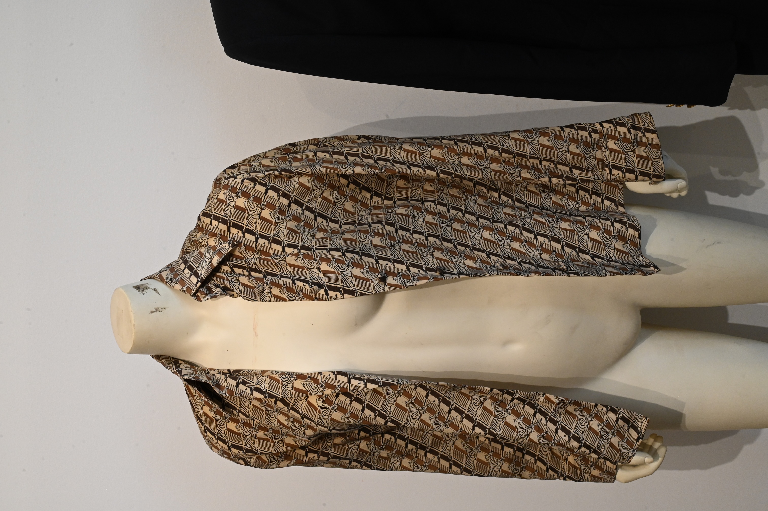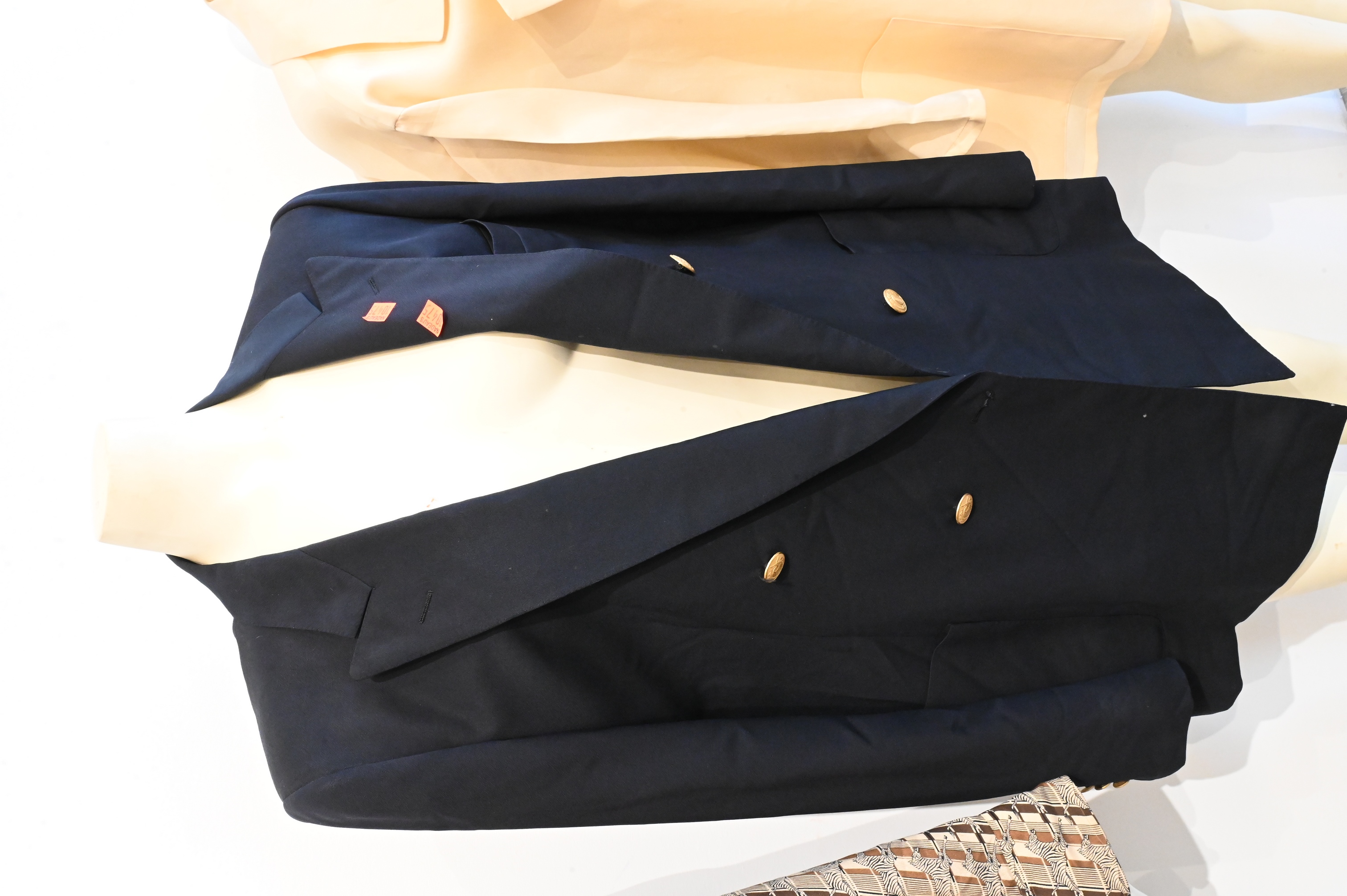 to include women’s 1970’s zebra print silk blouse size 44, cream silk blazer / suit jacket size 42, men’s wool double breasted suit jacket in navy size 54